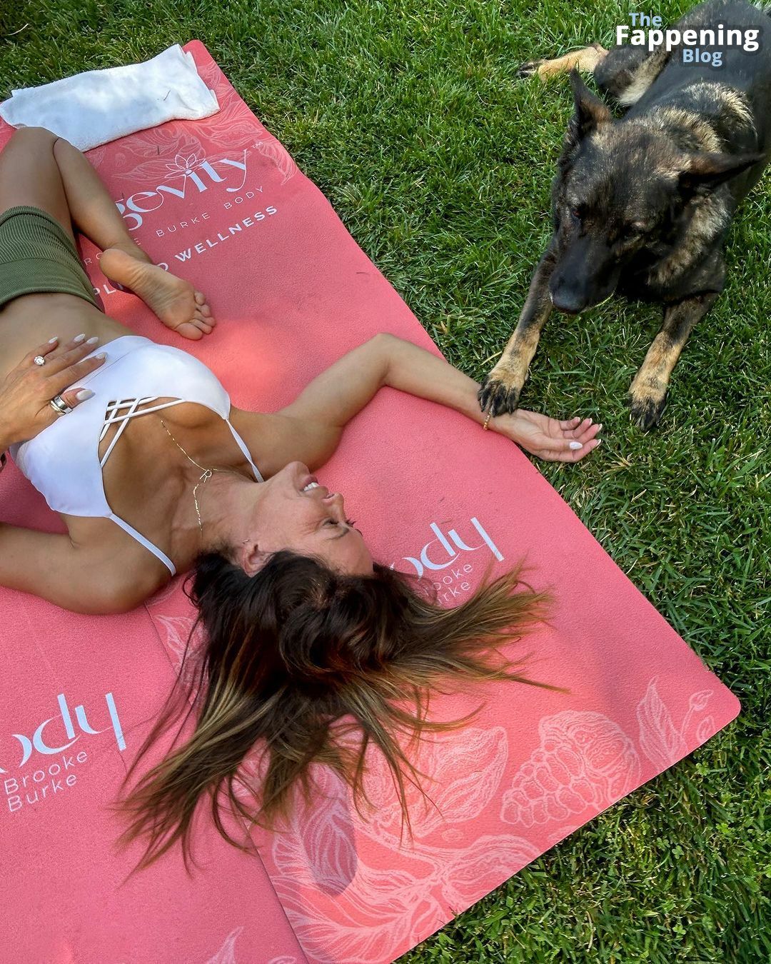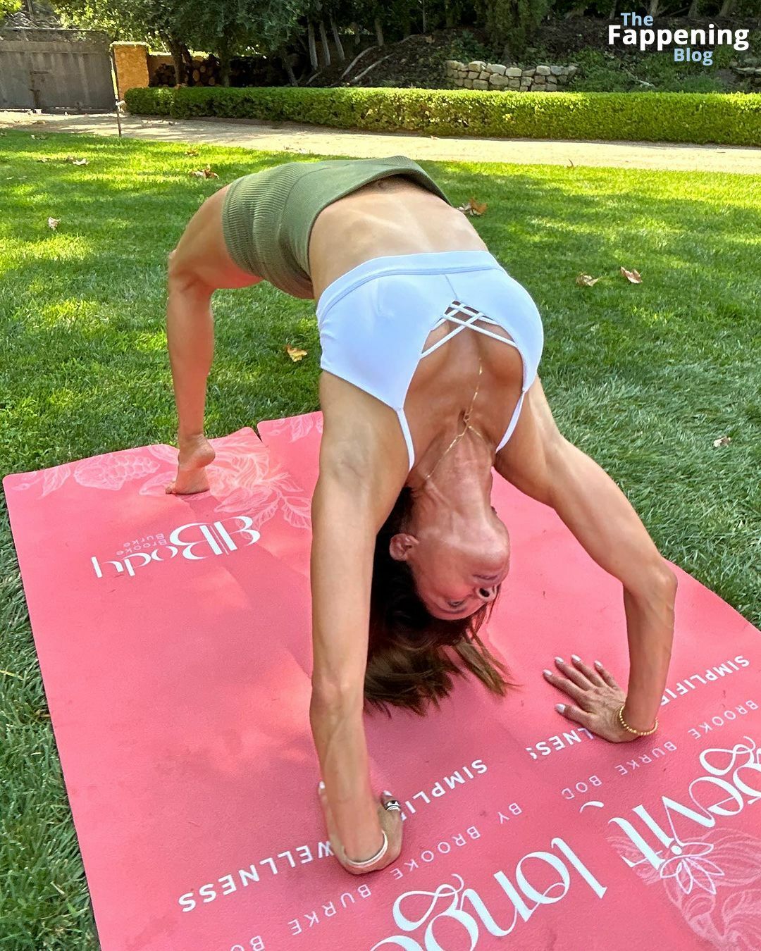 Brooke Burke está mostrando un escote impresionante con su generoso busto, junto con sus piernas ardientes, pies impresionantes y un físico MILF en forma, mientras lleva un sujetador deportivo y realiza estiramientos de yoga al aire libre.