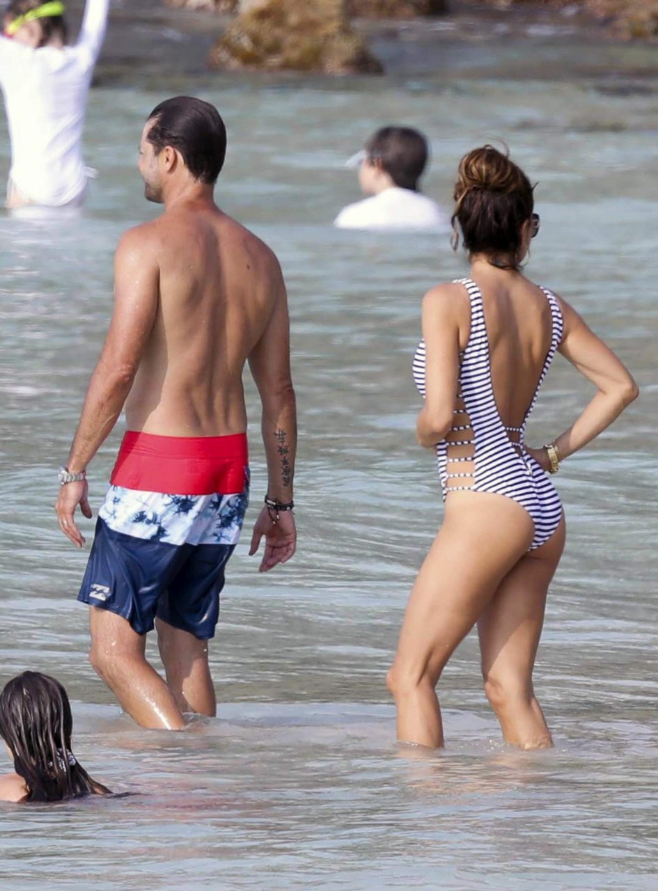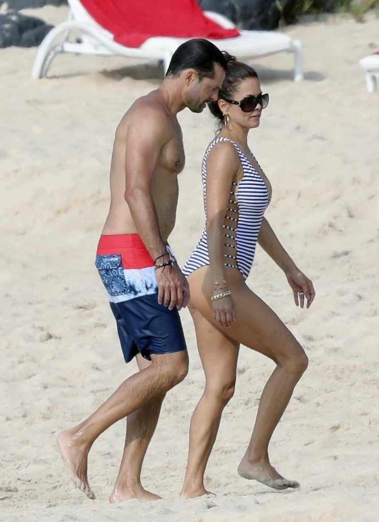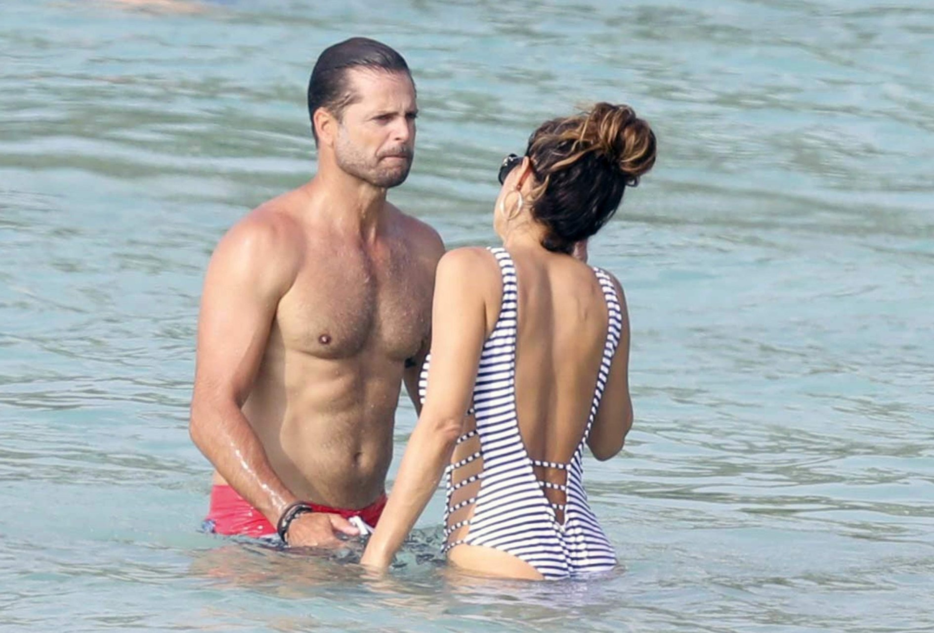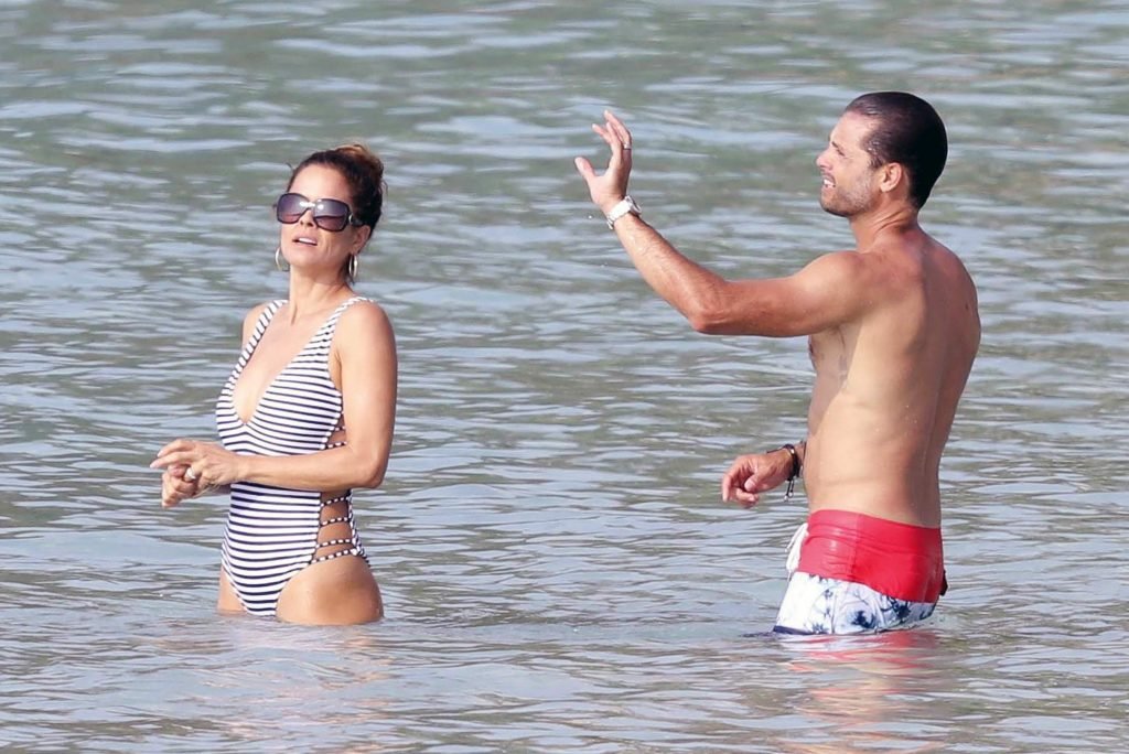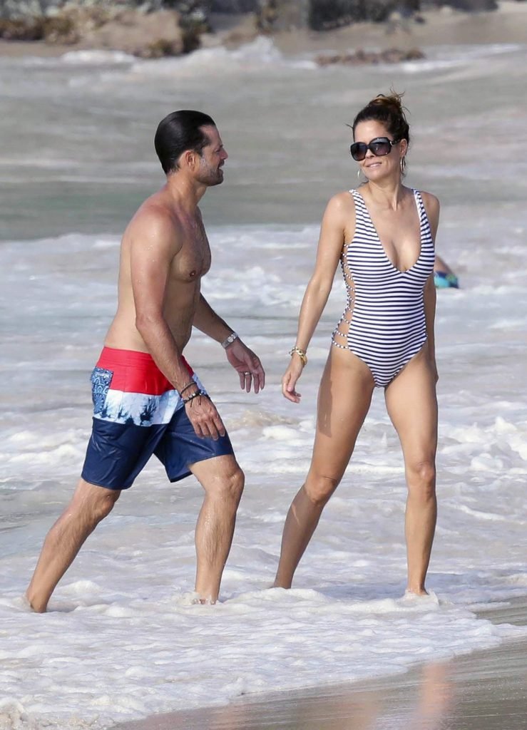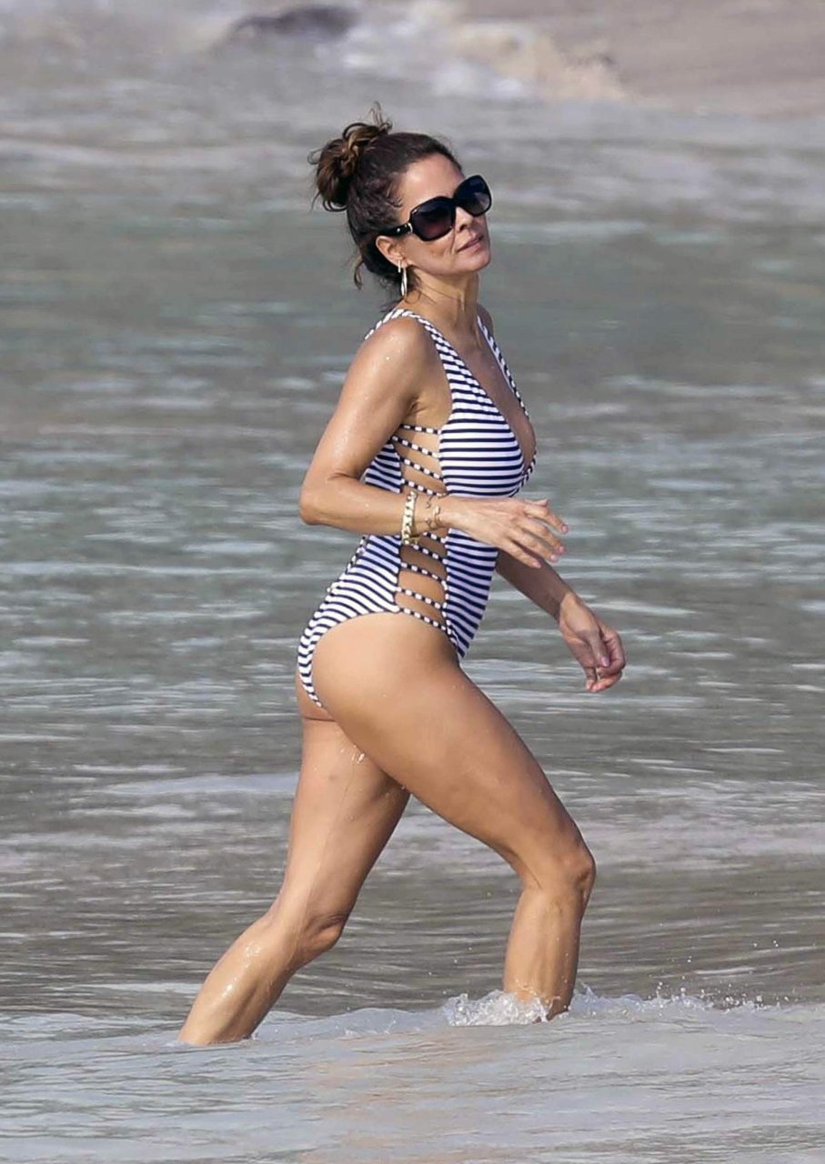 Brooke Burke lleva un traje de baño a rayas en la playa de St. Barths, 28/03/2017. Brooke Burke es una actriz estadounidense (Melissa & Joey) y modelo. Edad – 45.