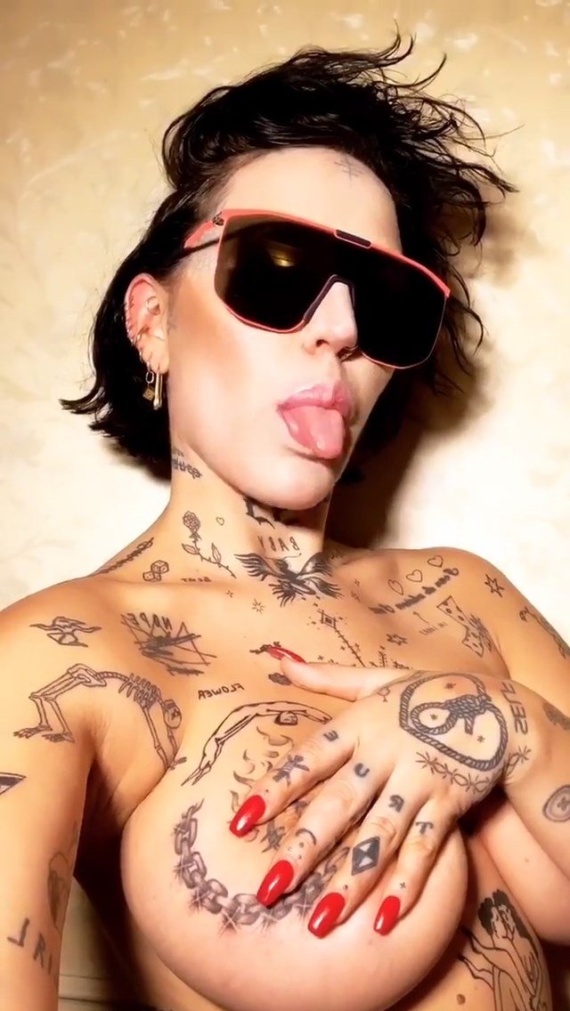 La cantante/modelo tatuada Brooke Candy se ve sexy mostrando sus tetas en las historias de Instagram (2018). ¡Es una zorra!