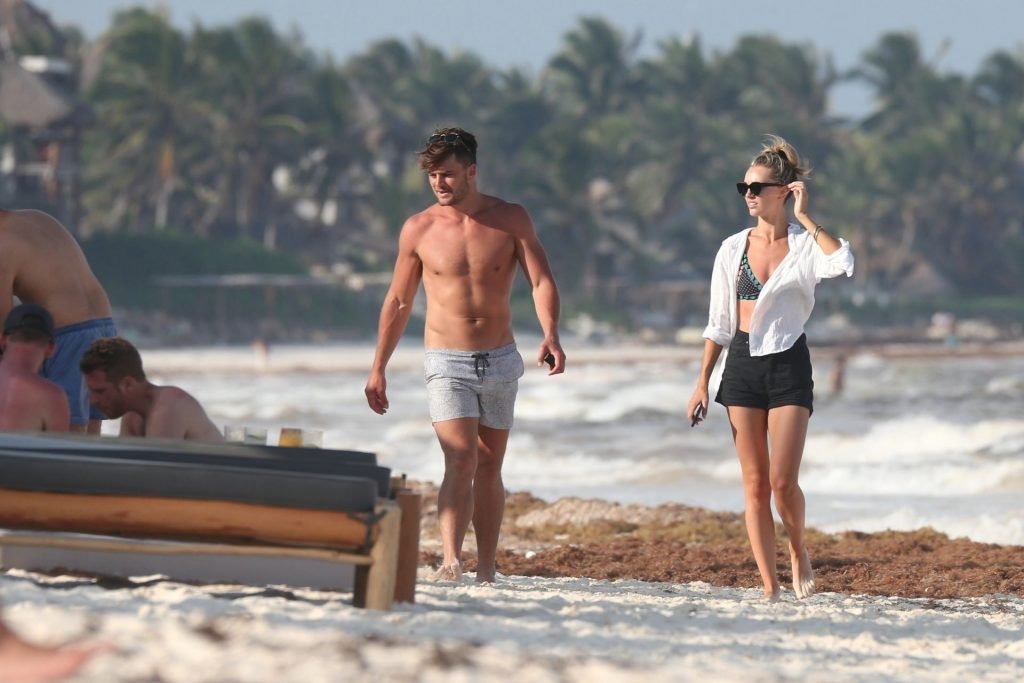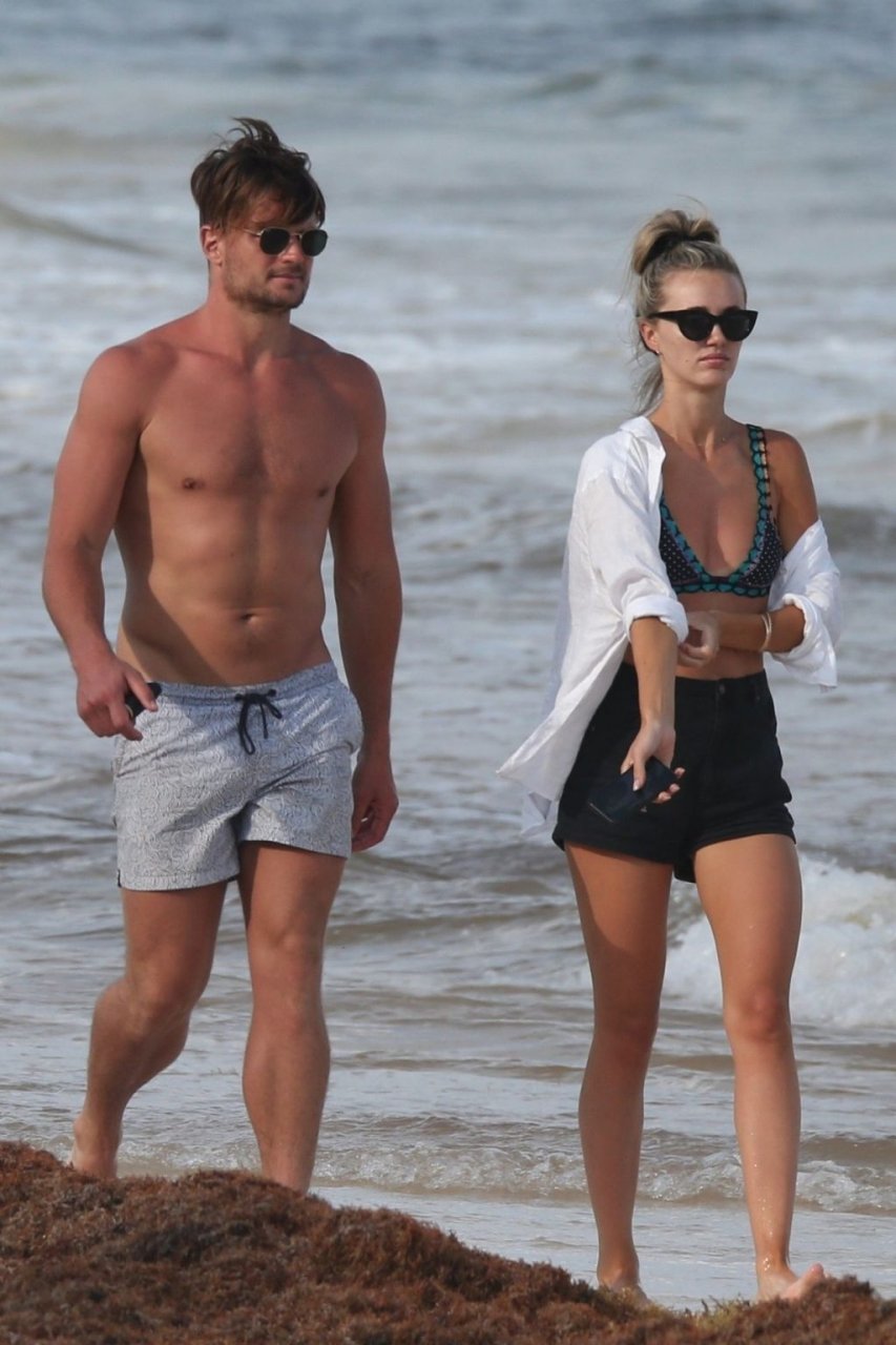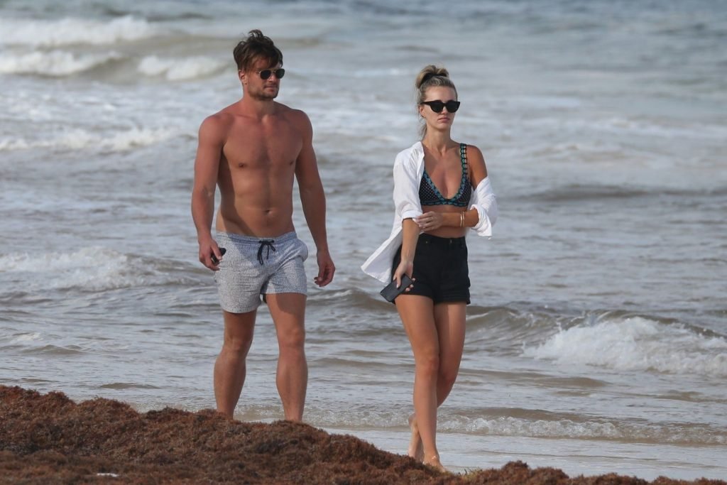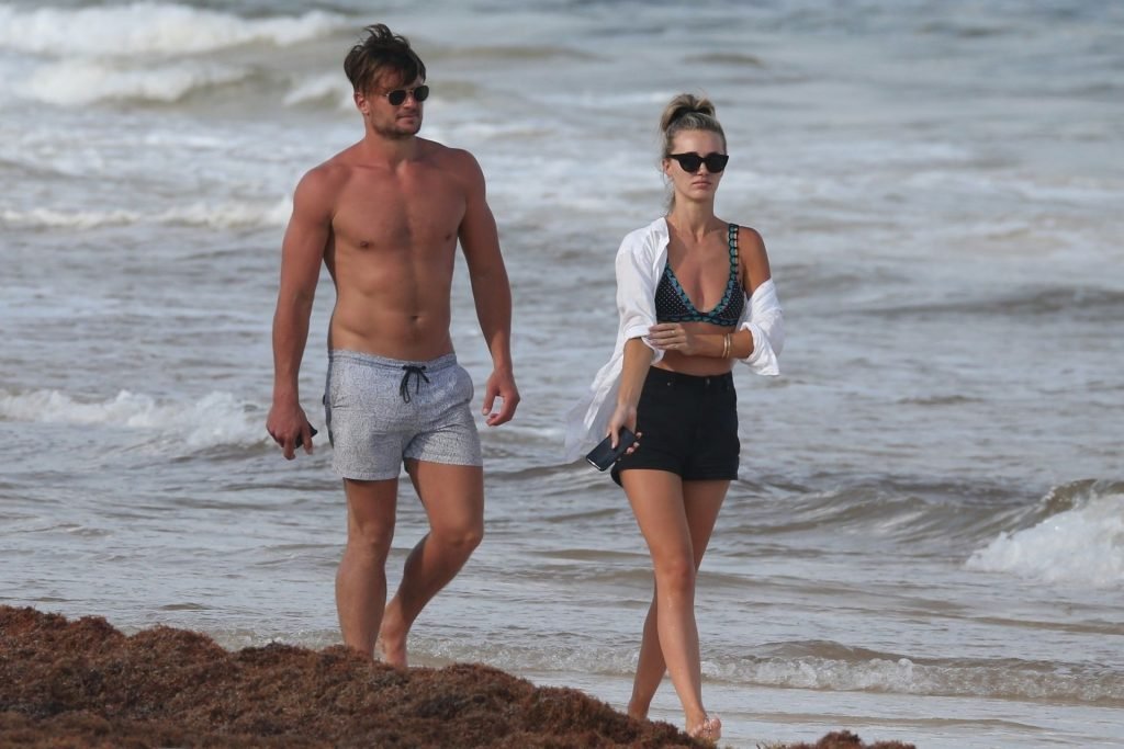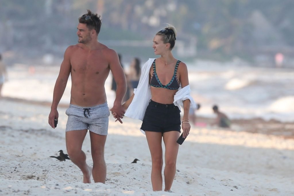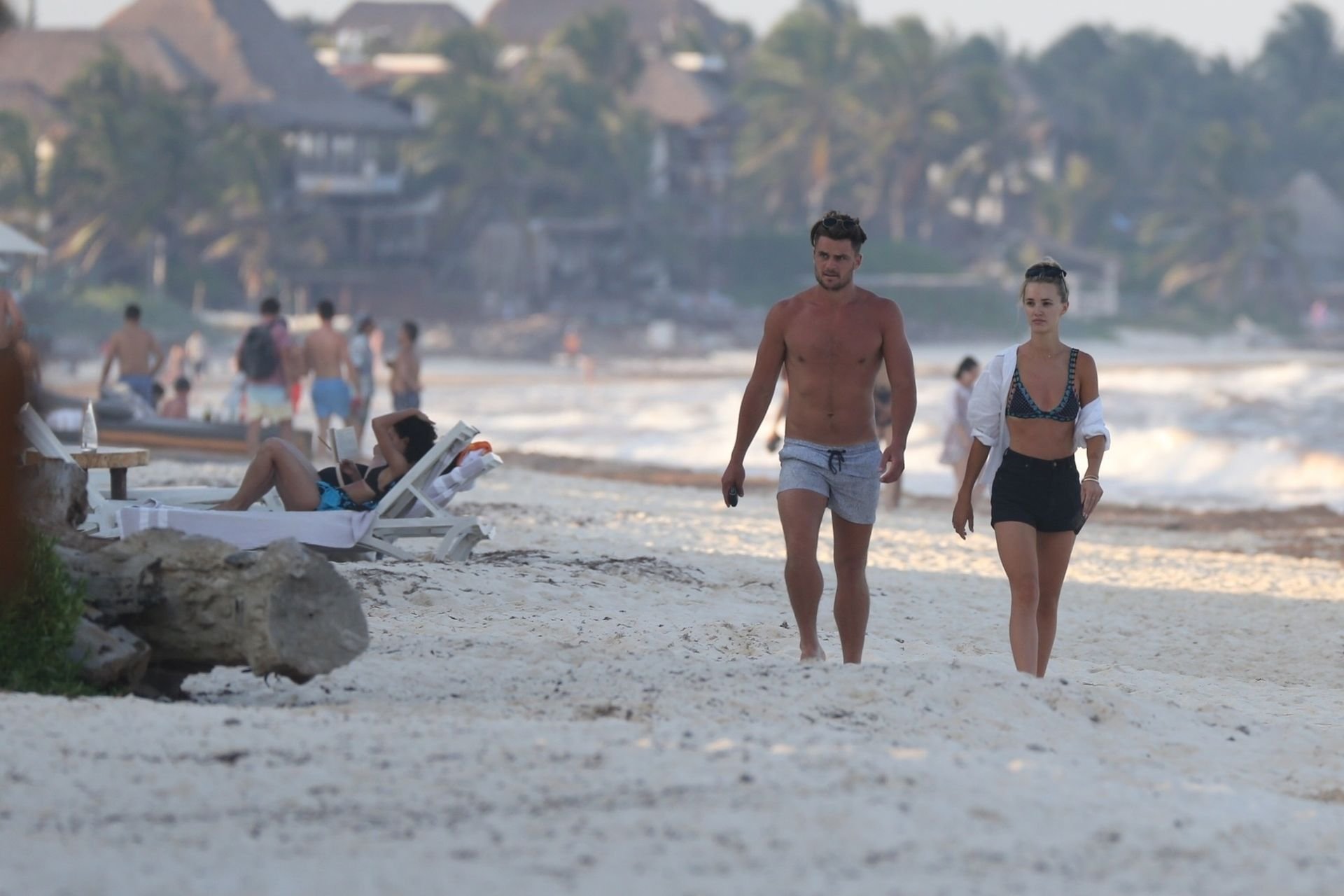 La modelo australiana Brooke Hogan y Myles Pitt caminan por la playa durante unas vacaciones juntos en Tulum, México, 21/04/2019.