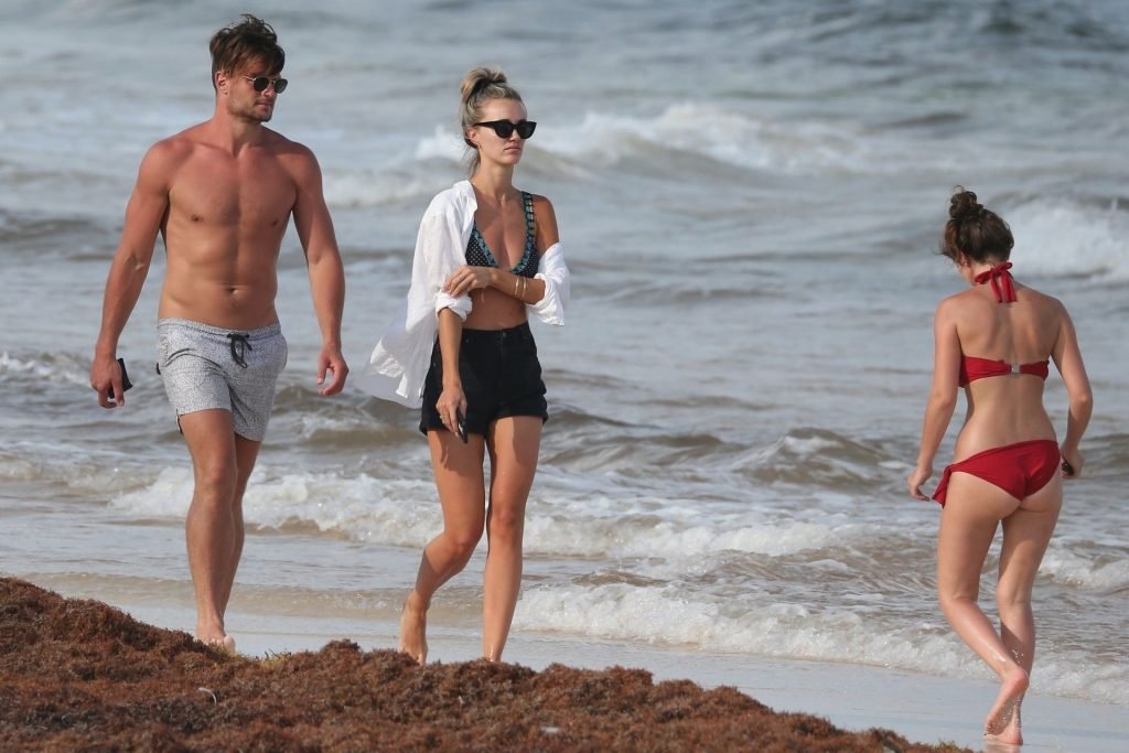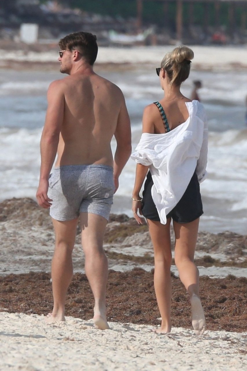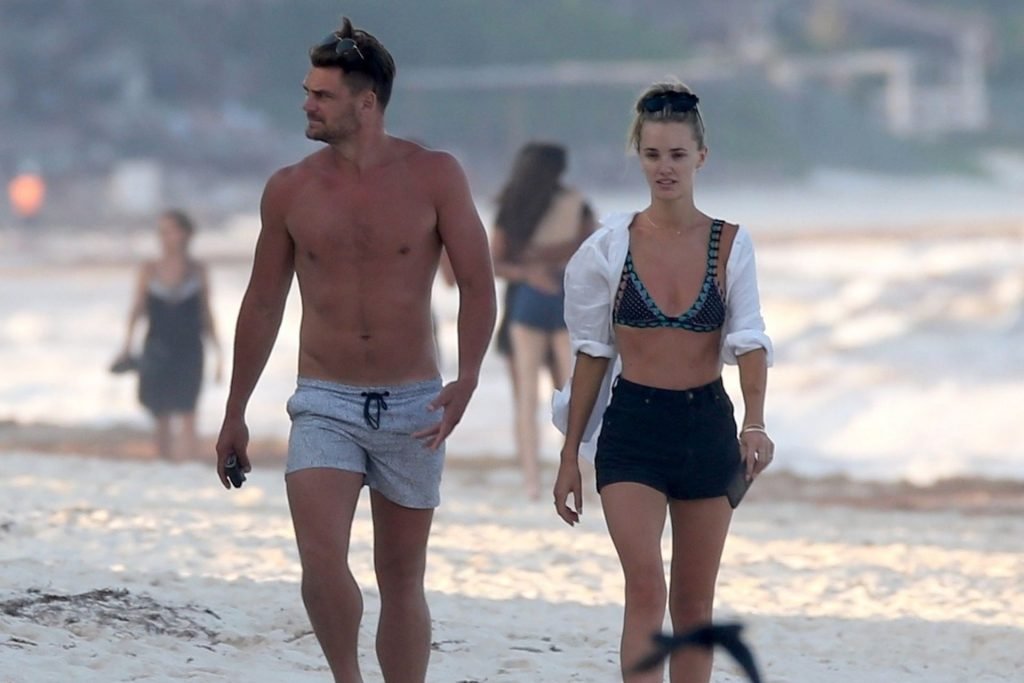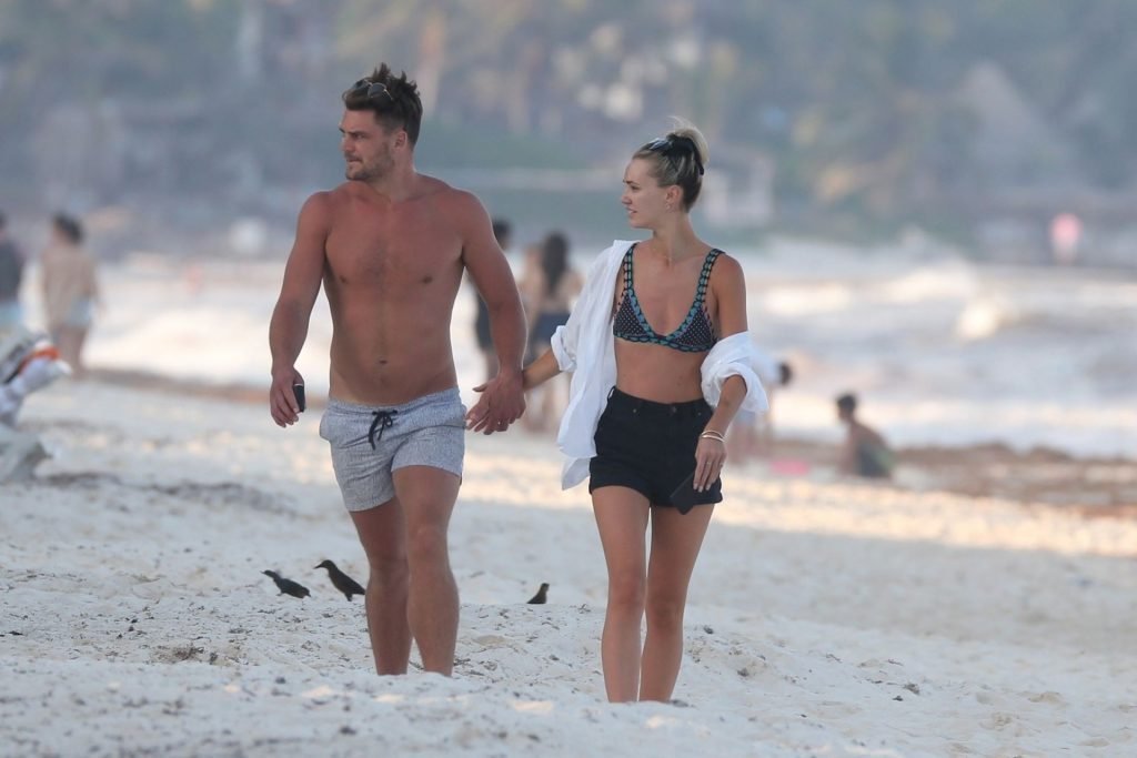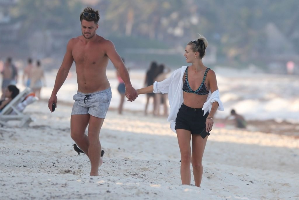 La modelo australiana Brooke Hogan y Myles Pitt caminan por la playa durante unas vacaciones juntos en Tulum, México, 21/04/2019.