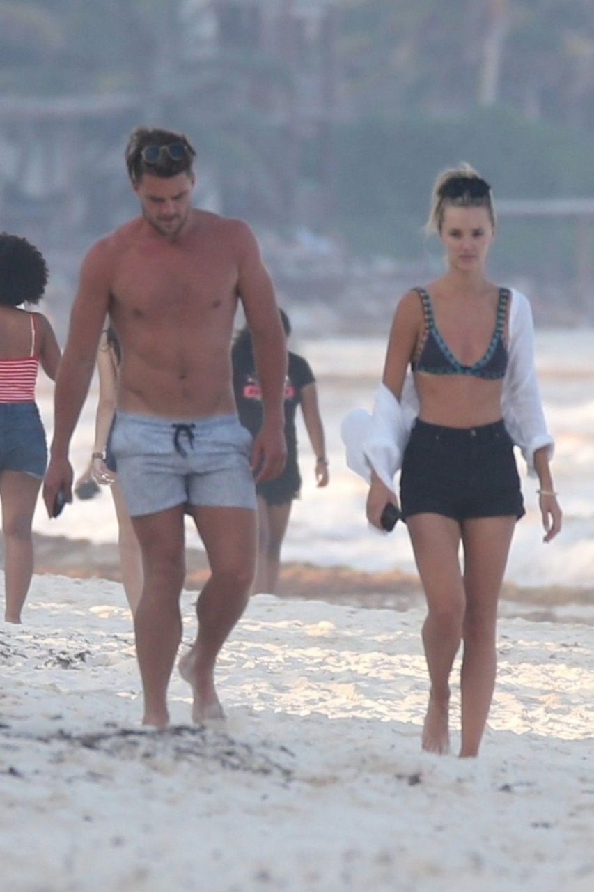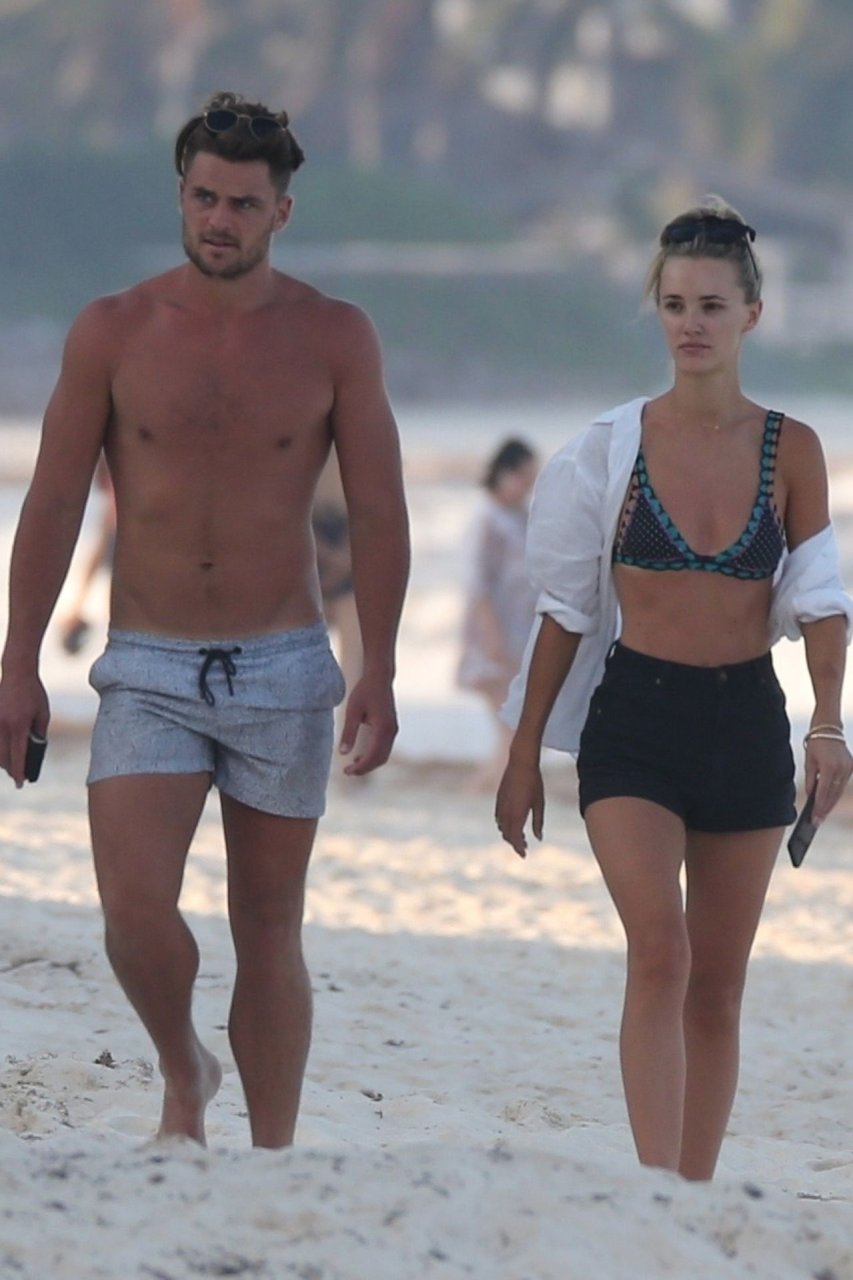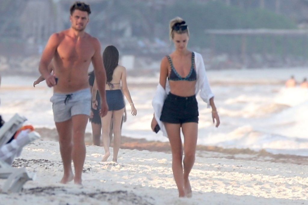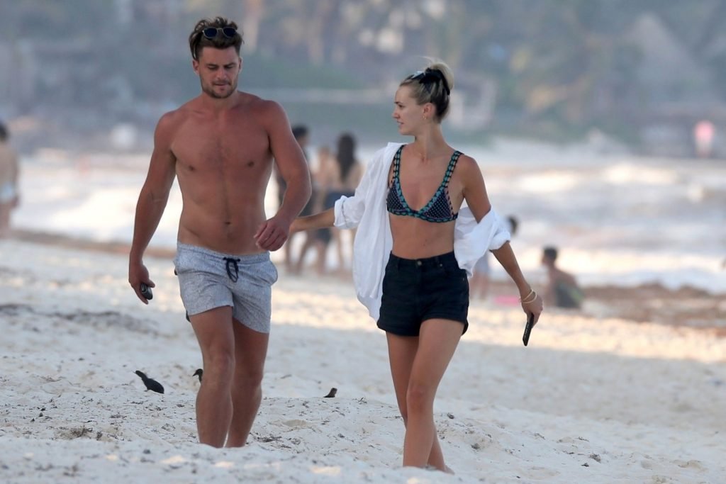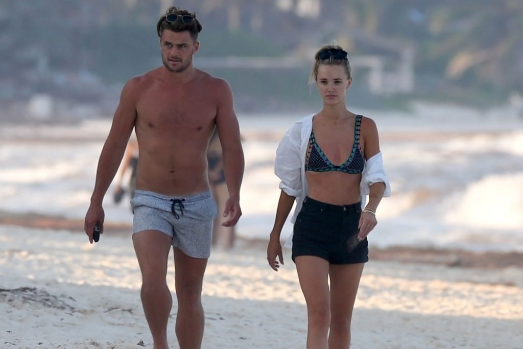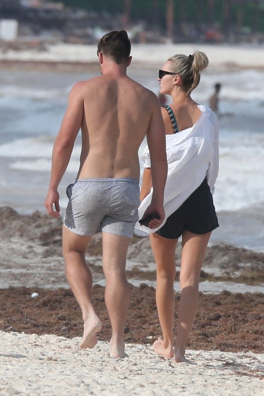 La modelo australiana Brooke Hogan y Myles Pitt caminan por la playa durante unas vacaciones juntos en Tulum, México, 21/04/2019.