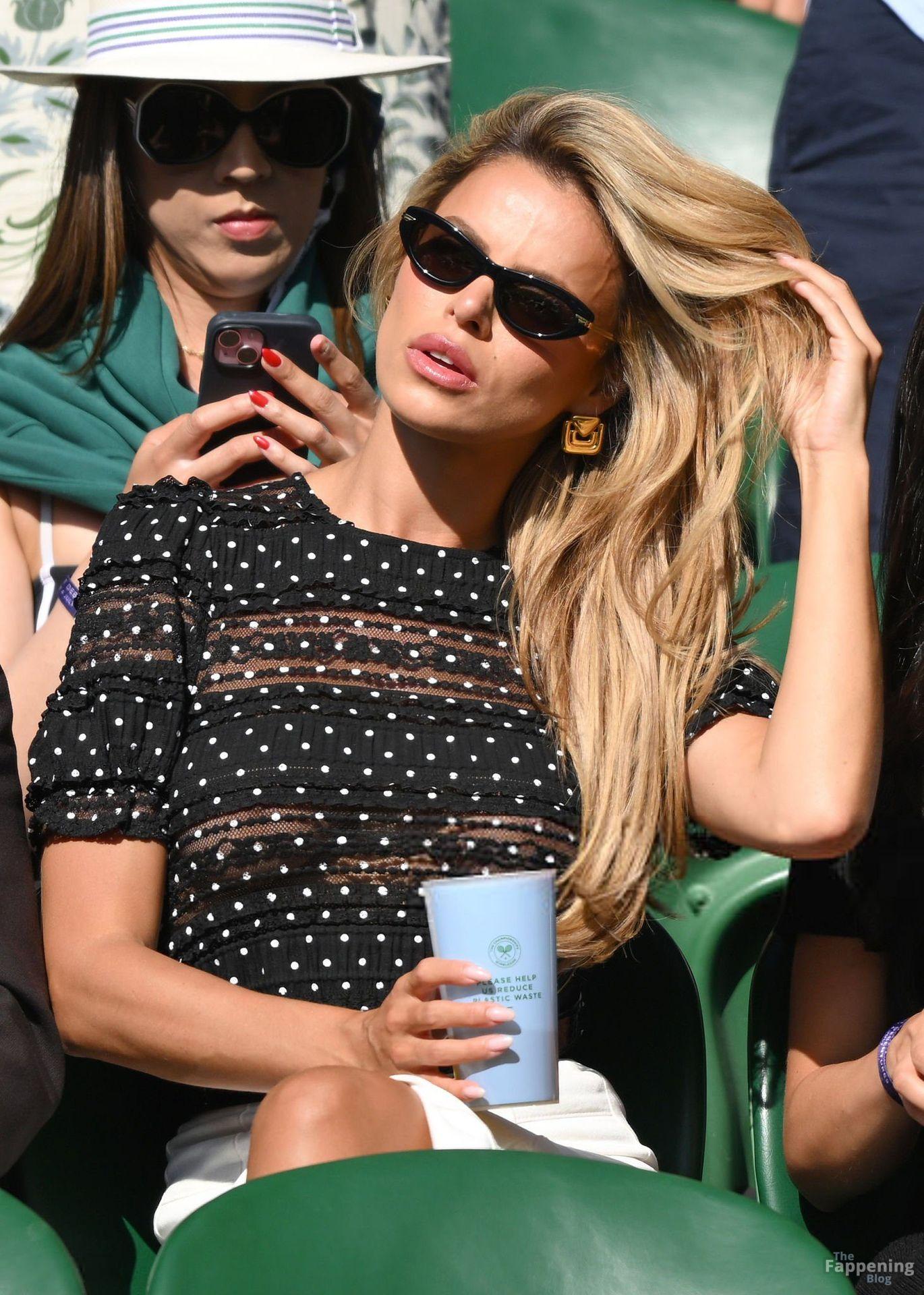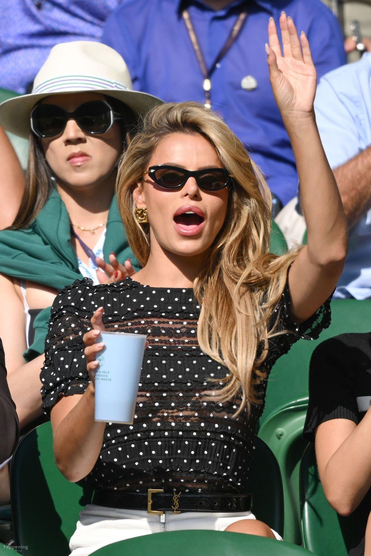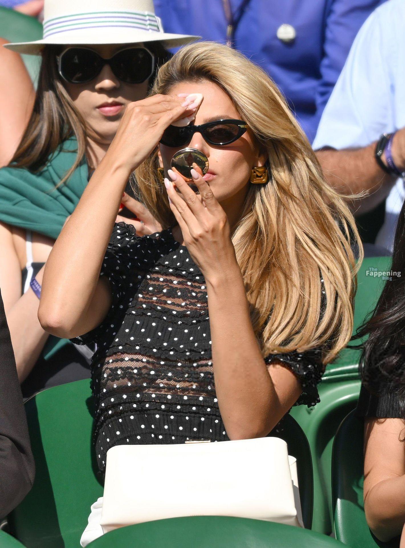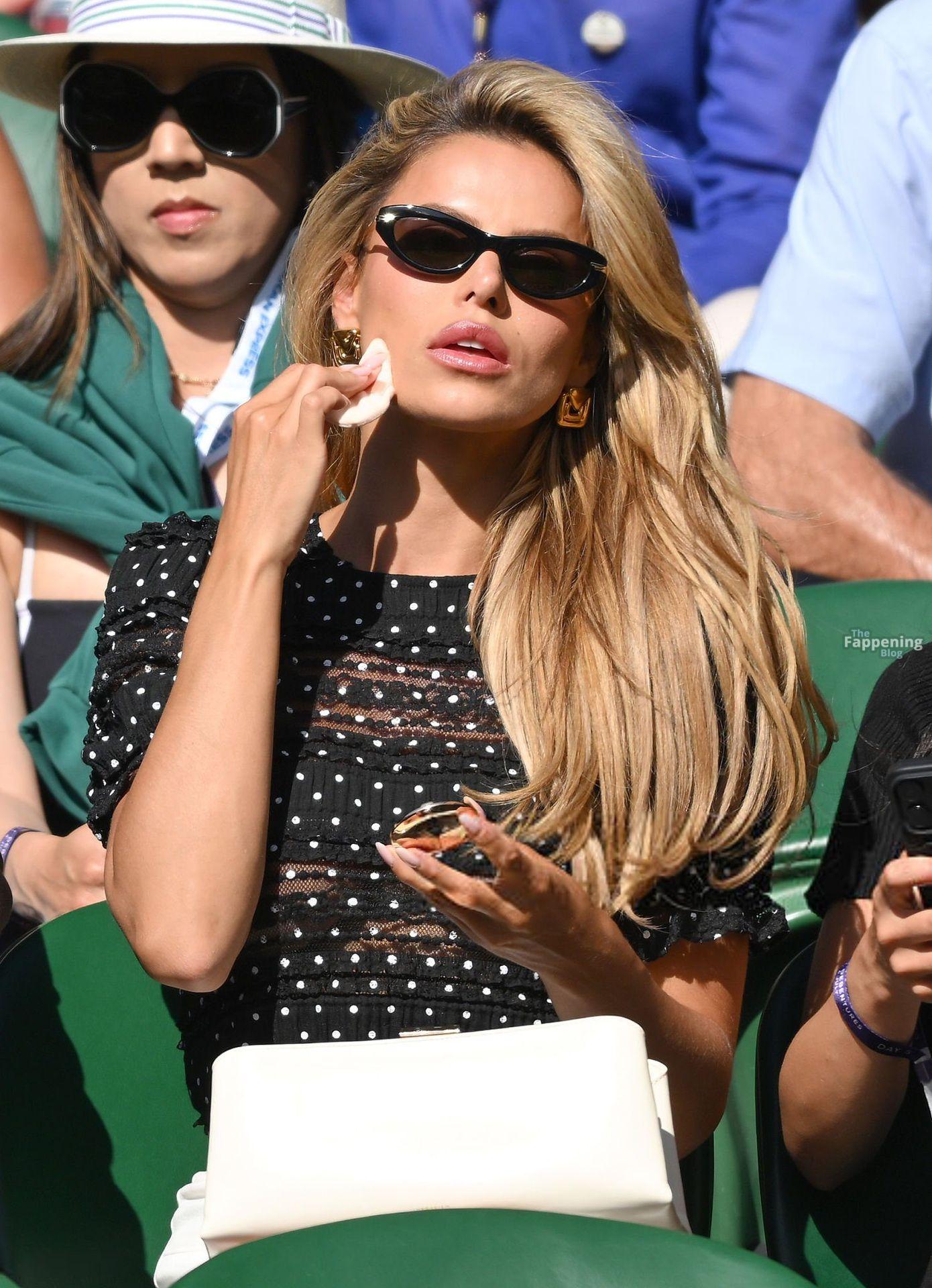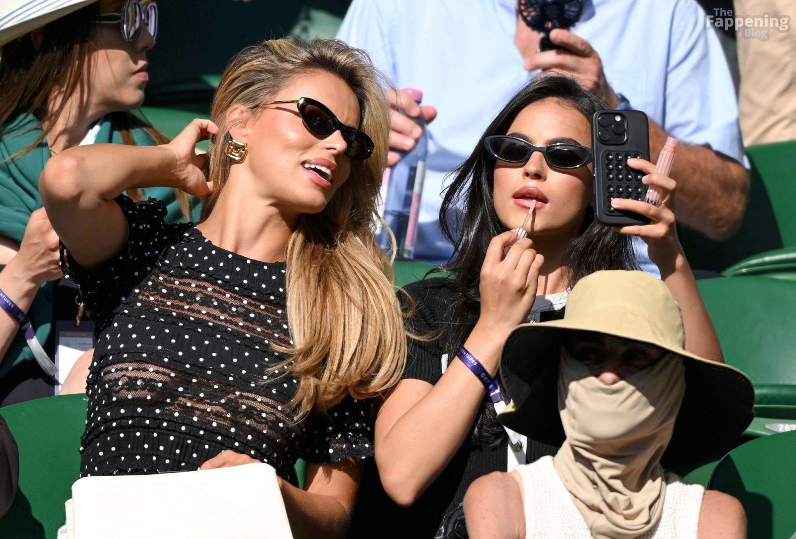Model Brooks Nader hizo que el Día Cinco de Wimbledon fuera toda una escena, luciendo una blusa negra transparente con lunares sin nada debajo.
