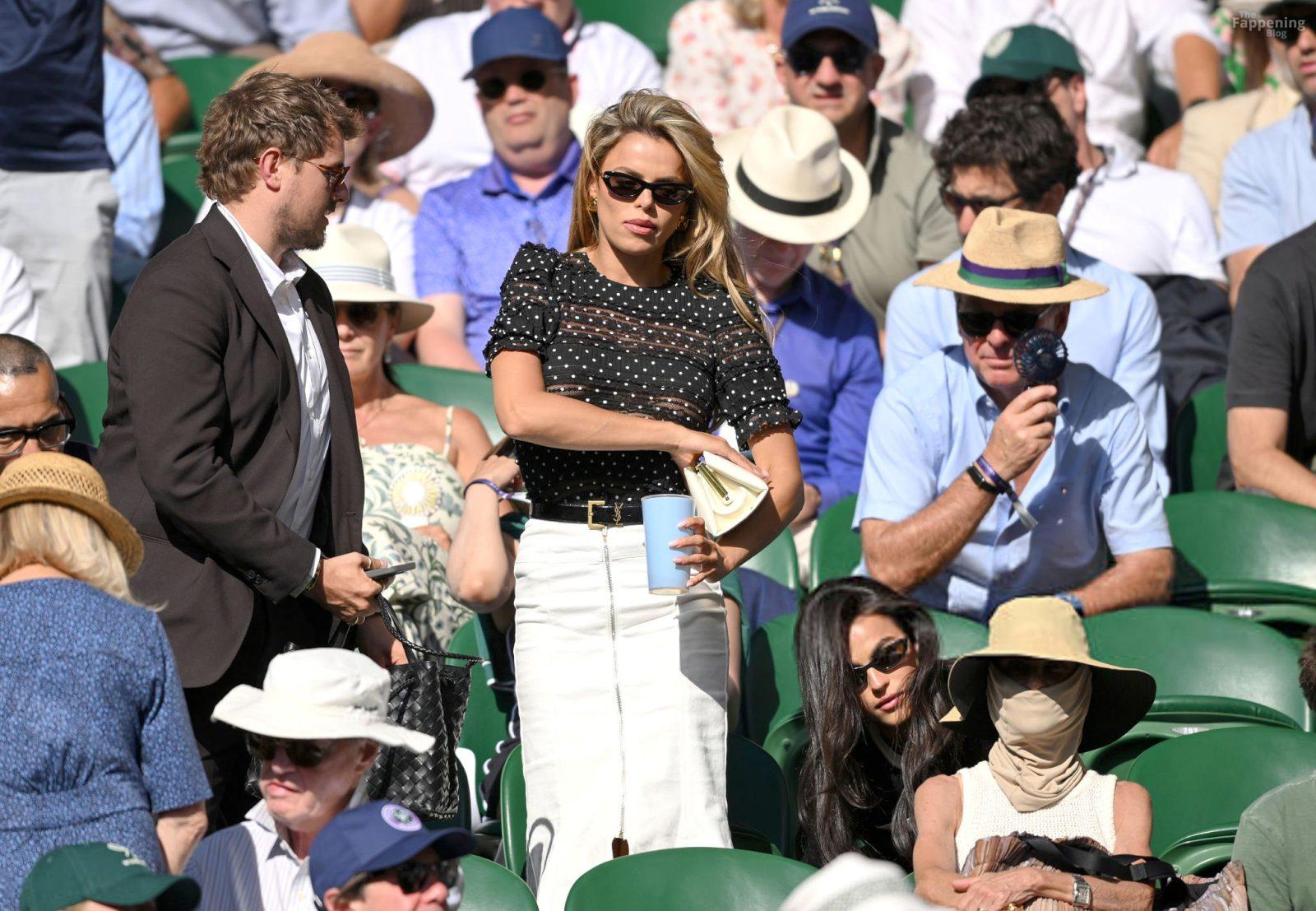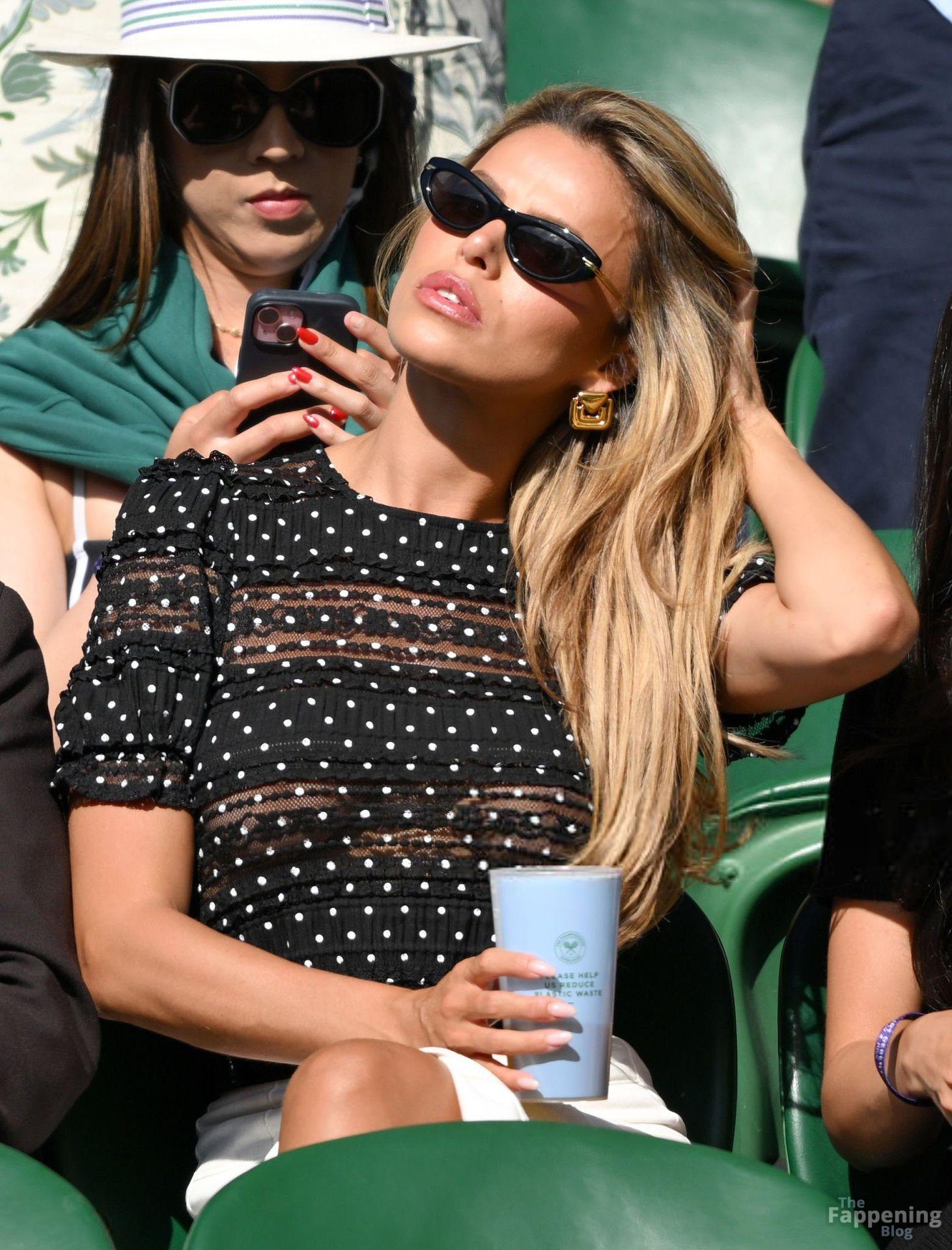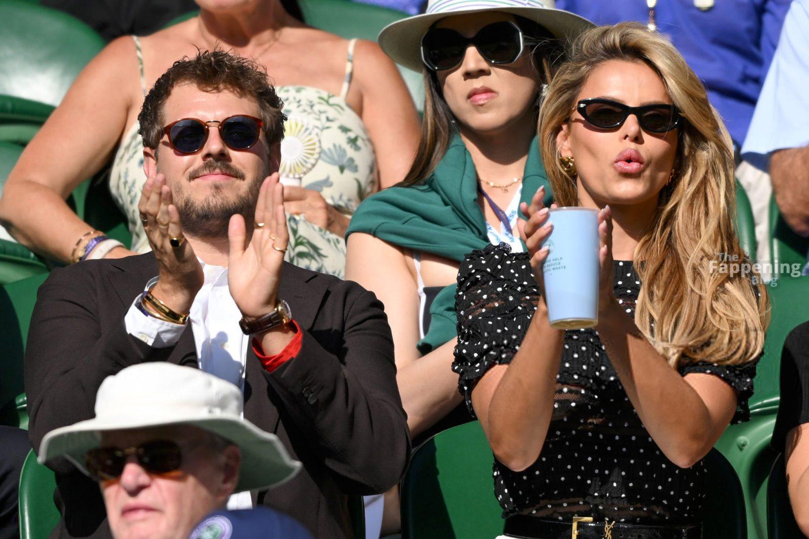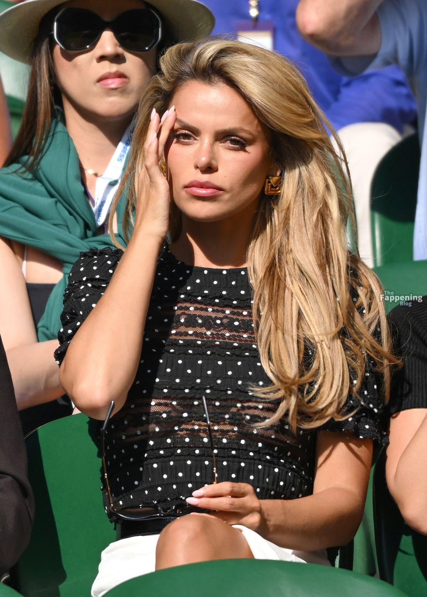 Model Brooks Nader hizo que el Día Cinco de Wimbledon fuera toda una escena, luciendo una blusa negra transparente con lunares sin nada debajo.