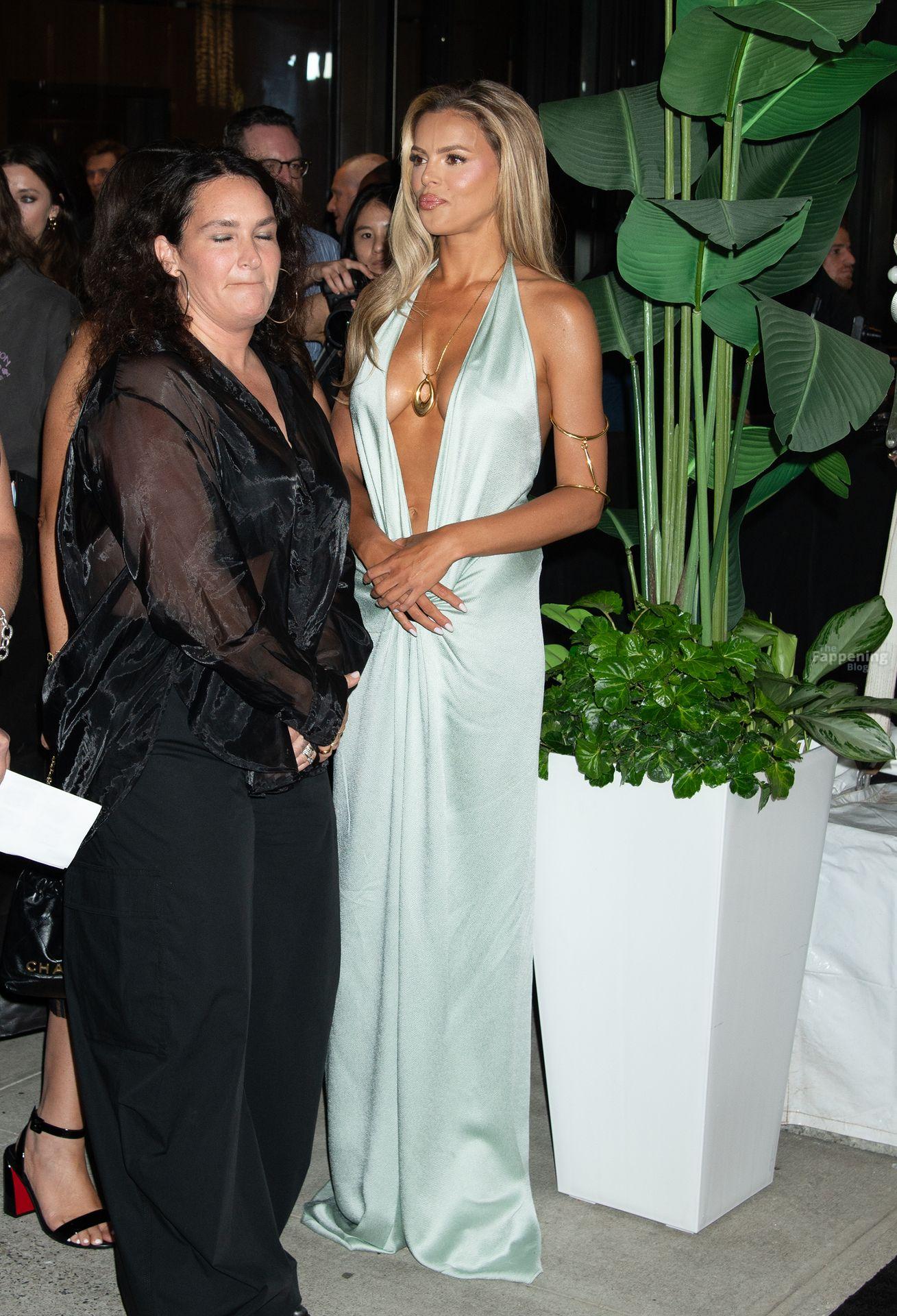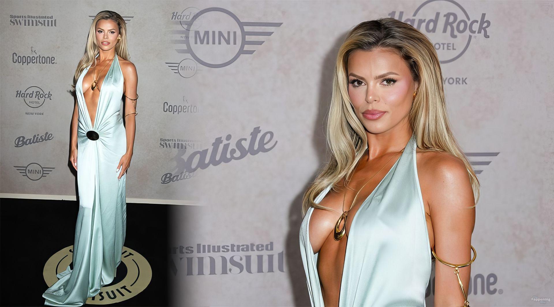 La modelo Brooks Nader estuvo en el lanzamiento de SI Swimsuit 2025 en Nueva York, luciendo un vestido de satén que resaltaba sus pechos.