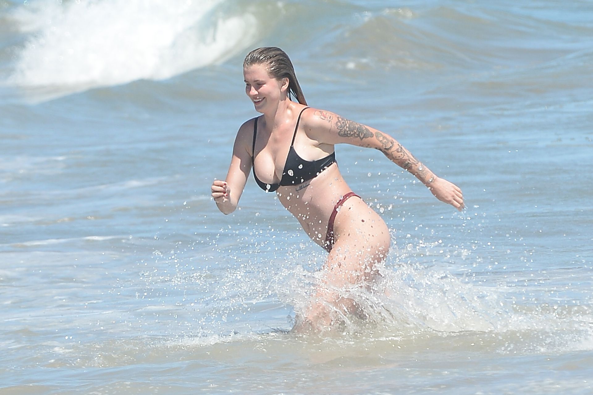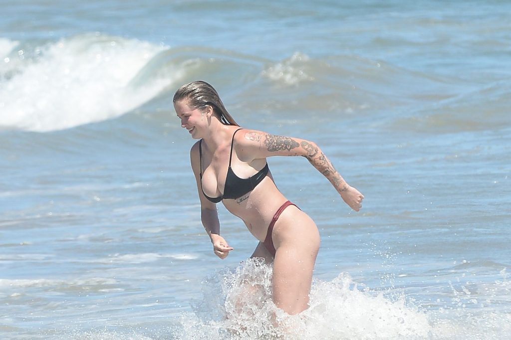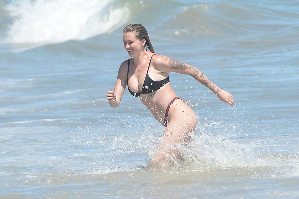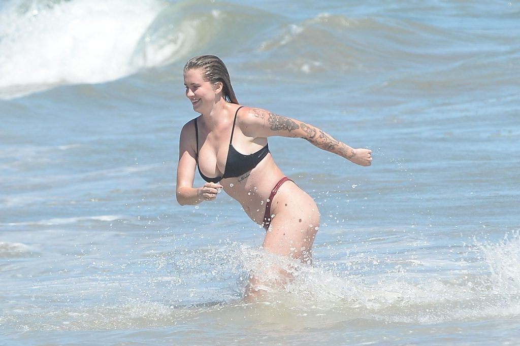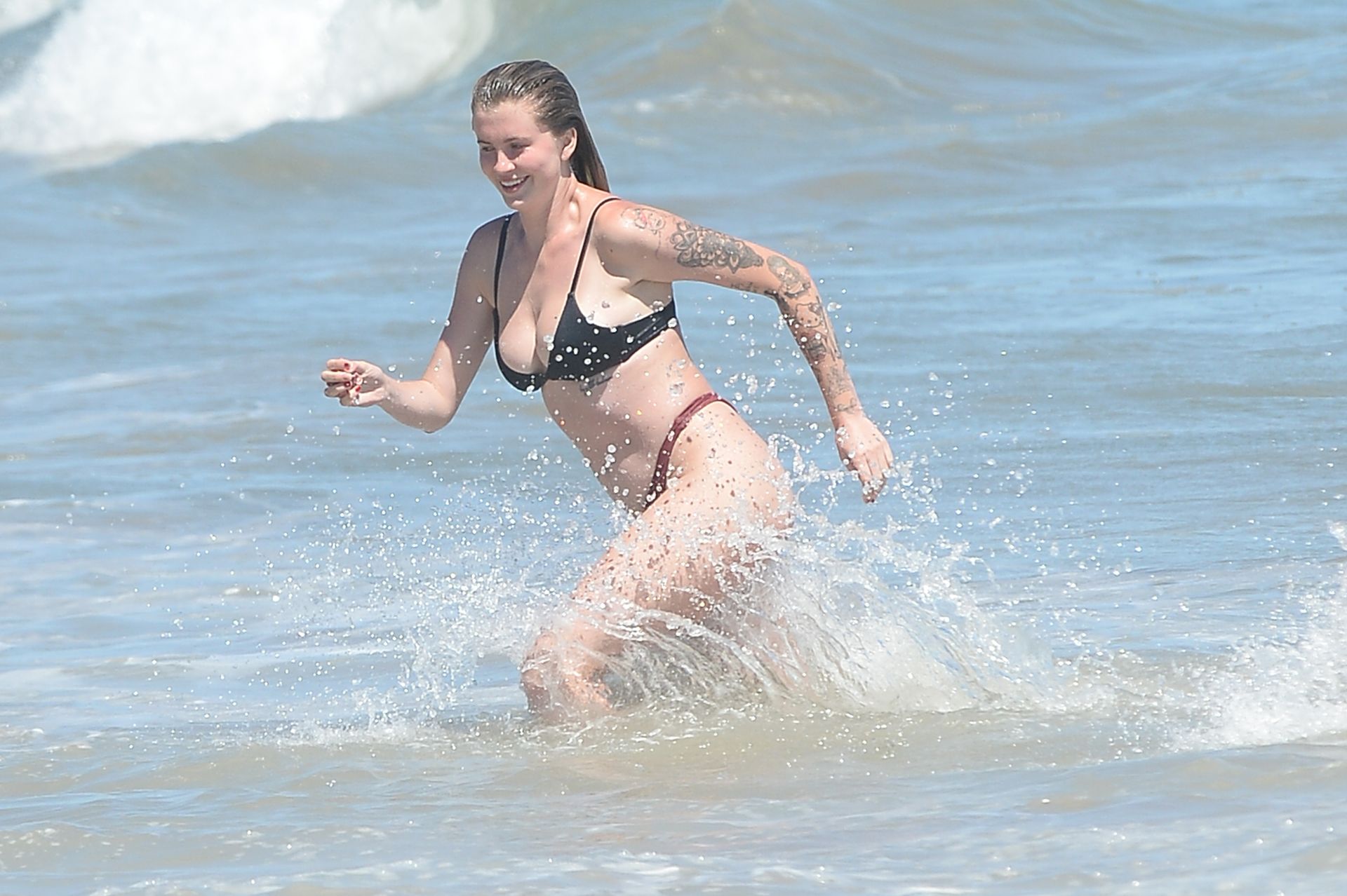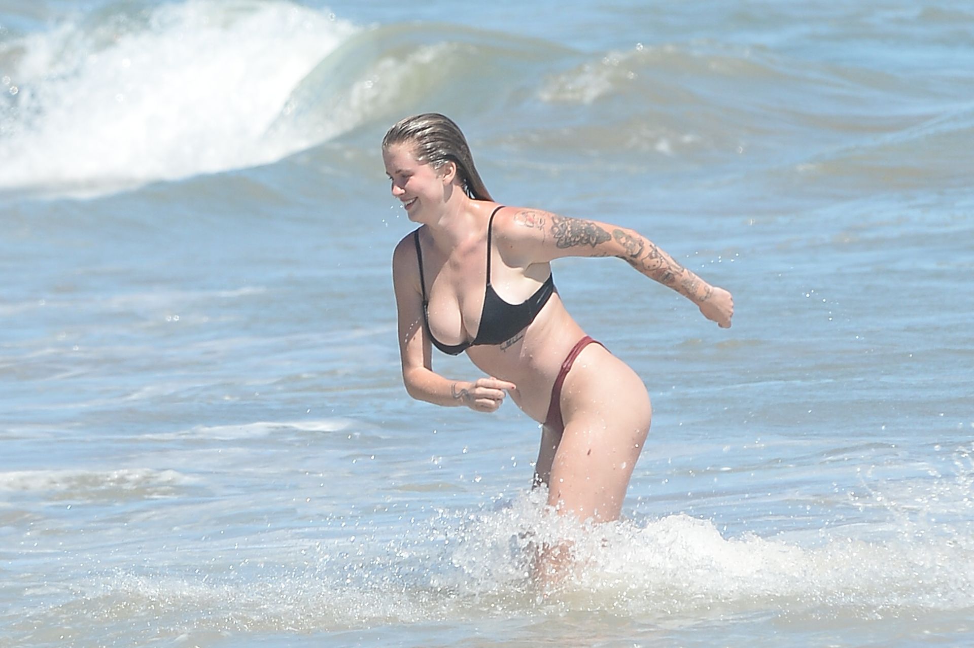 Ireland Baldwin es fotografiada disfrutando de un día en la playa en Malibu con amigos, 17/07/2020. La modelo de 24 años se metió al océano para nadar con un bikini negro de dos piezas.