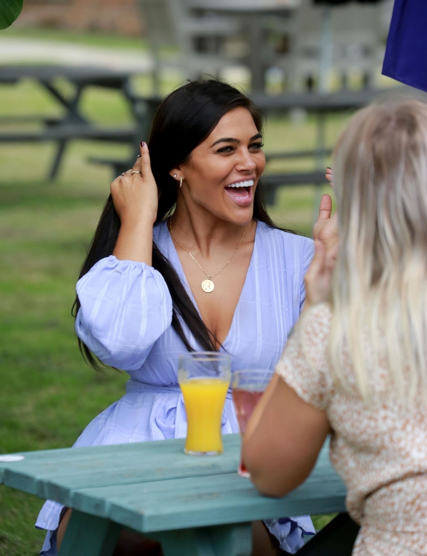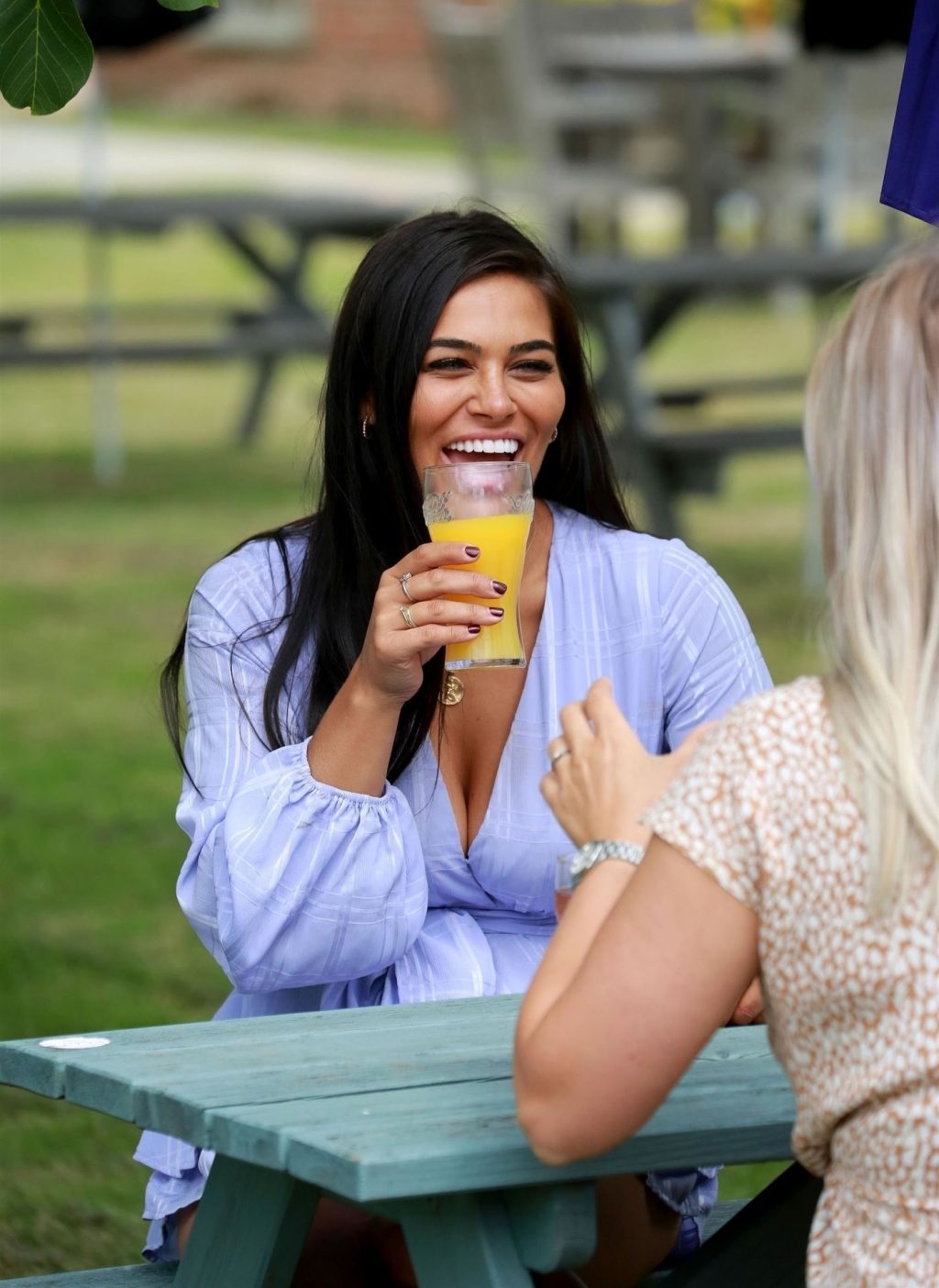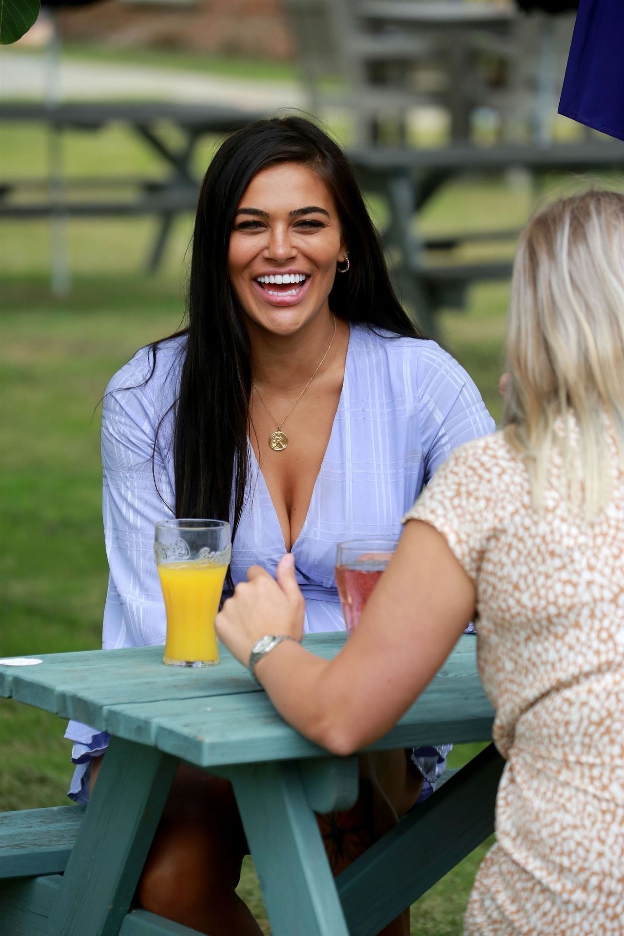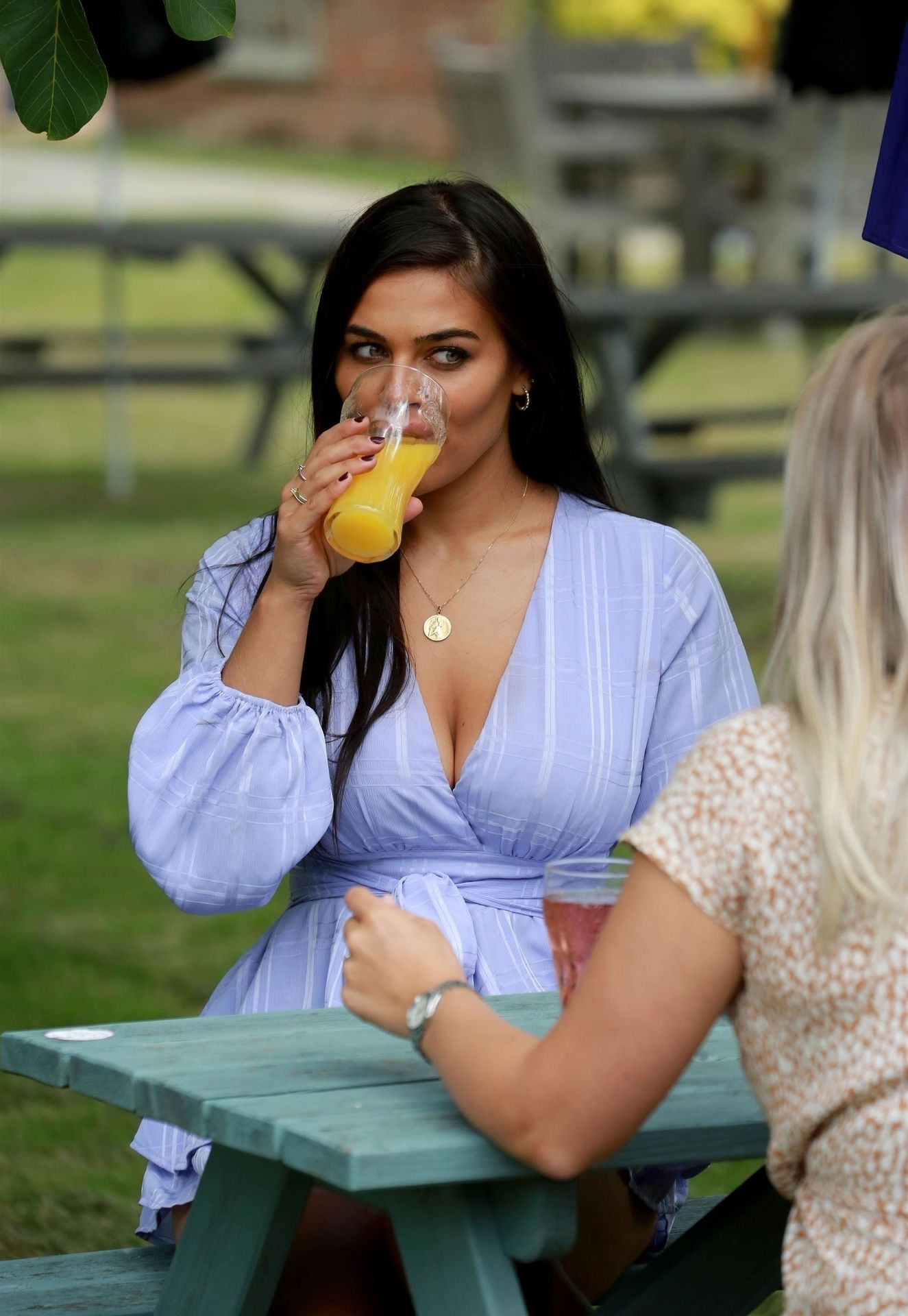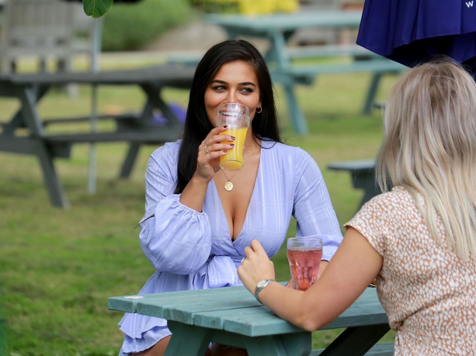 La estrella del reality de Netflix ‘Too Hot to Handle’ Lydia Clyma aprovecha el cálido clima del Reino Unido con una bebida refrescante y una buena charla con una amiga en el jardín de cerveza de un pub cerca de su casa en Portsmouth, 17/07/2020.