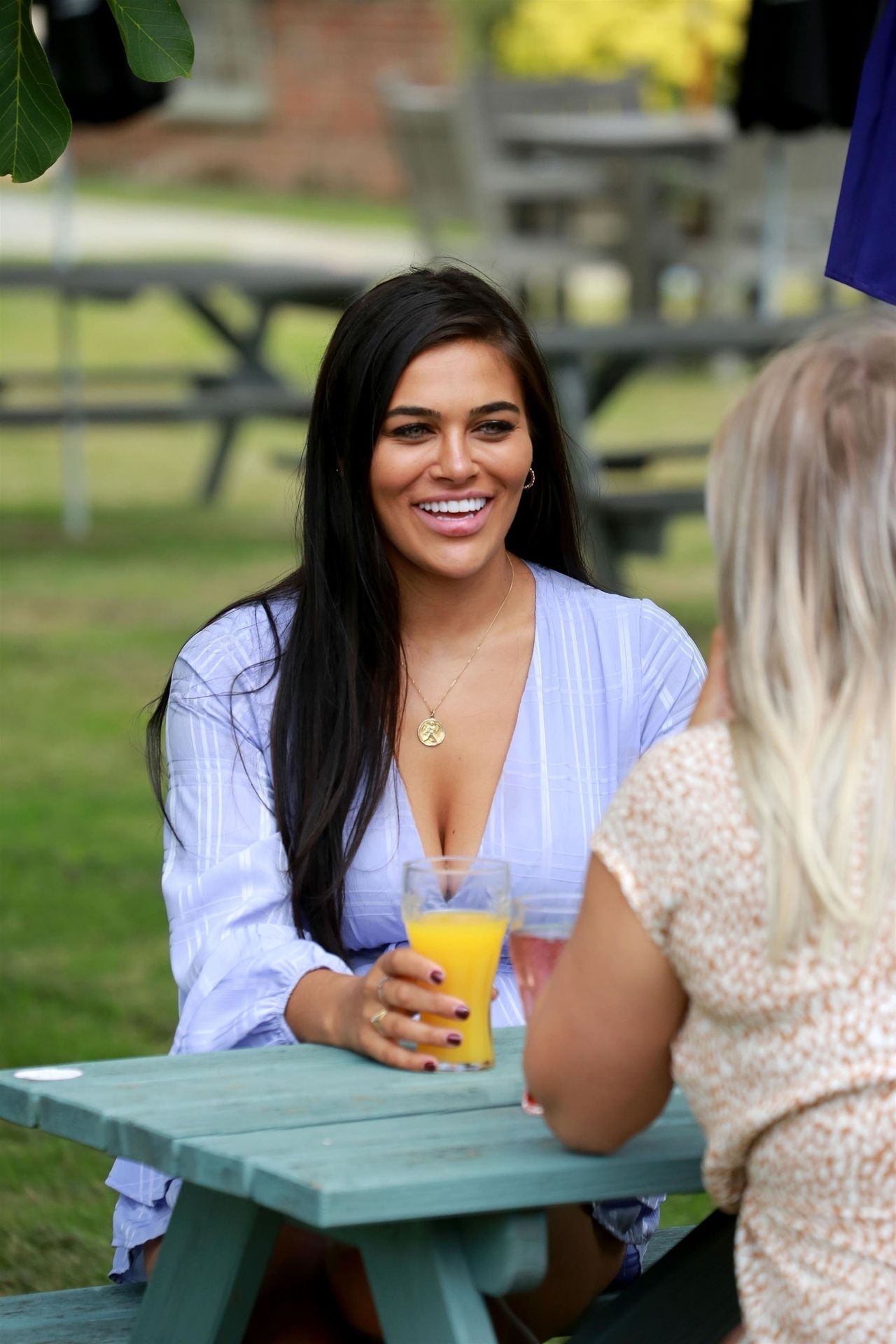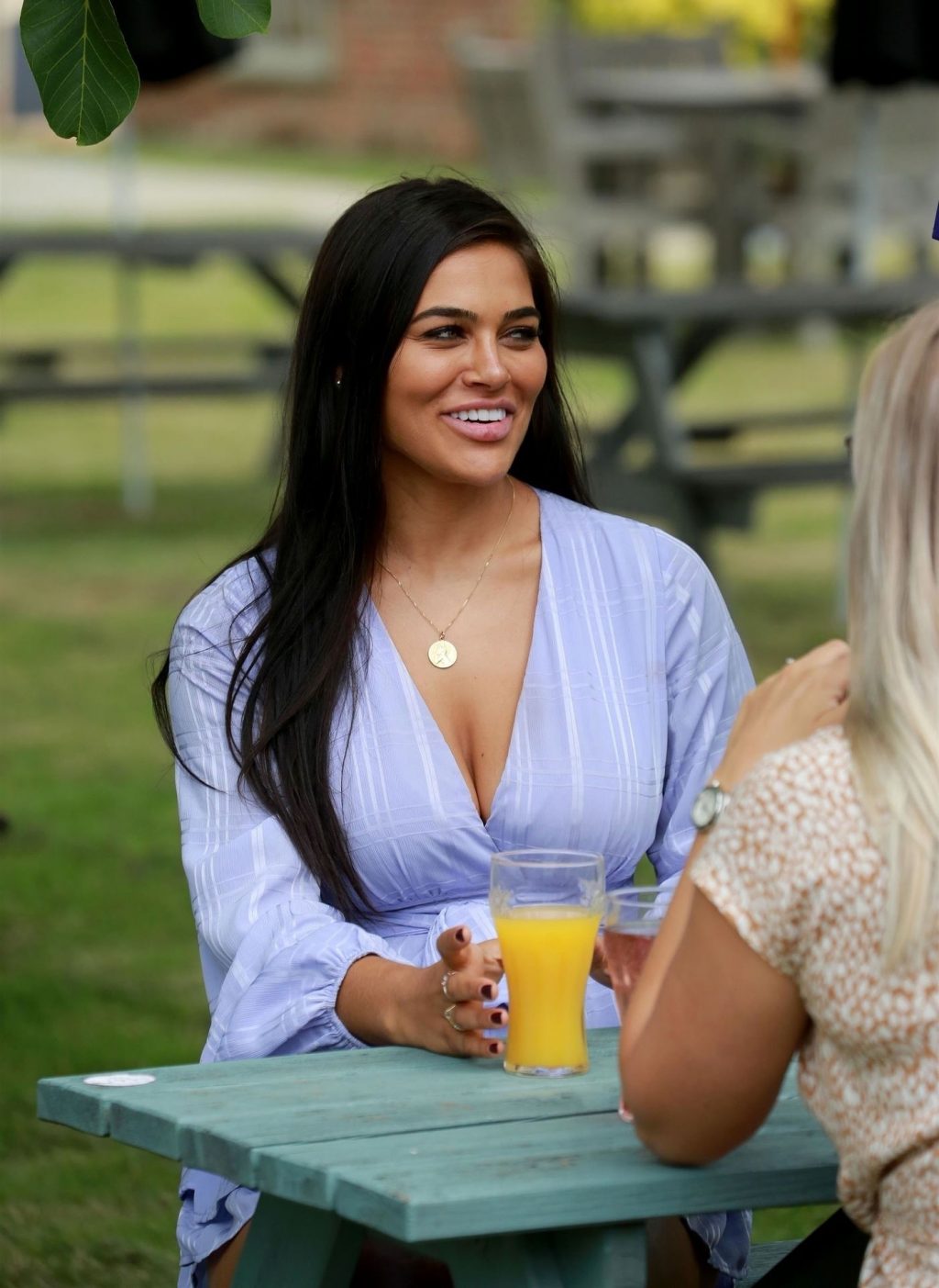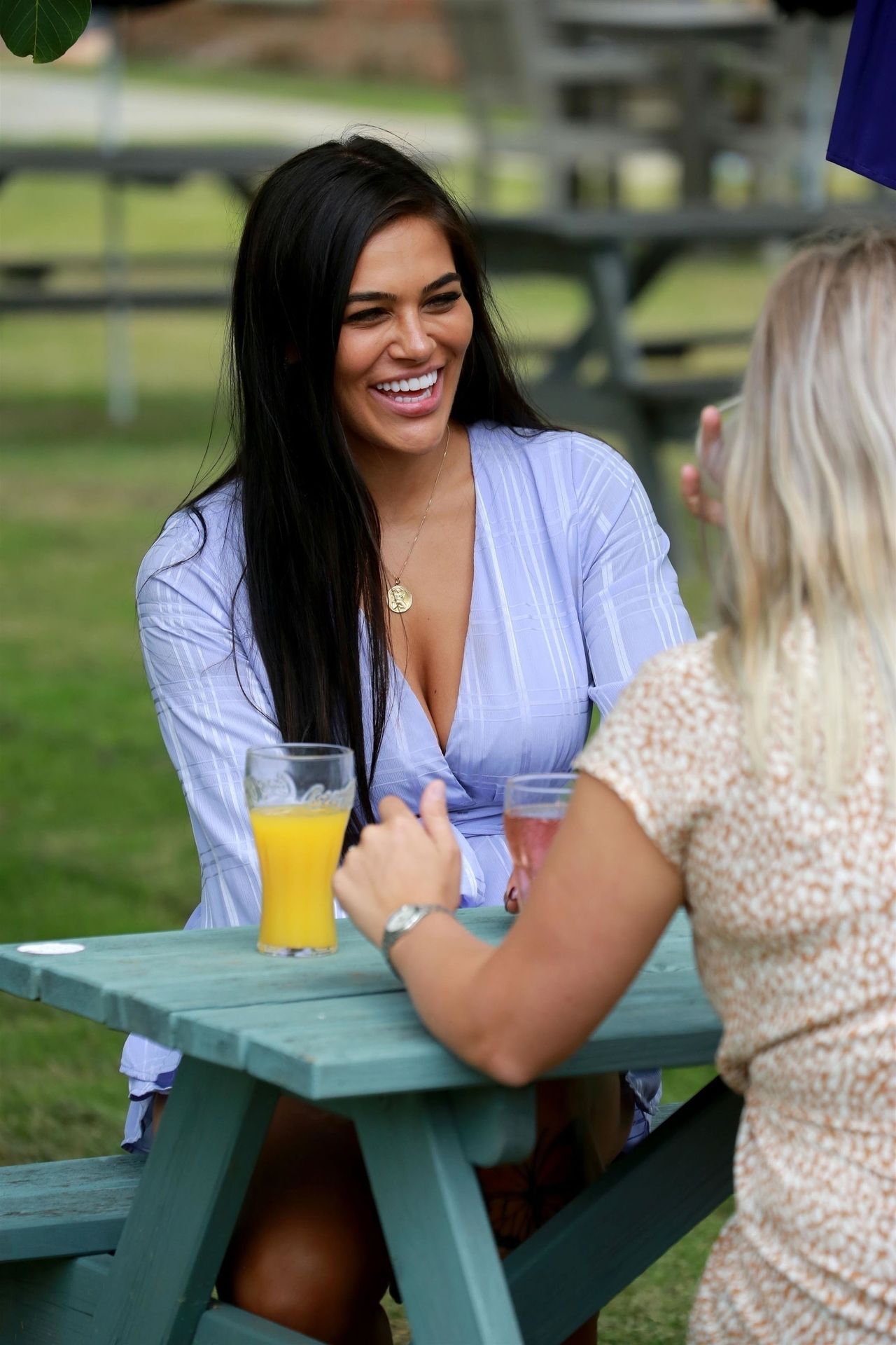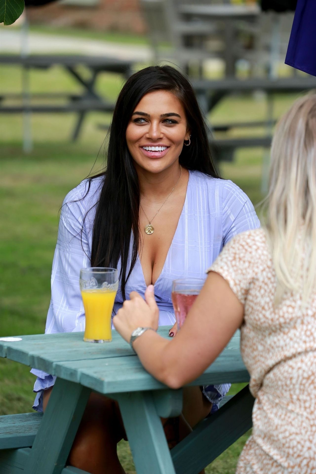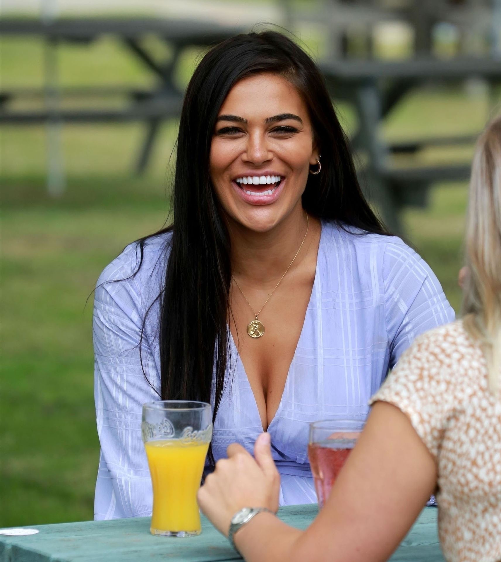La estrella del reality de Netflix ‘Too Hot to Handle’ Lydia Clyma aprovecha el cálido clima del Reino Unido con una bebida refrescante y una buena charla con una amiga en el jardín de cerveza de un pub cerca de su casa en Portsmouth, 17/07/2020.