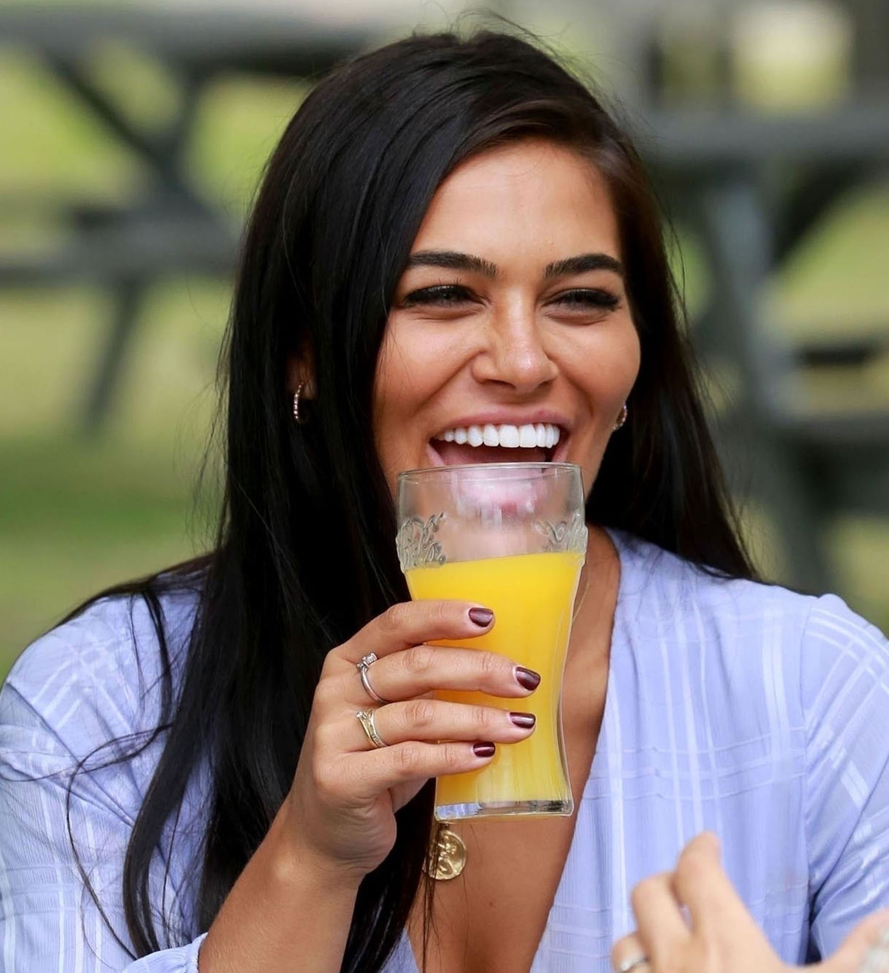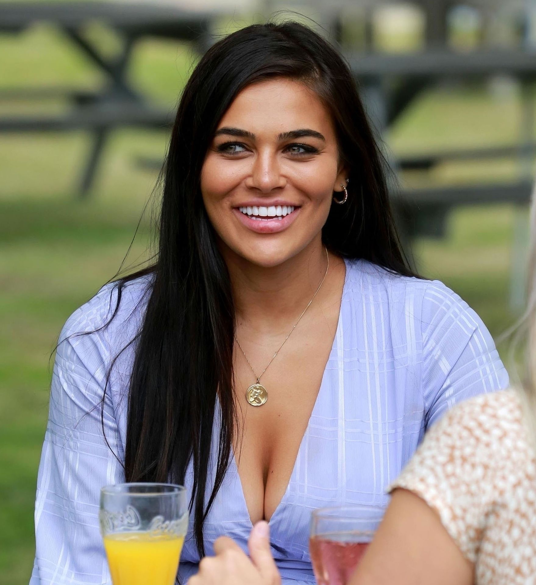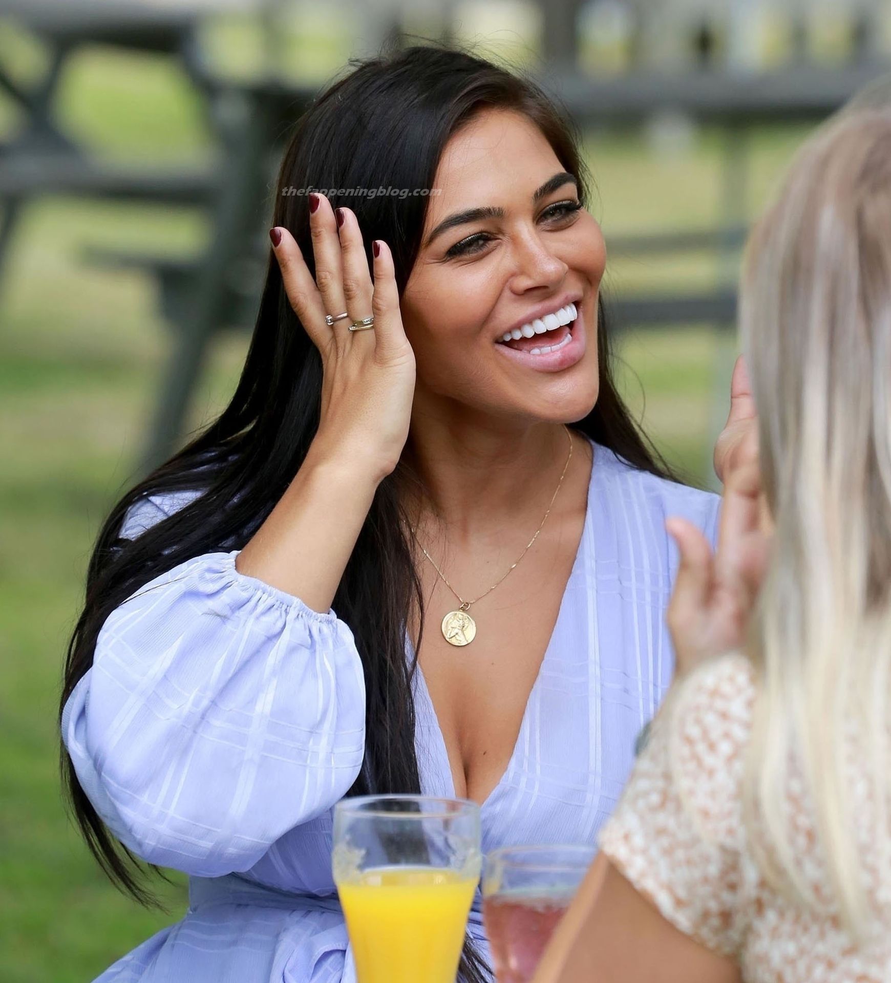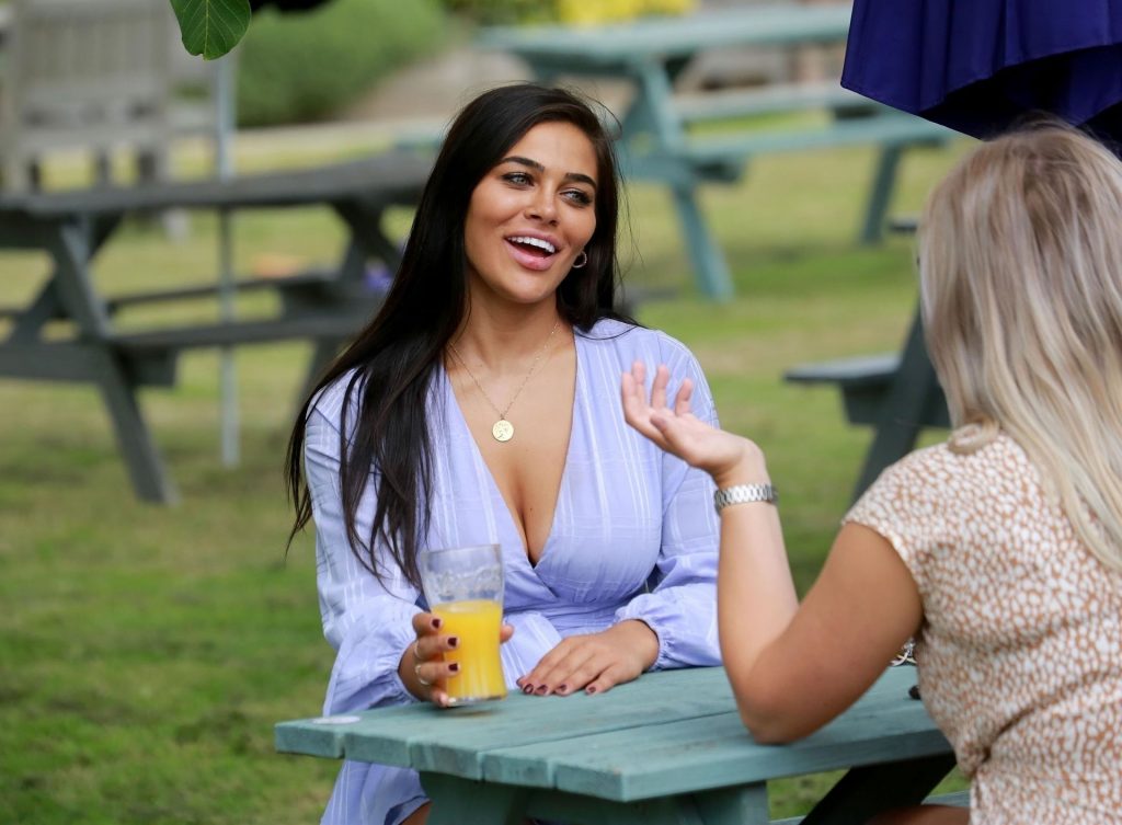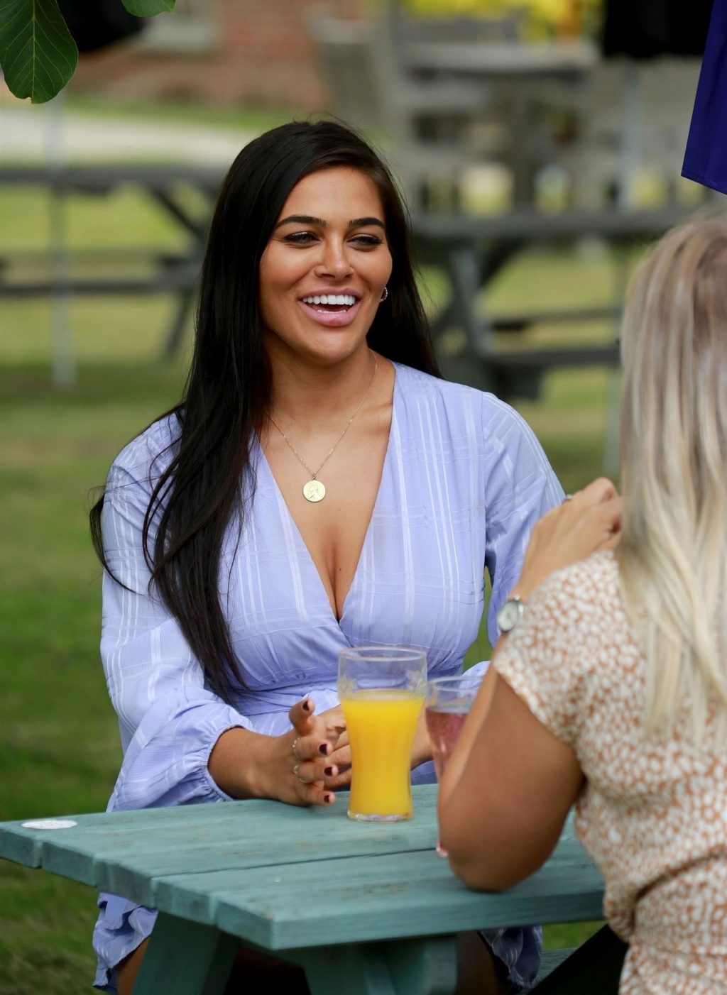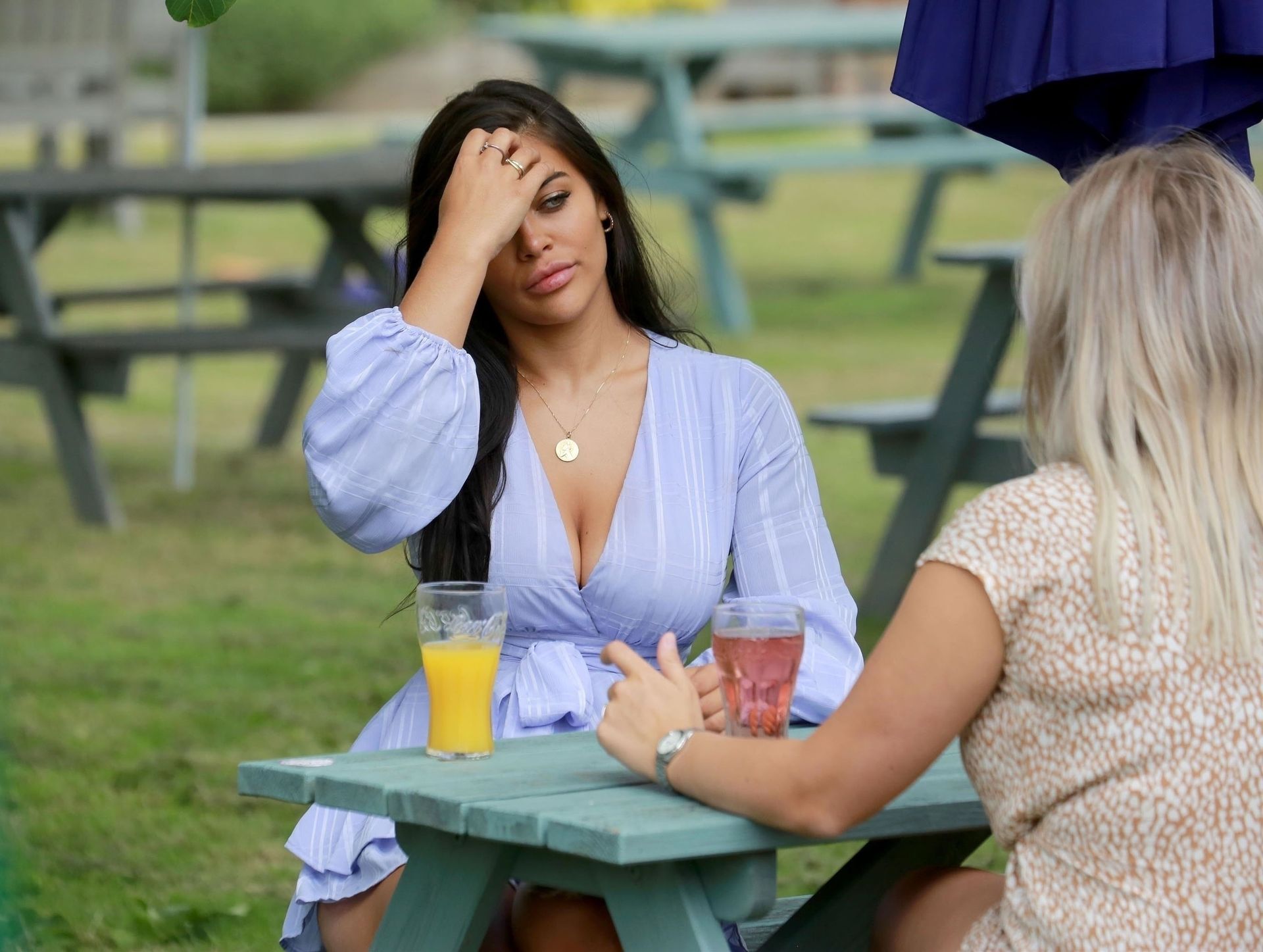 La estrella del reality de Netflix ‘Too Hot to Handle’ Lydia Clyma aprovecha el cálido clima del Reino Unido con una bebida refrescante y una buena charla con una amiga en el jardín de cerveza de un pub cerca de su casa en Portsmouth, 17/07/2020.