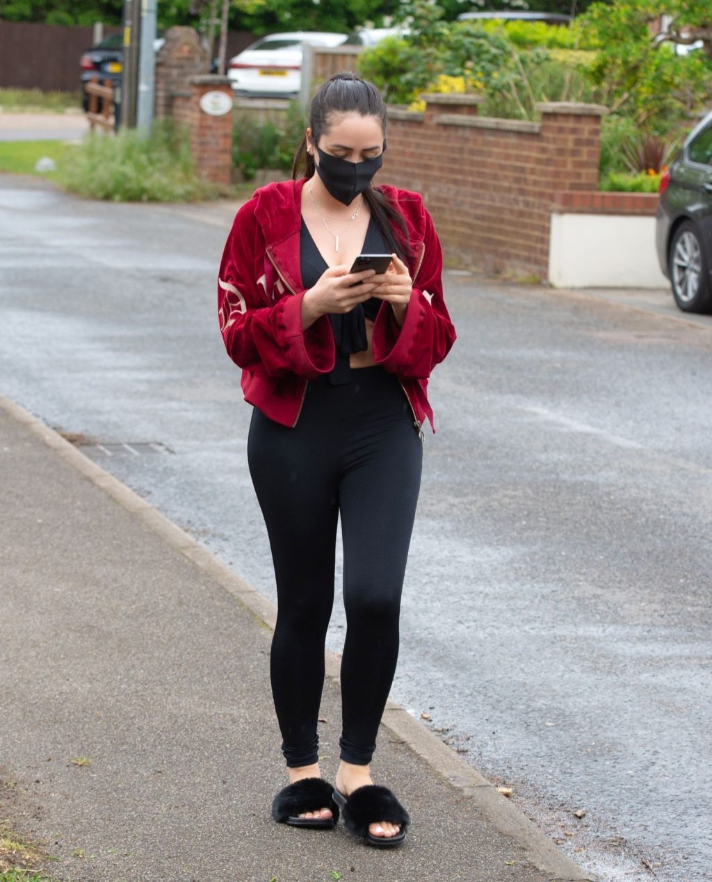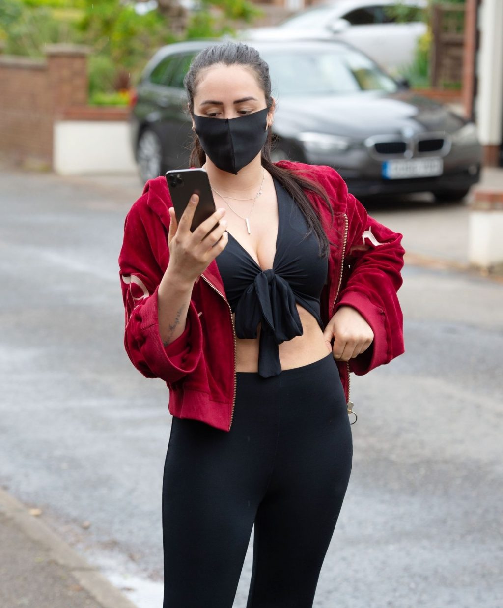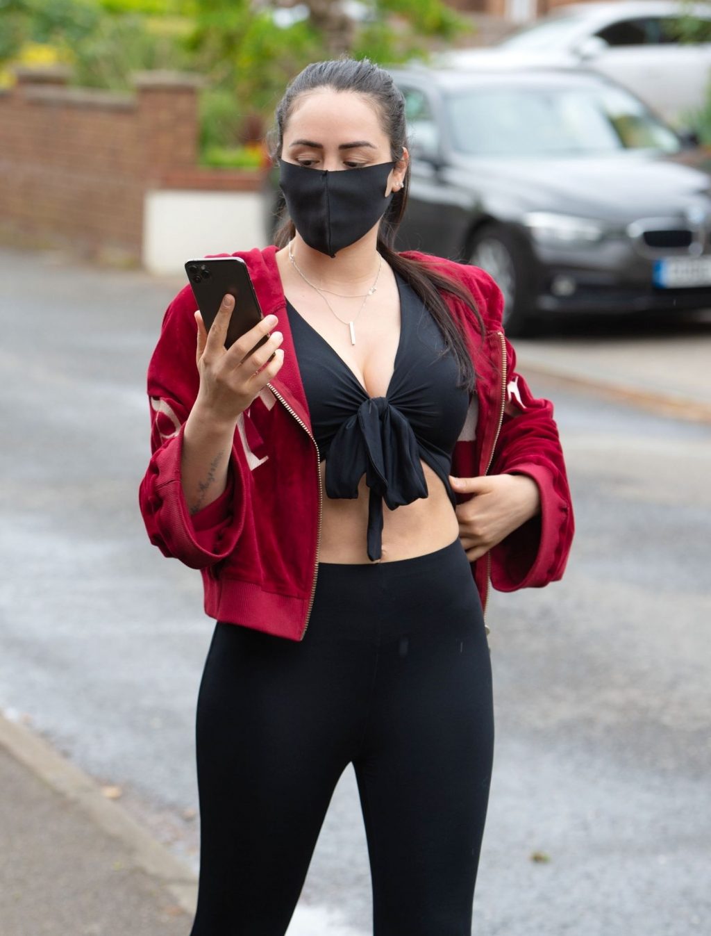 Geordie Shore estrella Marnie Simpson es vista saliendo de su casa en Bedfordshire, 06/04/2020. La estrella de reality muestra su abdomen marcado con un conjunto negro de dos piezas y una sudadera con capucha. También se ve a Marnie usando una máscara negra para protegerse del virus COVID-19.