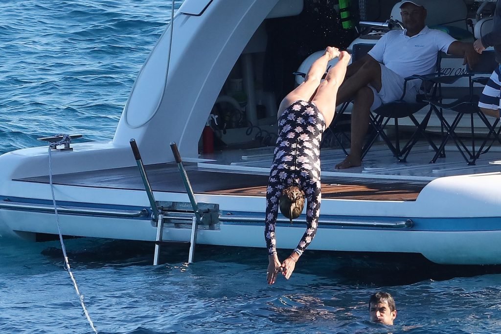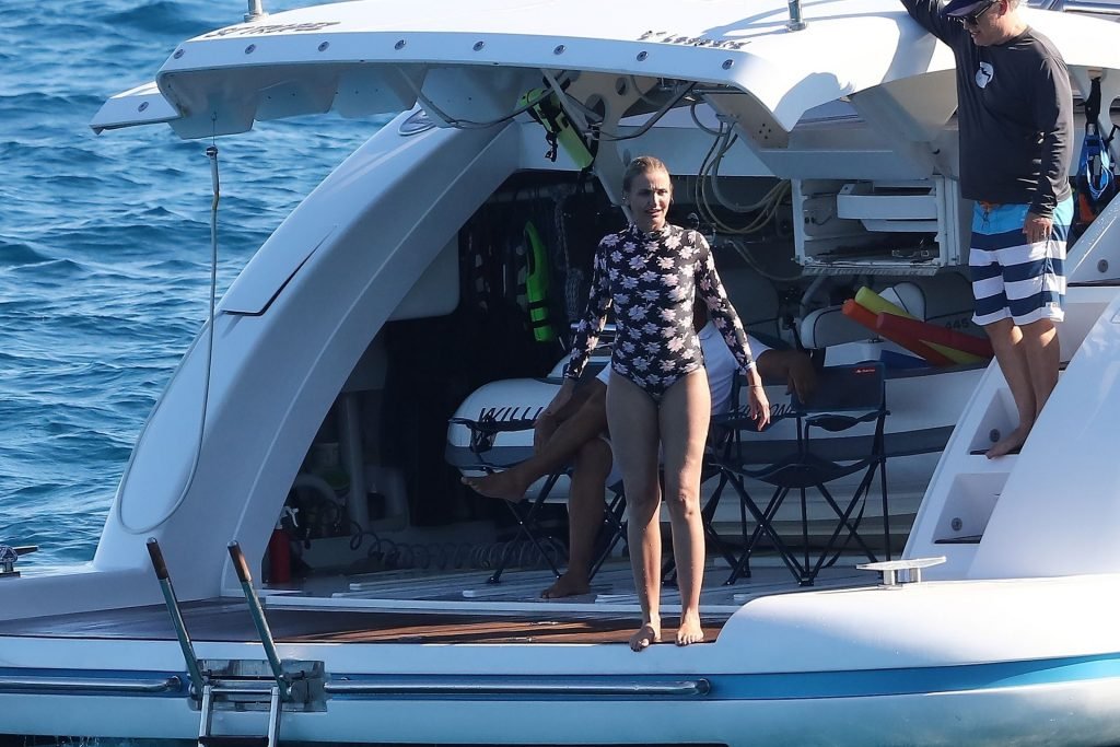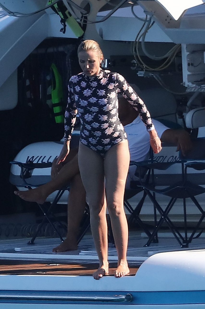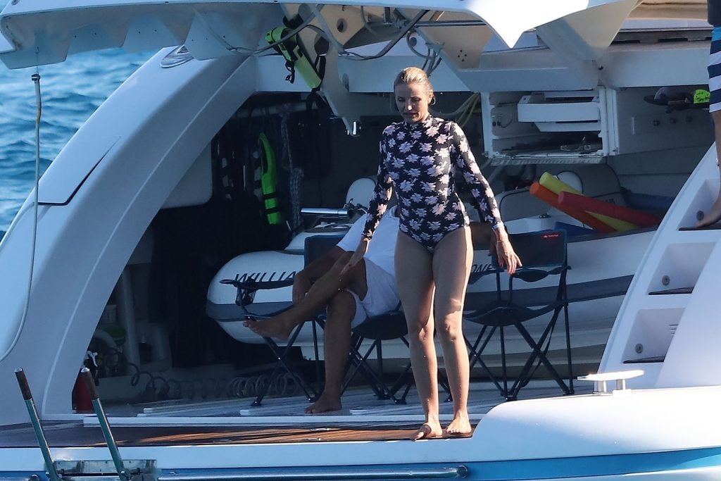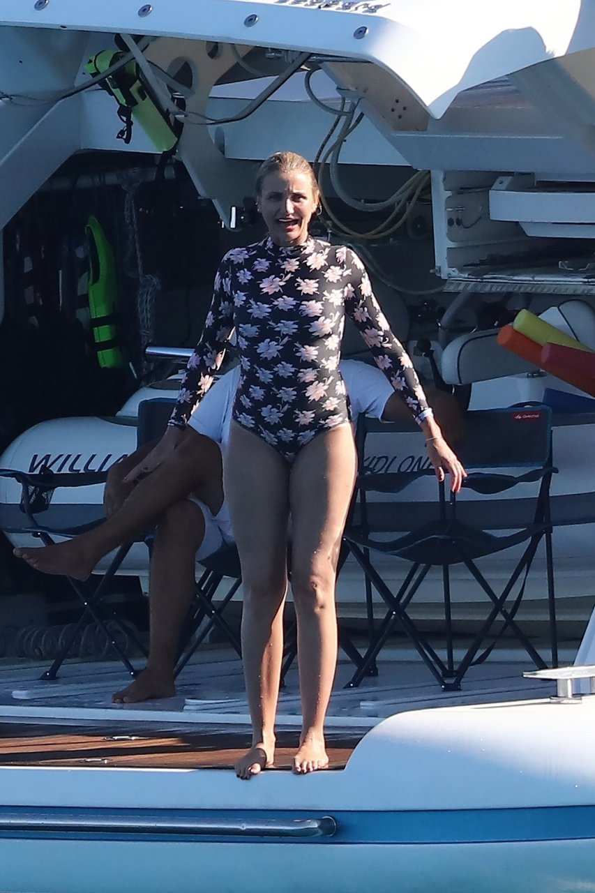 Cameron Diaz y su esposo Benji Madden están aprovechando al máximo sus vacaciones en Saint Tropez, 08/08/2019. La estrella de Charlie’s Angels fue vista zambulléndose en el Mediterráneo con un traje de baño de una pieza floral que mostraba su fantástico cuerpo.
