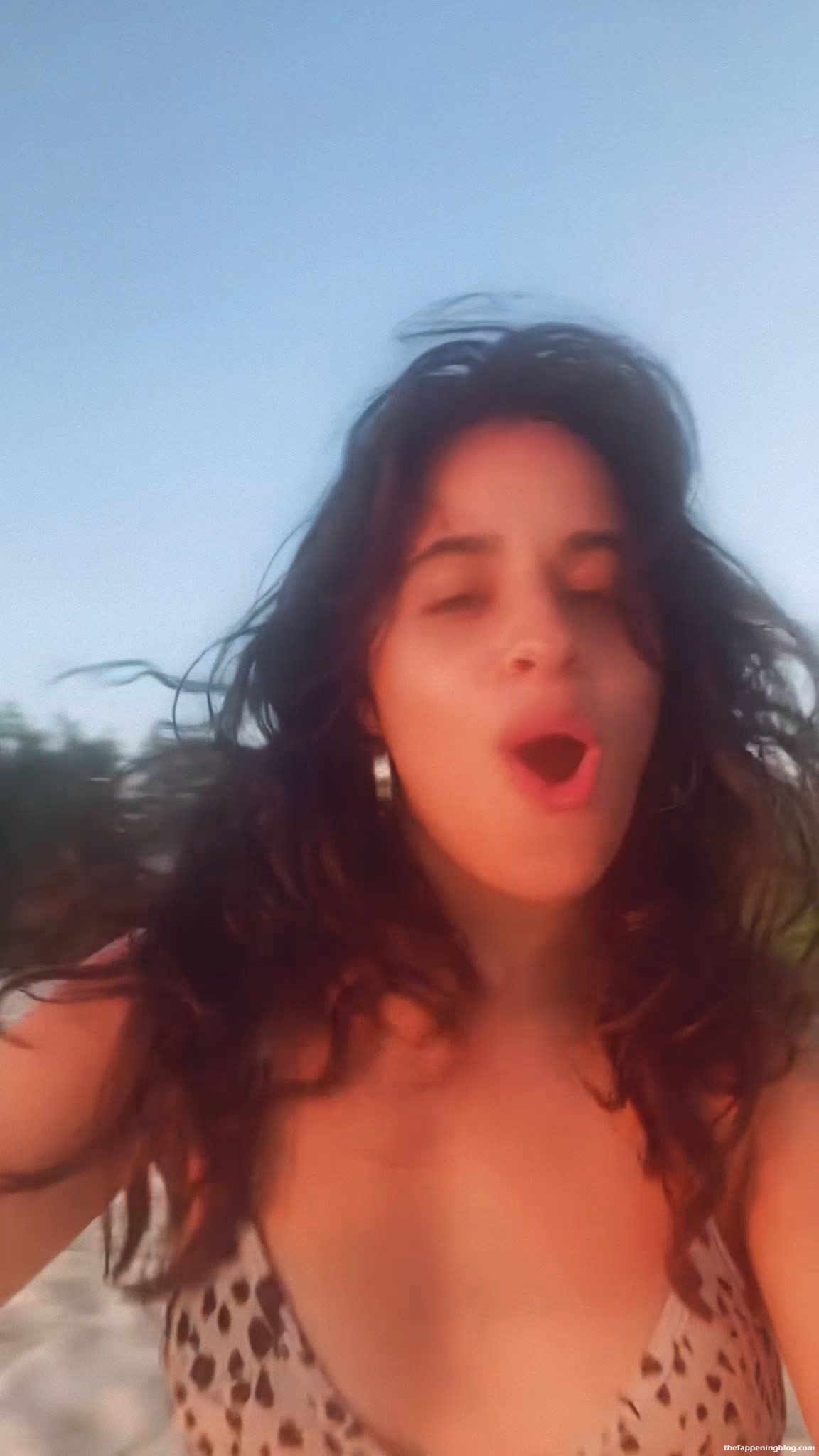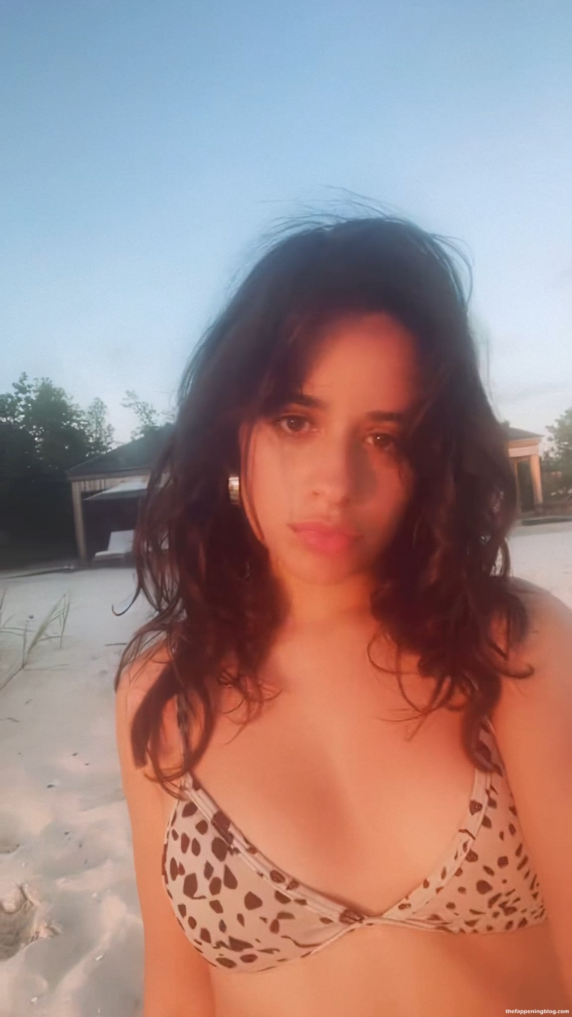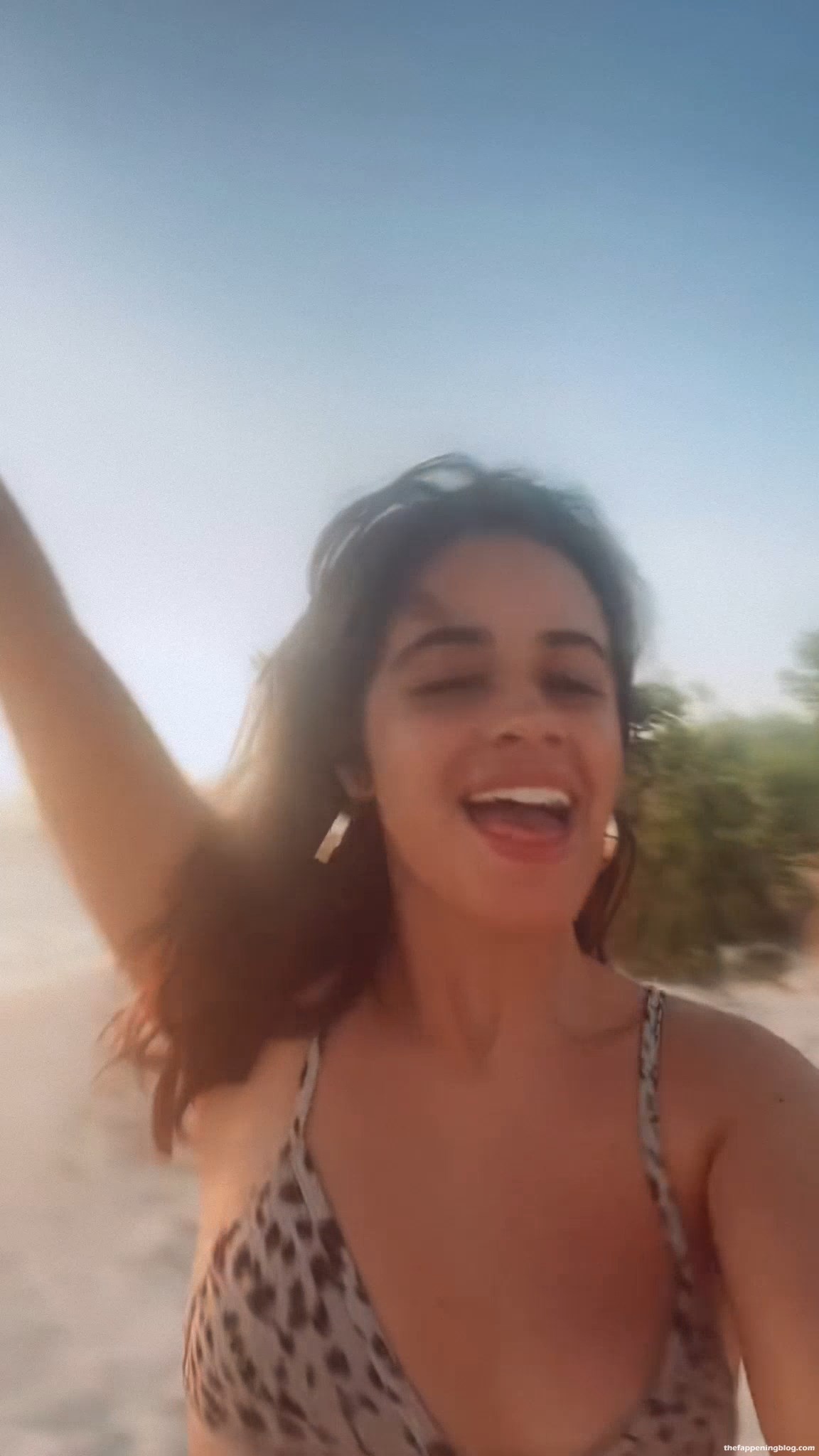 La cantante Camila Cabello muestra su cuerpo sexy, moviendo sus pequeños pechos en un diminuto top de bikini mientras baila en la playa para sus seguidores en TikTok, 08/05/2021.