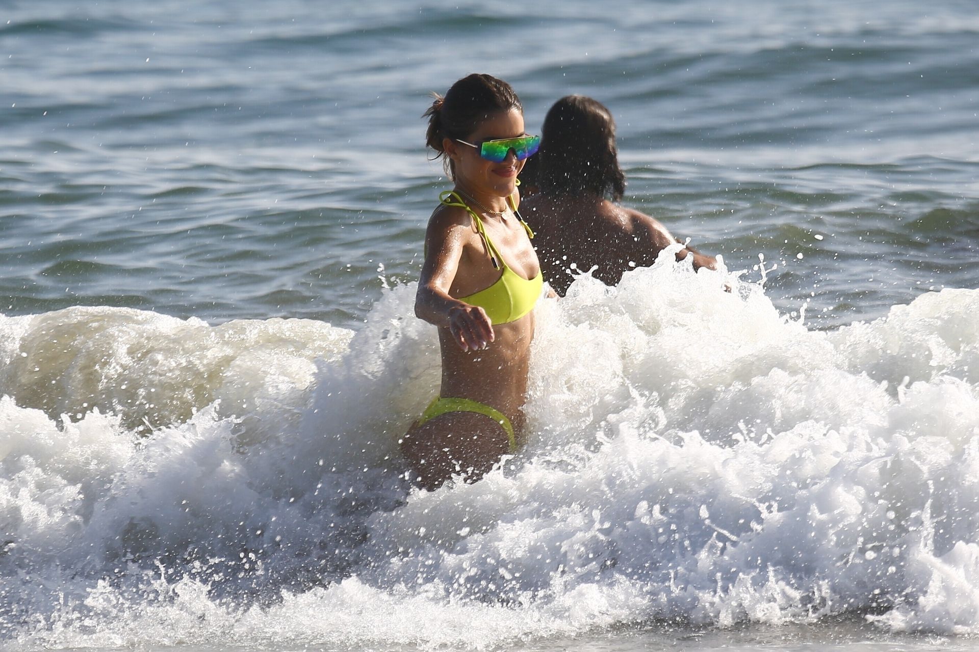 Alessandra Ambrosio y Camila Coelho juegan voleibol mientras disfrutan de un día de playa en Miami, 19/09/2020. Camila muestra su figura con un bikini amarillo mientras disfruta de un día de playa con amigos.