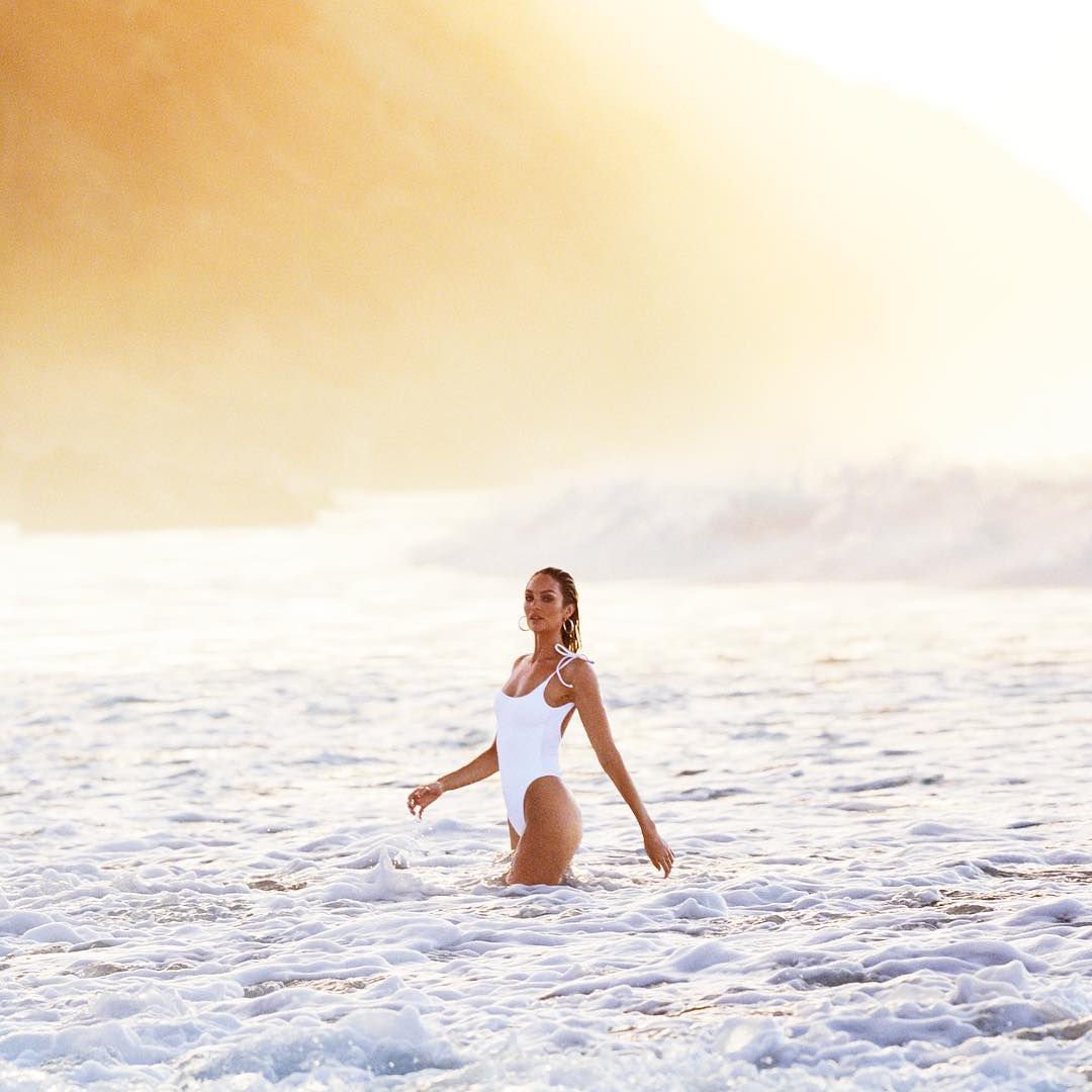 La supermodelo Candice Swanepoel, de 29 años, posa con un traje de baño blanco para una sesión de fotos promocional en la playa de Brasil (enero de 2018).