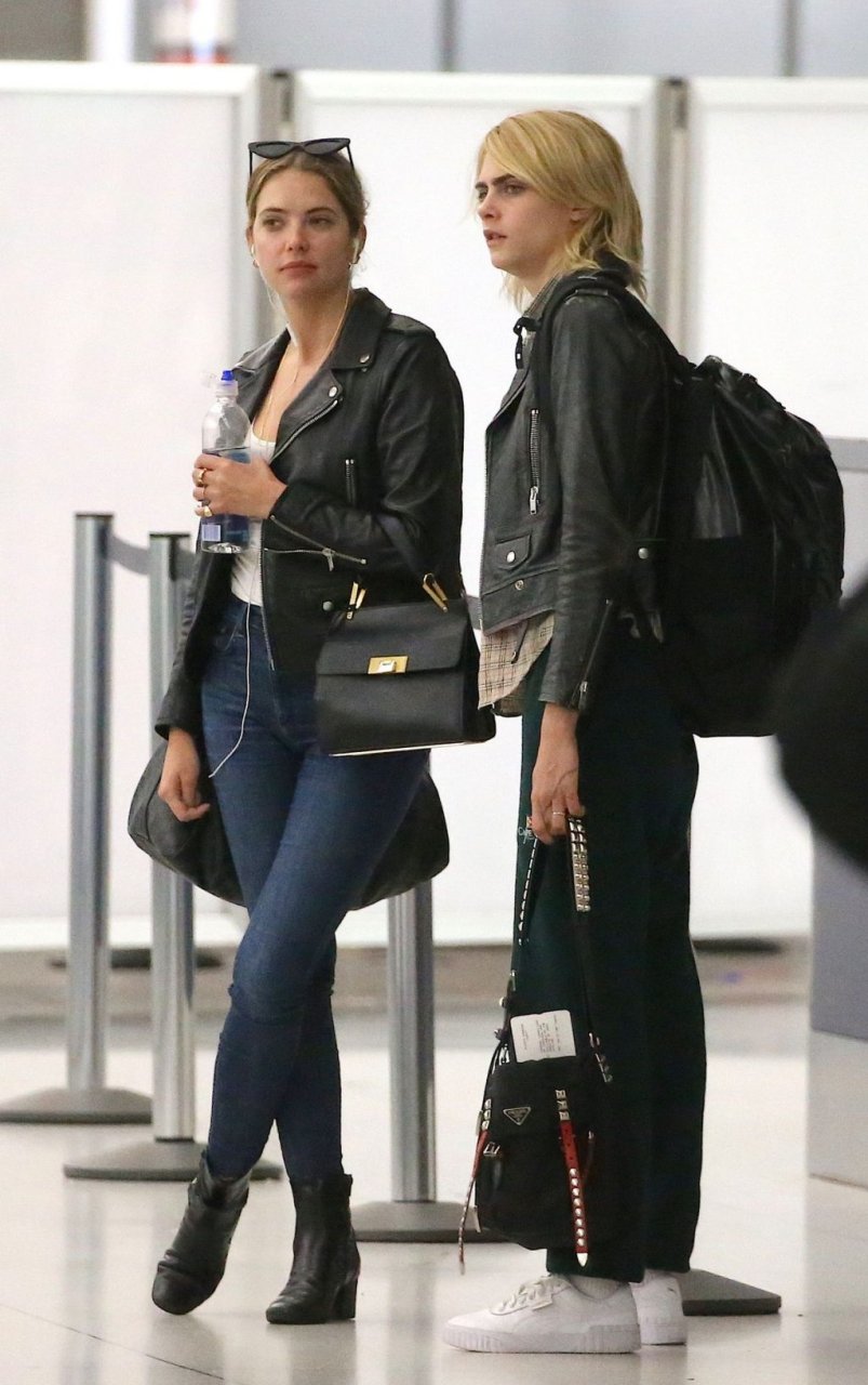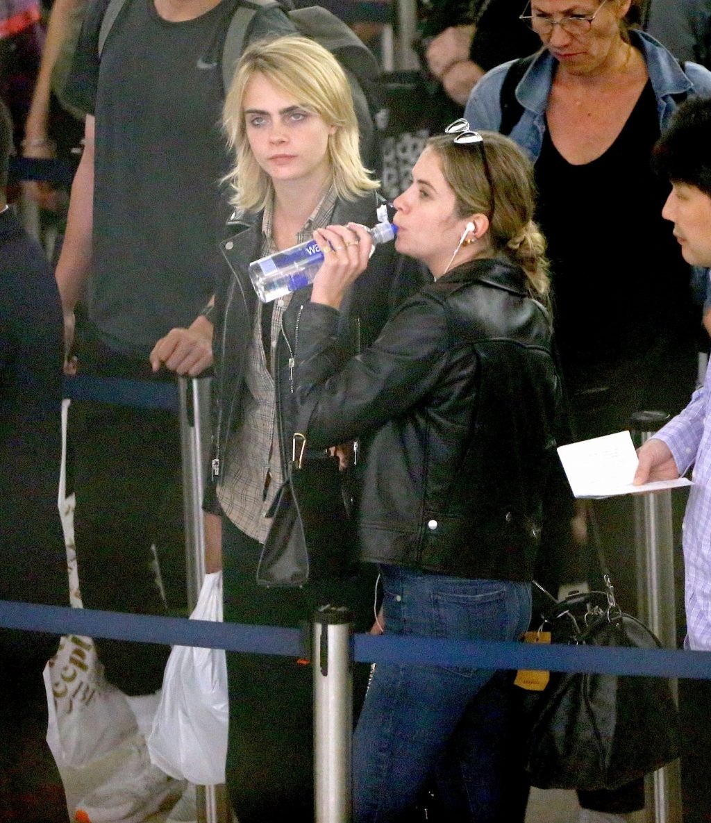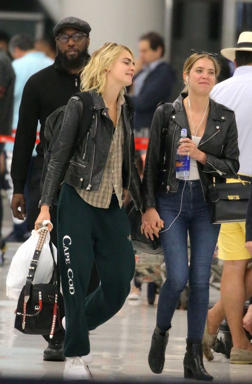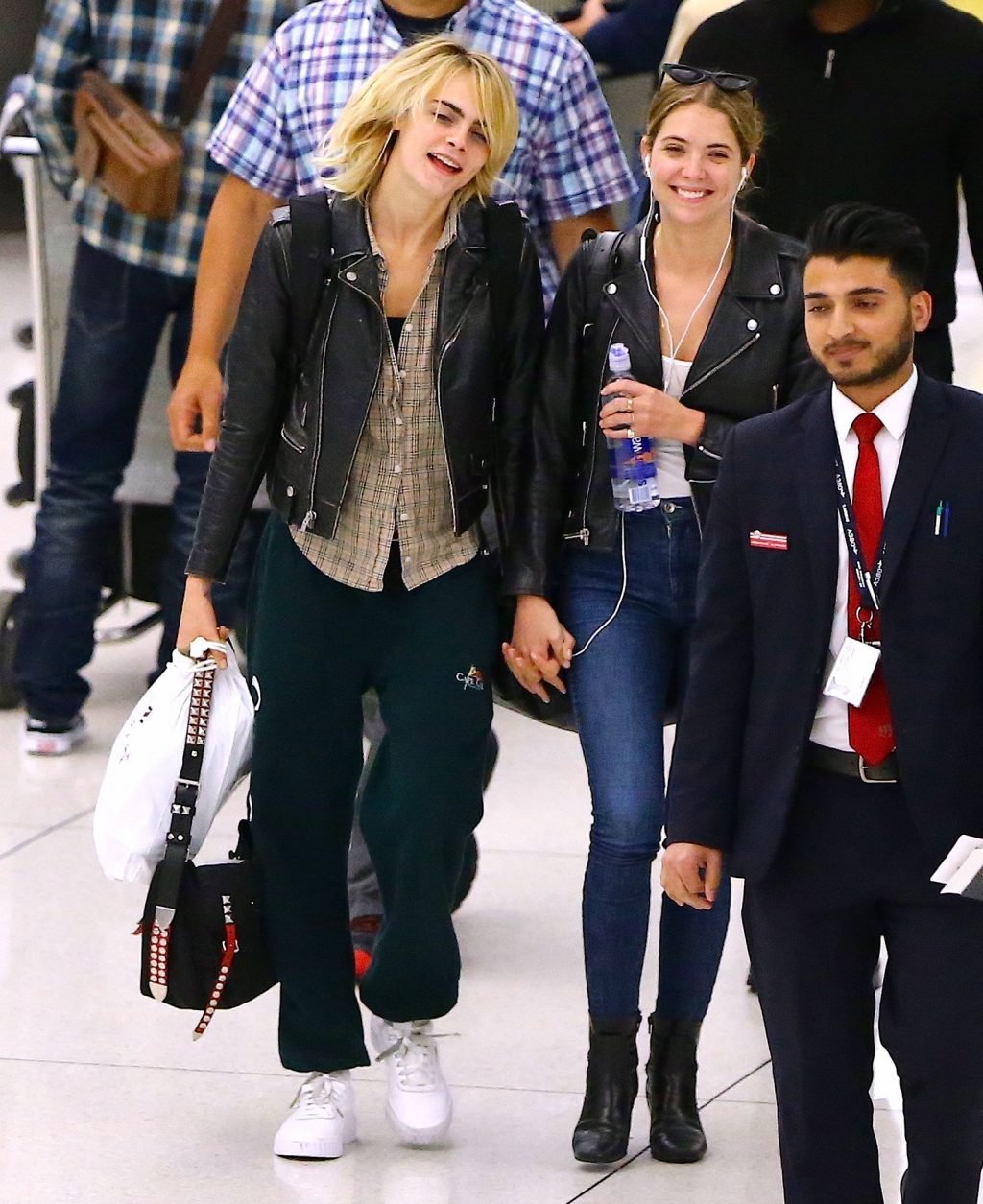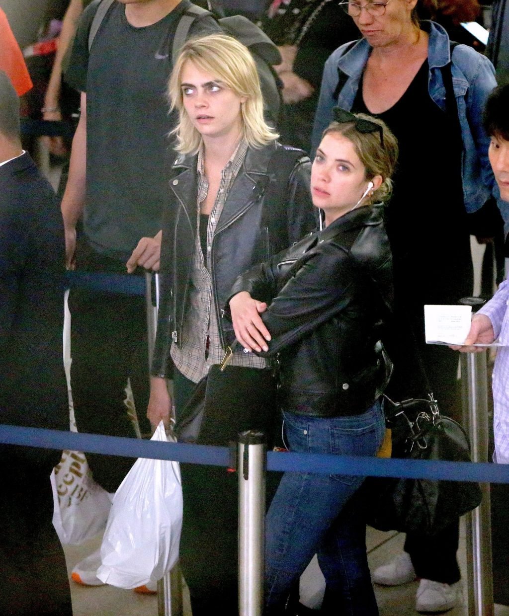 Mira las nuevas fotos de paparazzi de la famosa pareja lesbiana. Cara Delevingne y Ashley Benson fueron vistas en el aeropuerto JFK de Nueva York besándose y abrazándose en la fila de seguridad, 18/06/2019.