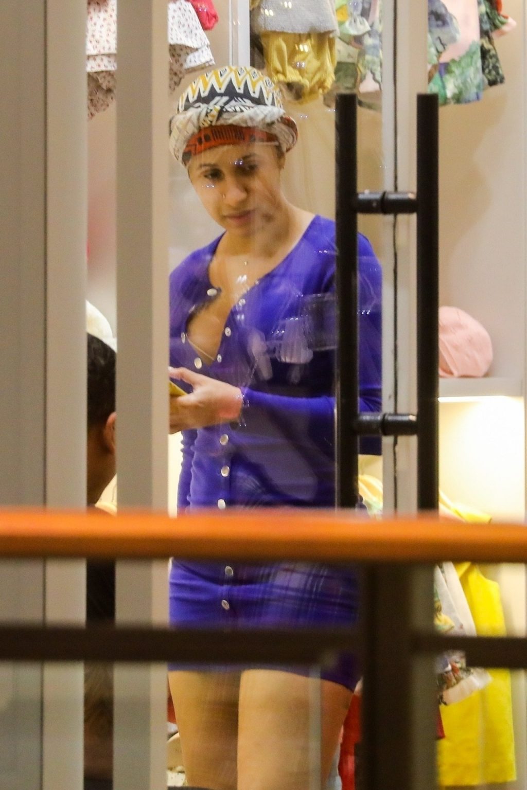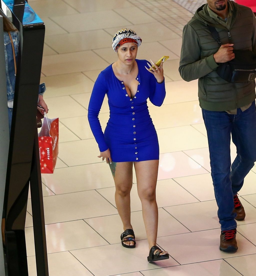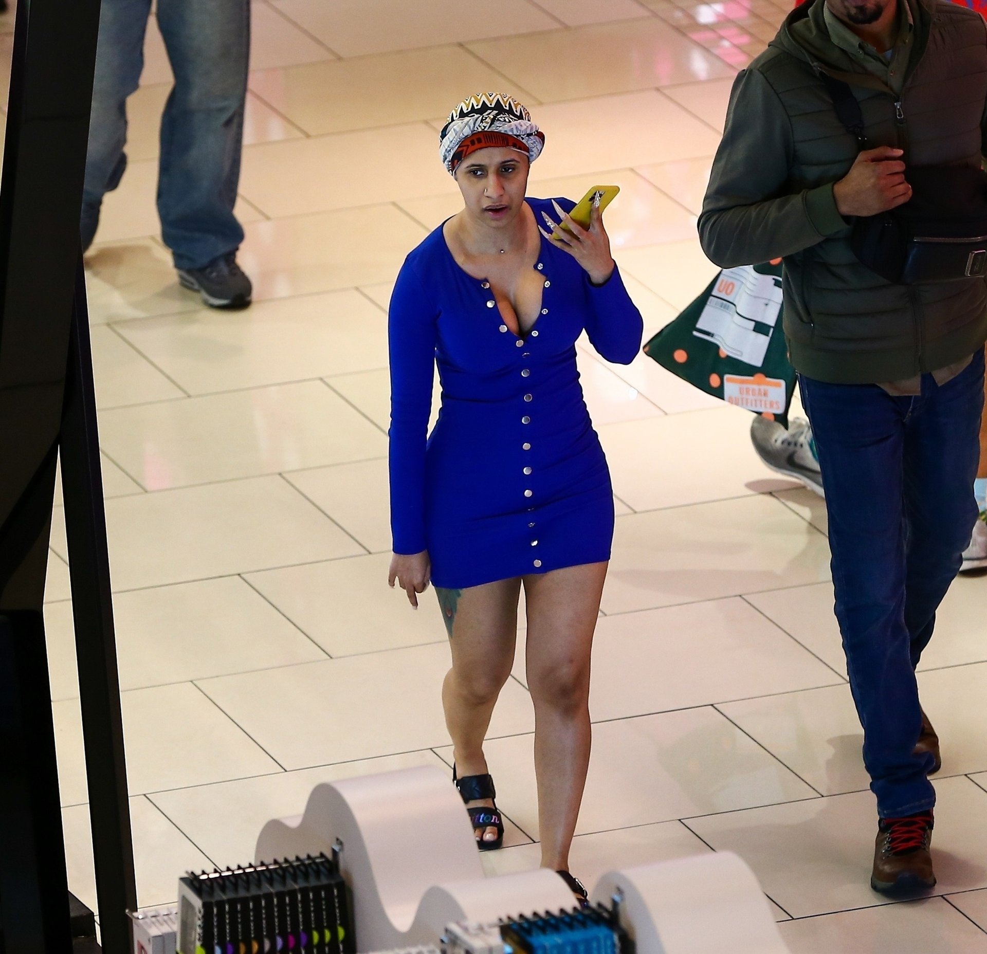Cardi B atrae a una multitud mientras visita el centro comercial Aventura en Miami para hacer algunas compras en el último fin de semana antes de Navidad, 22/12/2019. La rapera y cantante mantuvo un estilo sencillo sin maquillaje y con el cabello envuelto en un simple turbante, aunque mostró sus curvas con un mini vestido azul corto con un escote pronunciado.