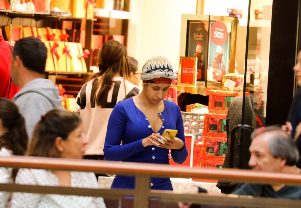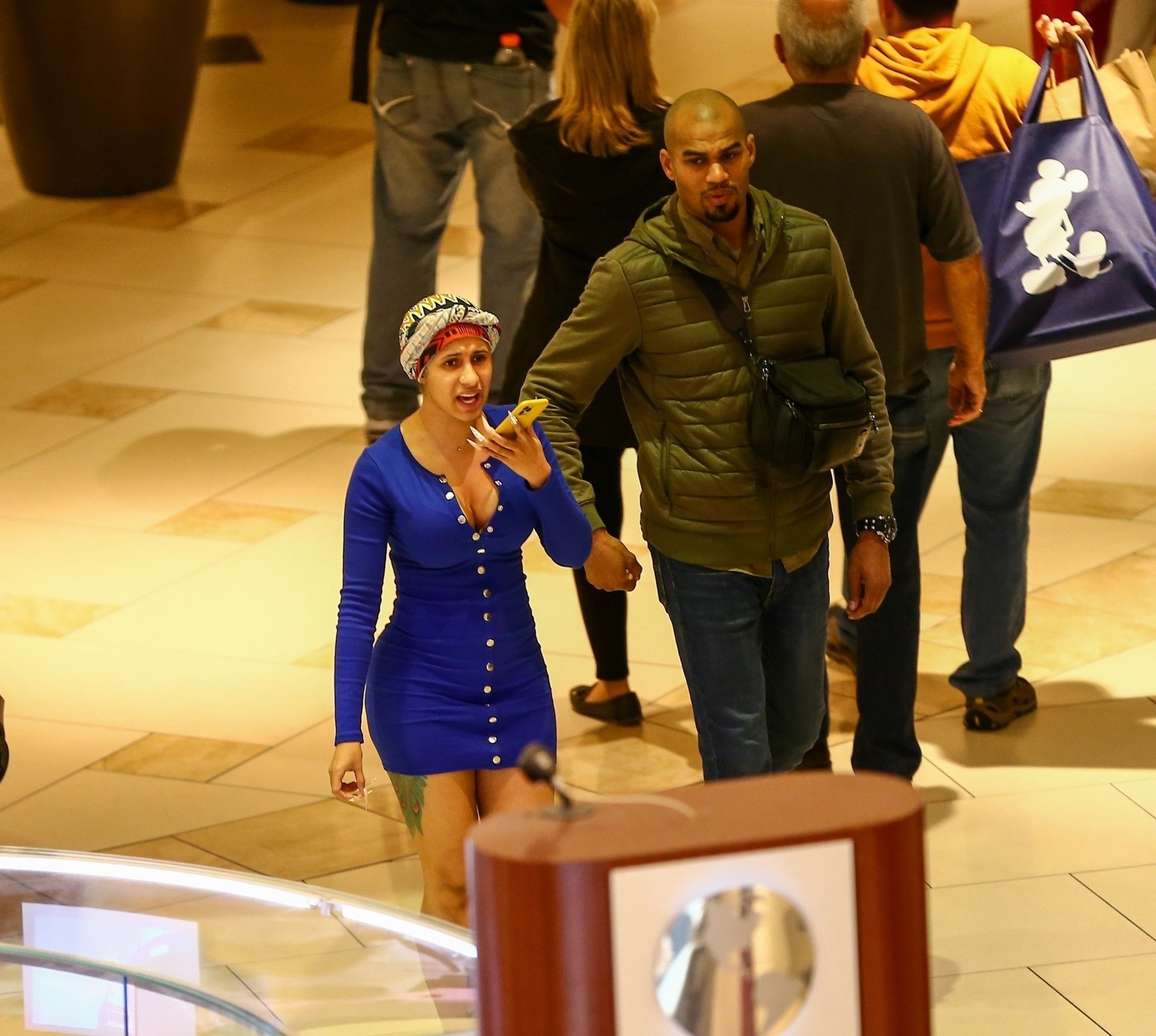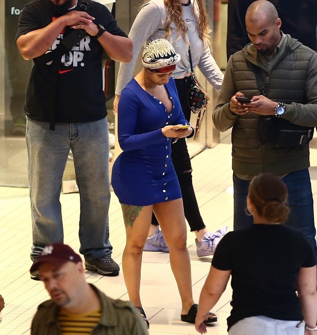 Cardi B atrae a una multitud mientras visita el centro comercial Aventura en Miami para hacer algunas compras en el último fin de semana antes de Navidad, 22/12/2019. La rapera y cantante mantuvo un estilo sencillo sin maquillaje y con el cabello envuelto en un simple turbante, aunque mostró sus curvas con un mini vestido azul corto con un escote pronunciado.