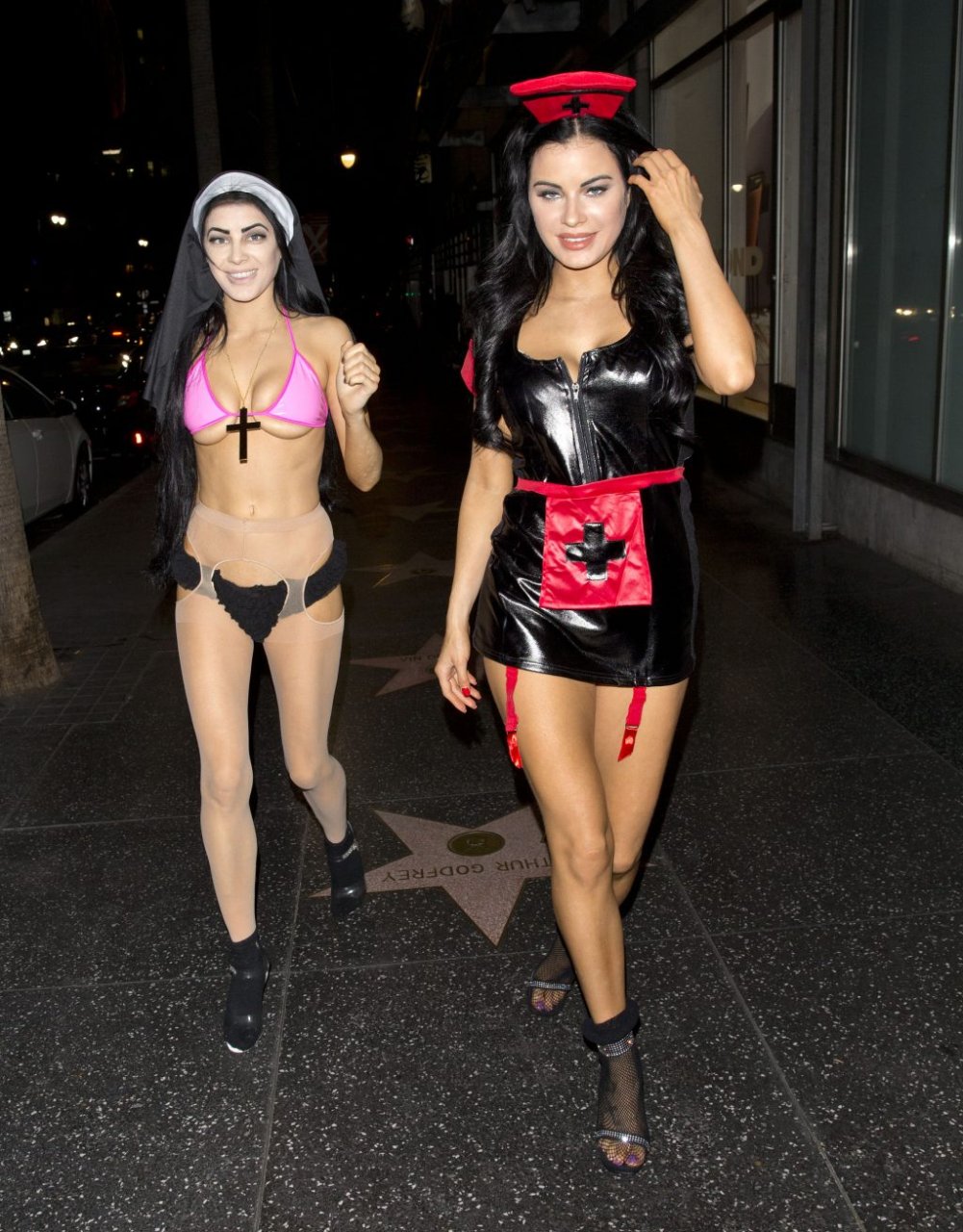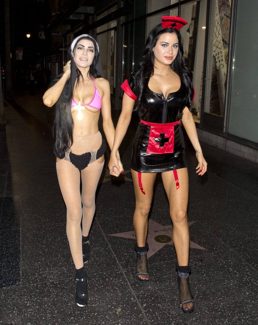 Modelos británicas de Playboy, las hermanas gemelas Carla y Melissa Howe fueron vistas con disfraces de Halloween casi inexistentes mientras salían de cenar en el restaurante “Katsuya” en Hollywood, el 25/10/2018. Las hermanas se dirigían a la fiesta de Halloween del millonario Playboy Dan Bilzerian en Bel Air.