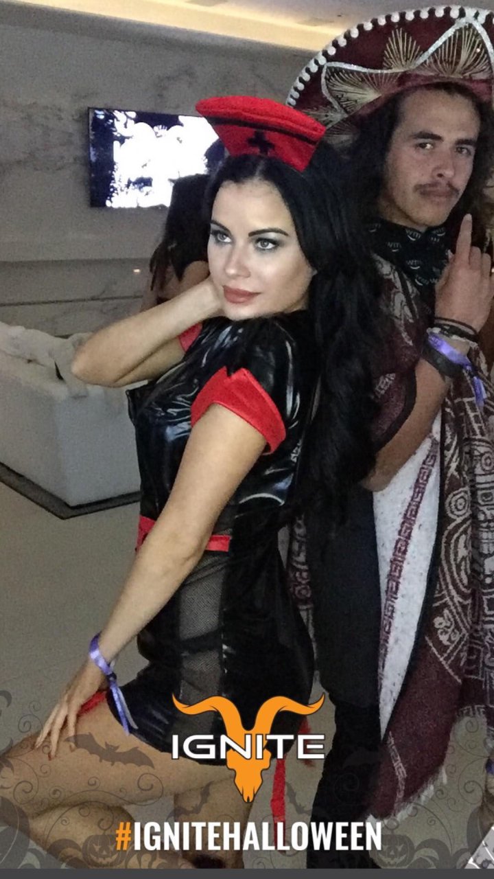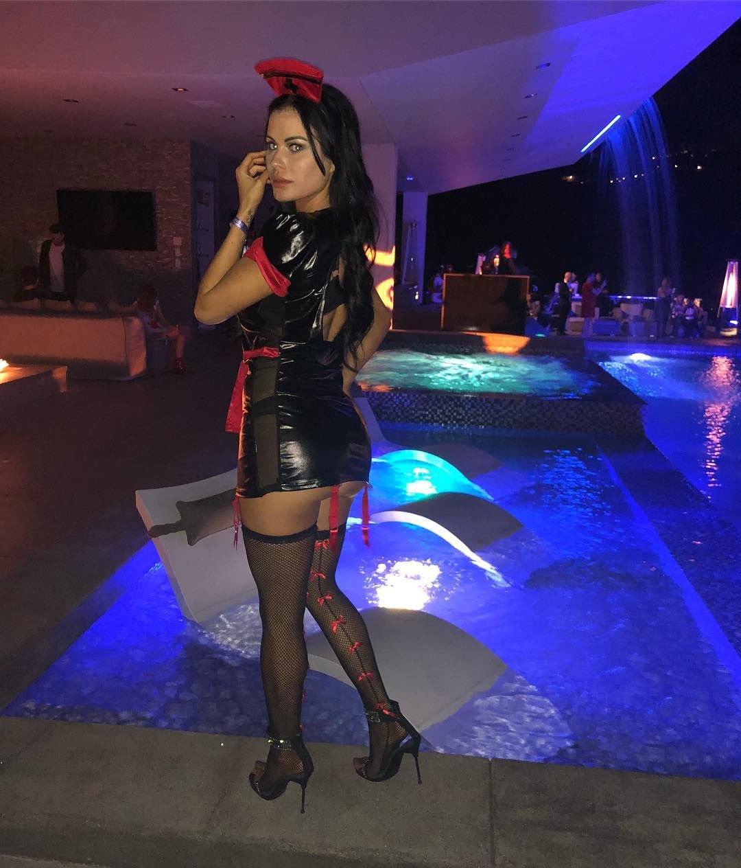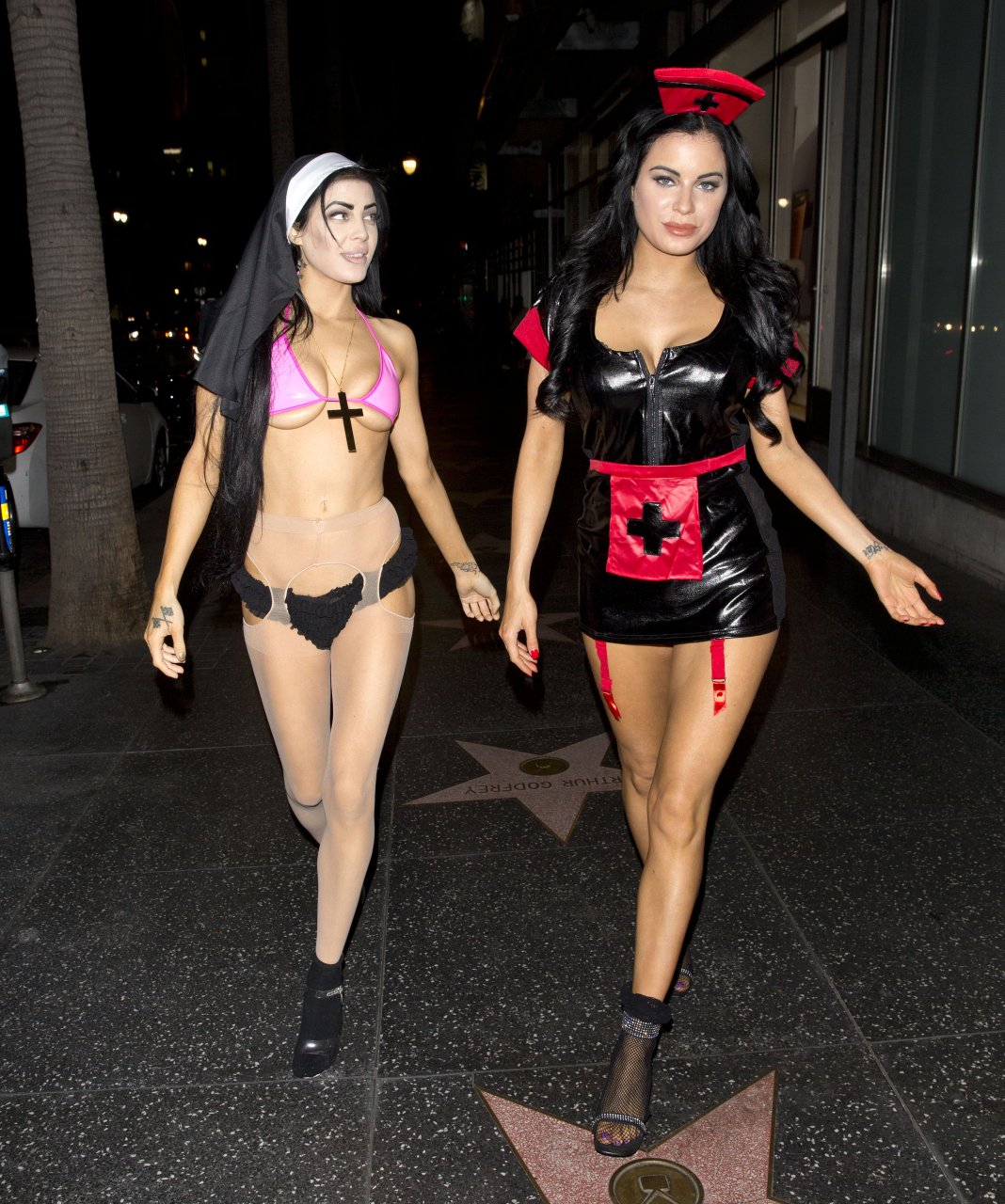 Modelos británicas de Playboy, las hermanas gemelas Carla y Melissa Howe fueron vistas con disfraces de Halloween casi inexistentes mientras salían de cenar en el restaurante “Katsuya” en Hollywood, el 25/10/2018. Las hermanas se dirigían a la fiesta de Halloween del millonario Playboy Dan Bilzerian en Bel Air.