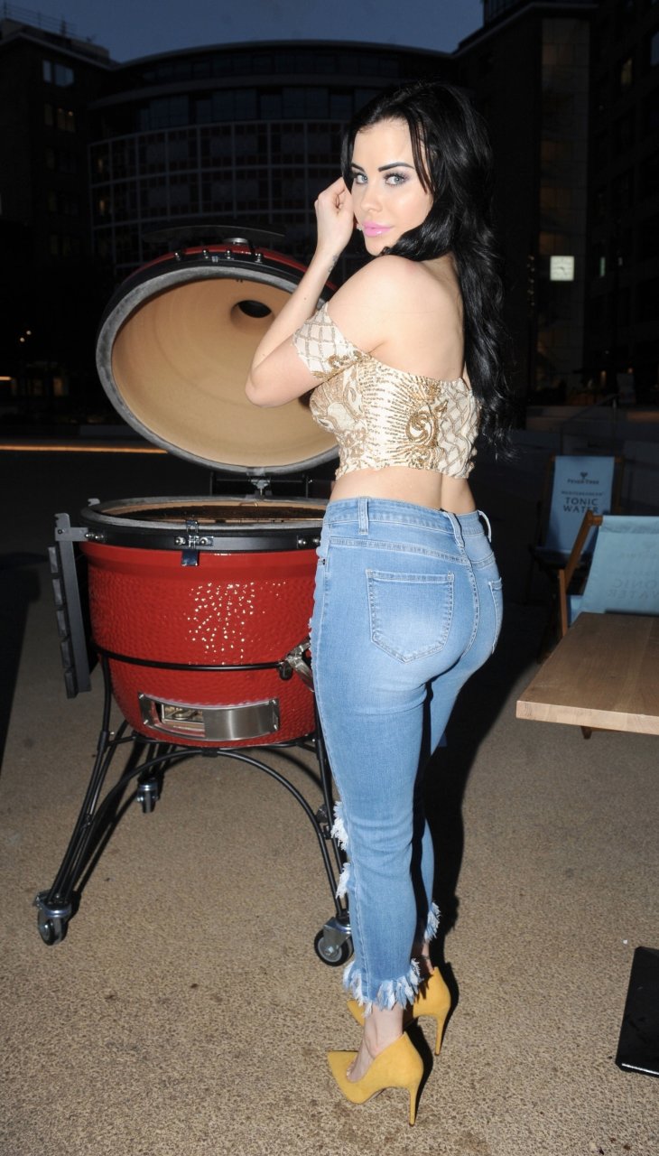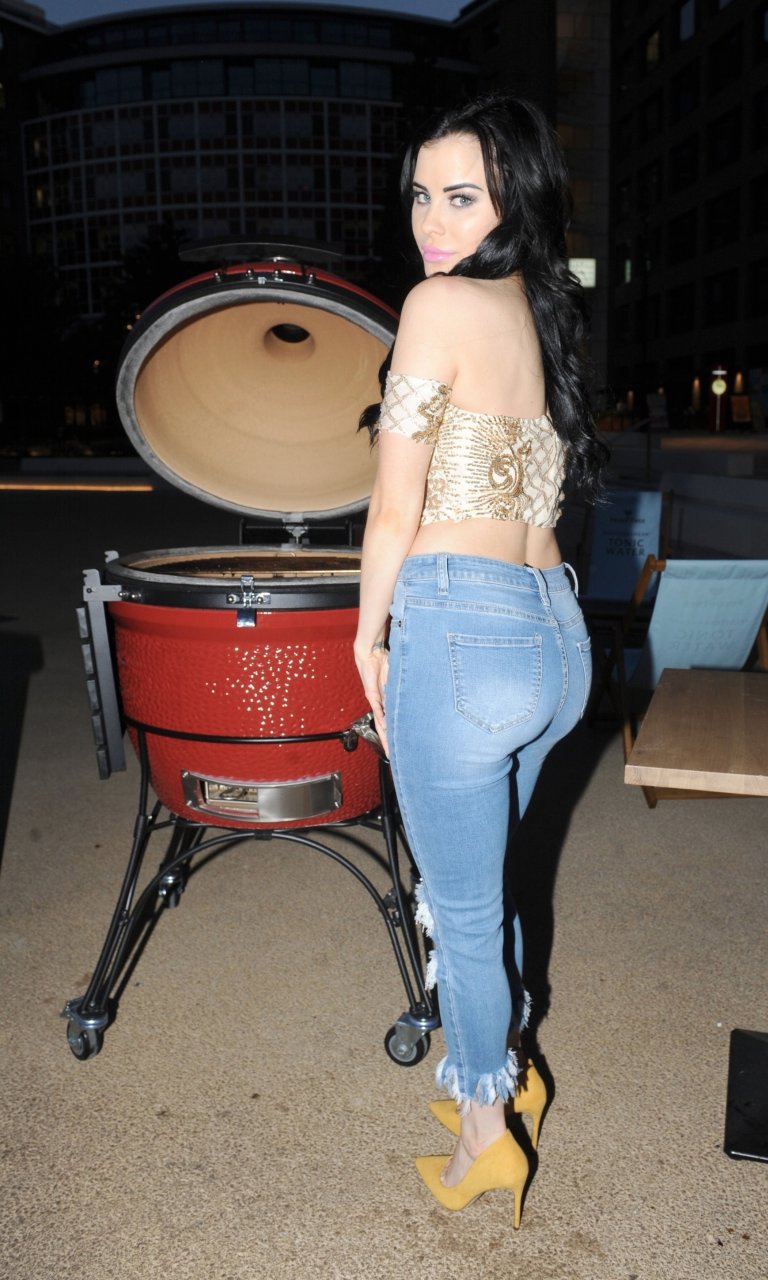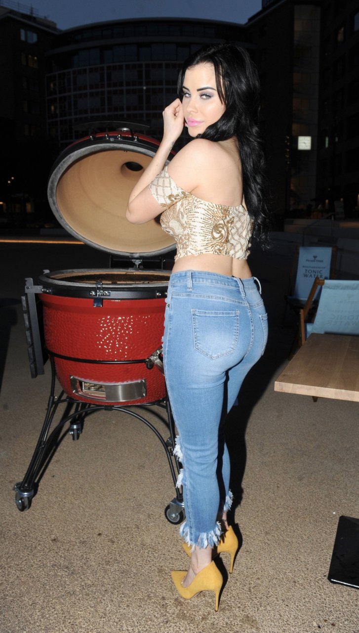 La exmodelo de Playboy Carla Howe fue vista en Londres, 14/06/2018. La morena llevaba una blusa dorada y jeans ajustados rasgados.