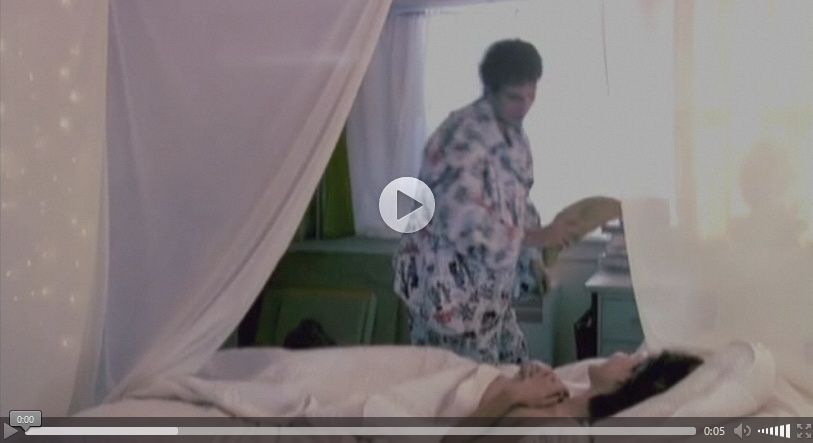 The next scene from the same movie is here! As she smiles, Carly Pope lays topless on a bed on her back with her arms over her breasts and then waves her arm at a man and gives us a view of her right breast and her left nipple peeking out.