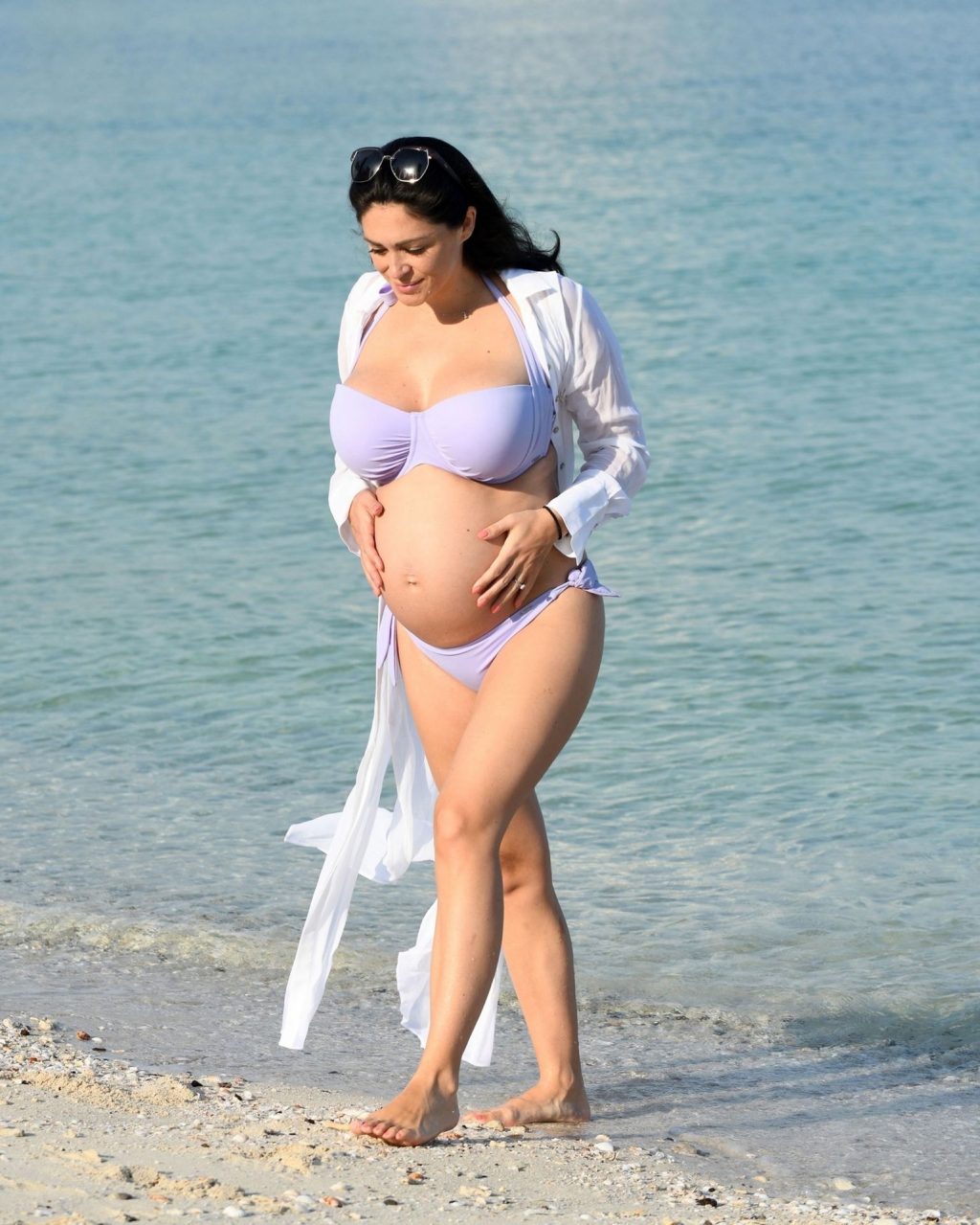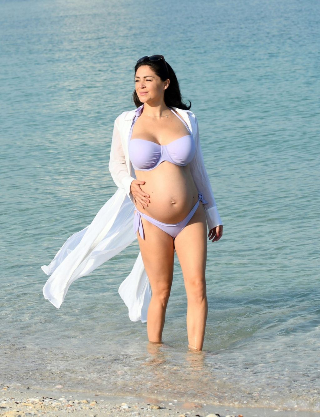 La estrella de reality Casey Batchelor es vista en una sesión de fotos para su aplicación de yoga en Dubái, 11/04/2019. La estrella de Celebrity Big Brother, que está casi de 7 meses embarazada de su segundo hijo, muestra su creciente barriga de embarazada con un bikini morado y un caftán blanco.