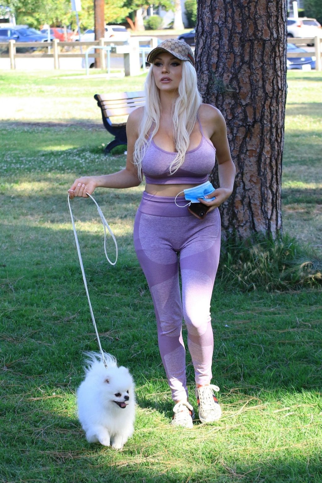 Courtney luce un escote pronunciado mostrando sus atributos con una camiseta sin mangas de cuello bajo, jeans rasgados y sandalias de piel.