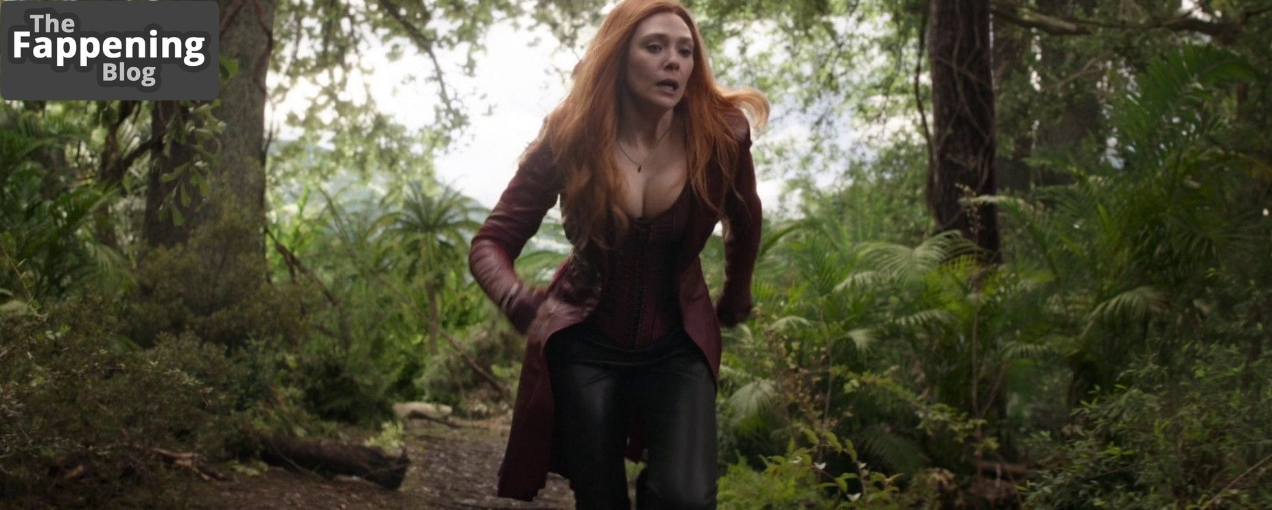 La estrella de The Fappening, Elizabeth Olsen, está totalmente en sintonía con su personaje de Marvel, Wanda, luciendo un look atrevido con un minivestido de cuero rojo y medias a juego. La actriz llega con un sexy vestido de Mugler a la fiesta de la revista Flaunt en Los Ángeles.
