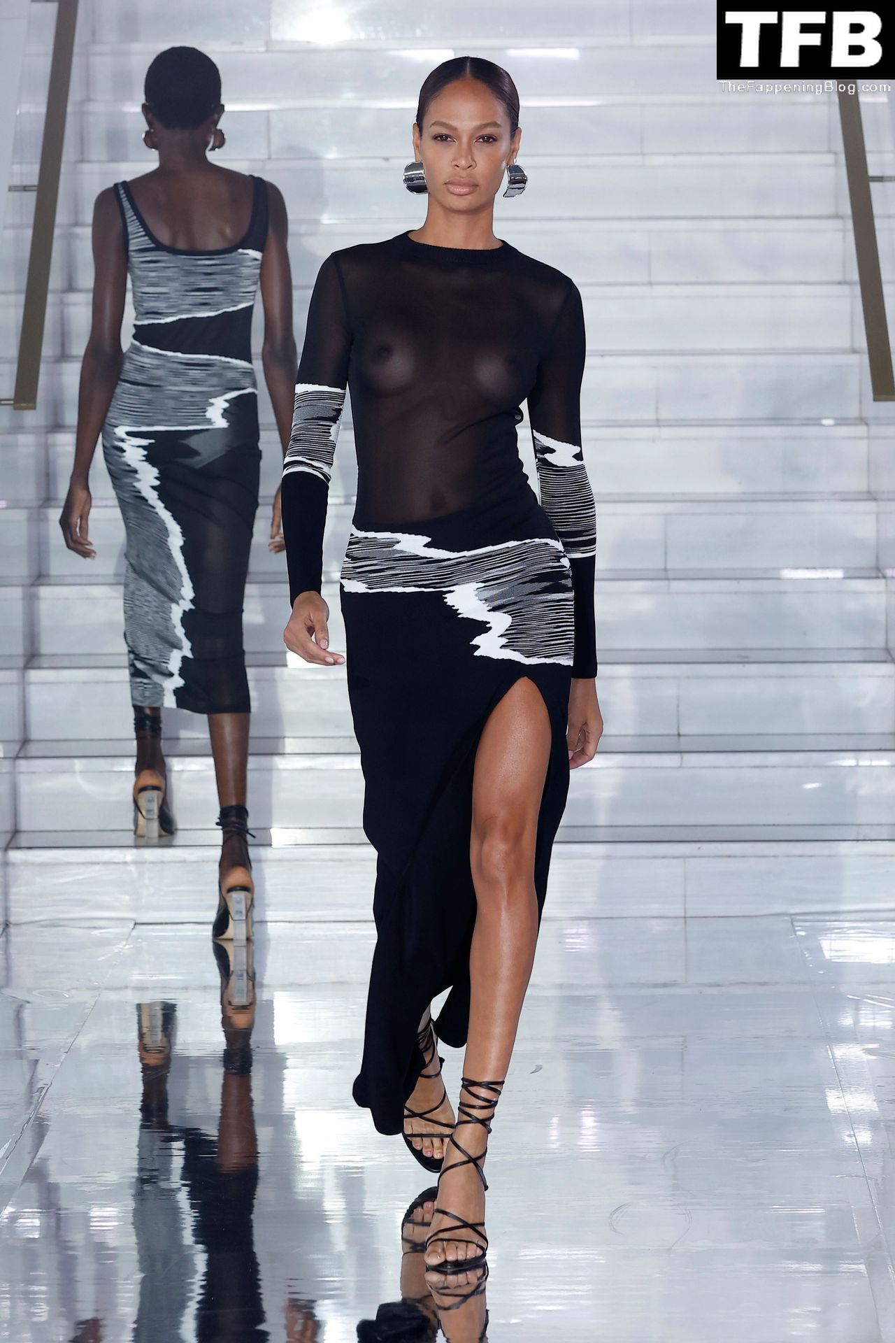 Gigi Hadid y Joan Smalls son vistas durante la Semana de la Moda de Milán en Milán, 23/09/2021. Joan muestra su pezón, usando un sostén transparente.