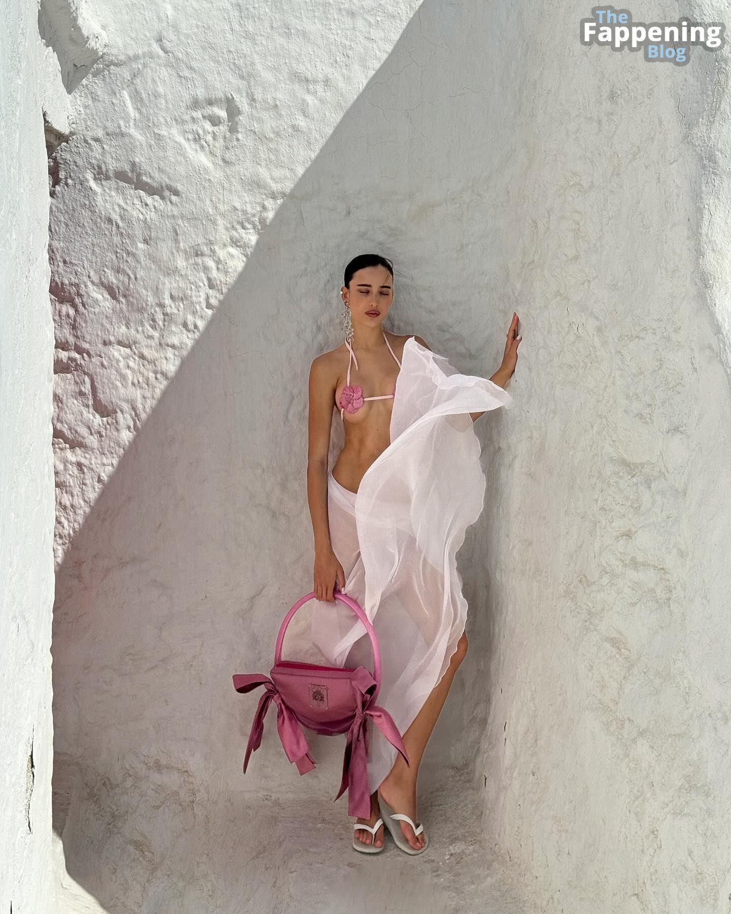 Échale un vistazo: Livia Nunes acaba de arrasar en una increíble sesión de fotos luciendo un bikini rosa único con flores de vidrio en lugar de un top tradicional.