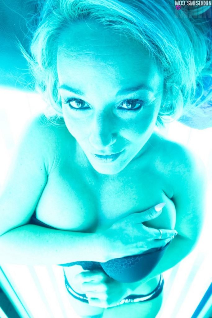 Hermosas fotos desnudas de Nikki Sims en una cama de bronceado. La chica mostró sus enormes pechos cremosos DD, pies y vello púbico durante el procedimiento de bronceado. La voluptuosa Nikki combinó negocios con placer y emocionó a sus fans.
