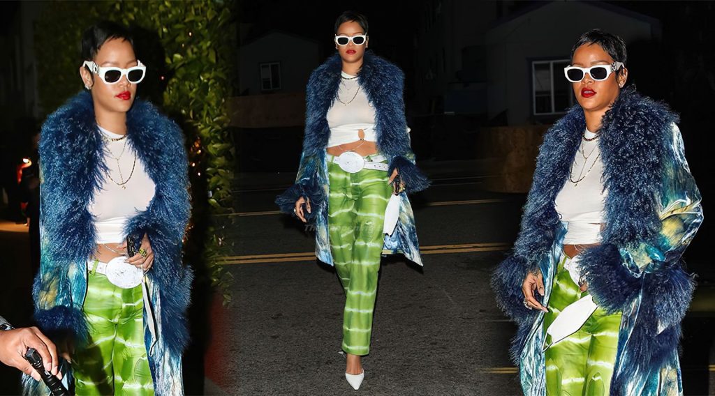La estrella barbadense del Fappening casi sufre un fallo de vestuario al llevar una blusa transparente que mostraba su pecho. Llevaba un abrigo de seda negro de Hermès con temática japonesa, pantalones deportivos negros y zapatillas Nike Dunks moradas. Complementó el look con joyas y gafas verdes de Gucci.