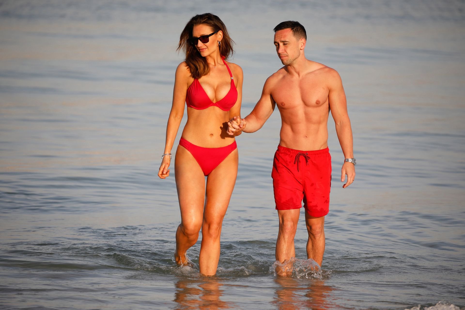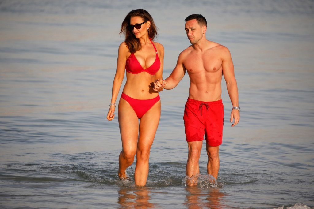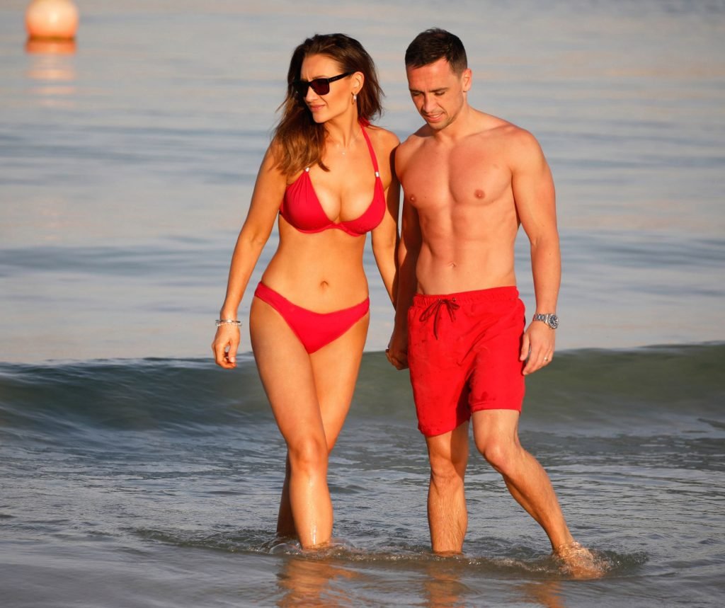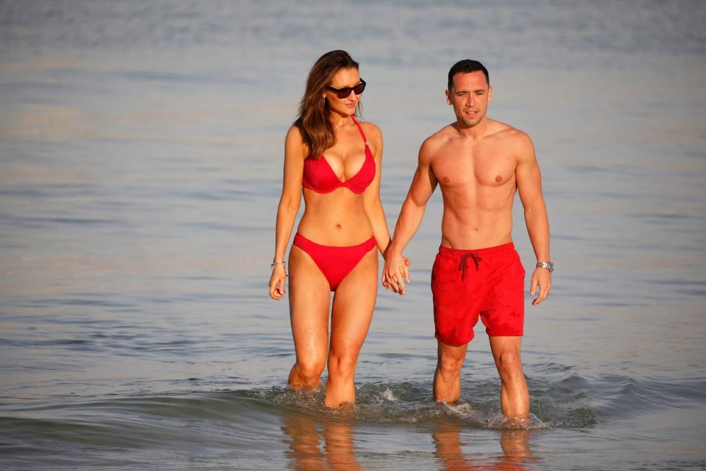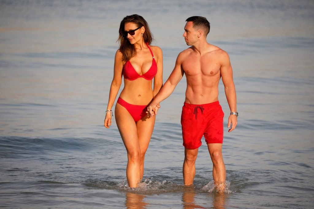 La actriz con busto Catherine Tyldesley fue vista en un bikini rojo en la playa del Hotel Le Royal Meridien en Dubái, 30/03/2019.
