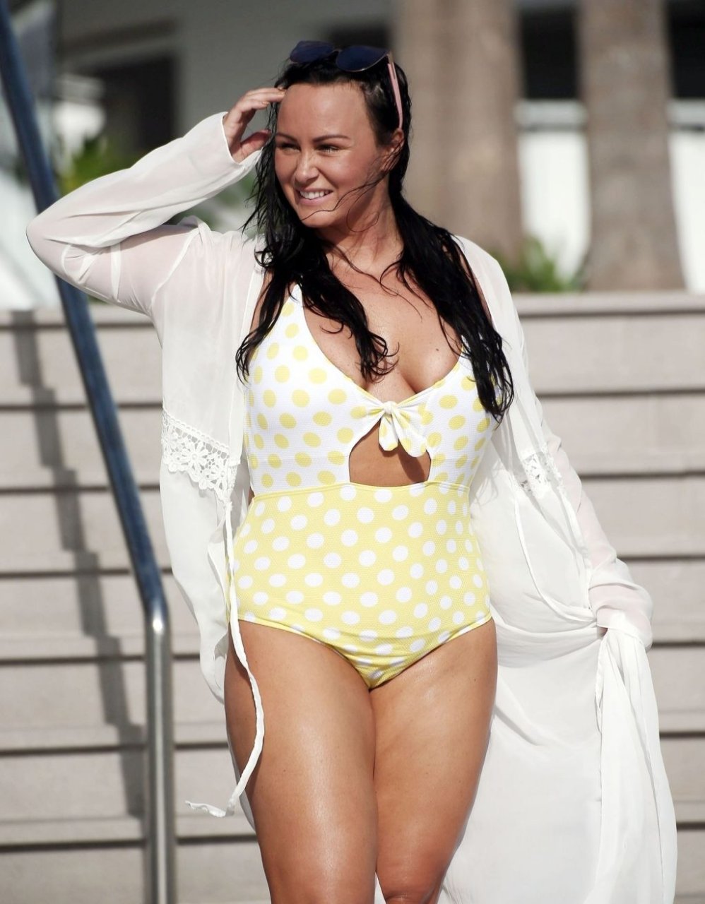 Chanelle lucía genial con su sexy traje de baño amarillo con lunares mientras se relajaba bajo el ardiente sol otoñal.