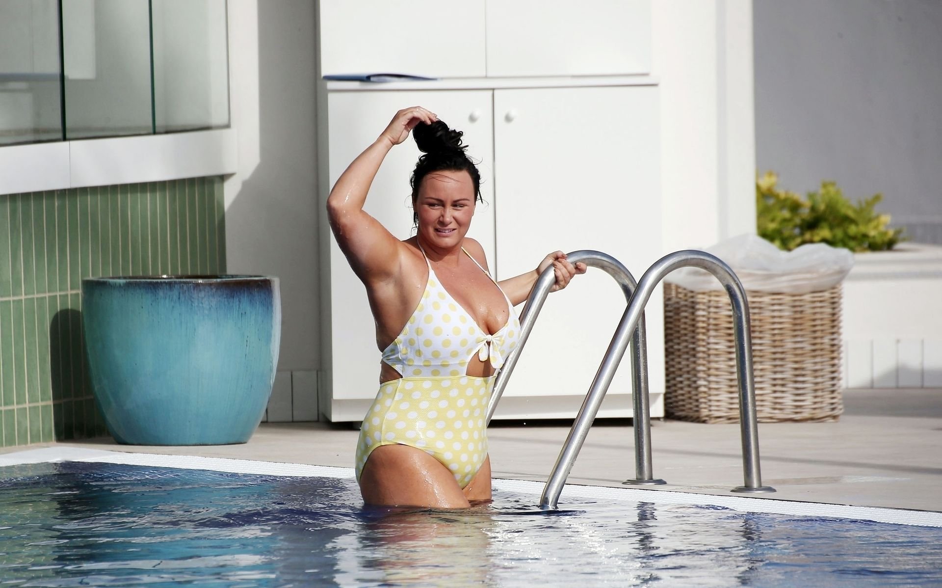 Chanelle lucía genial con su sexy traje de baño amarillo con lunares mientras se relajaba bajo el ardiente sol otoñal.