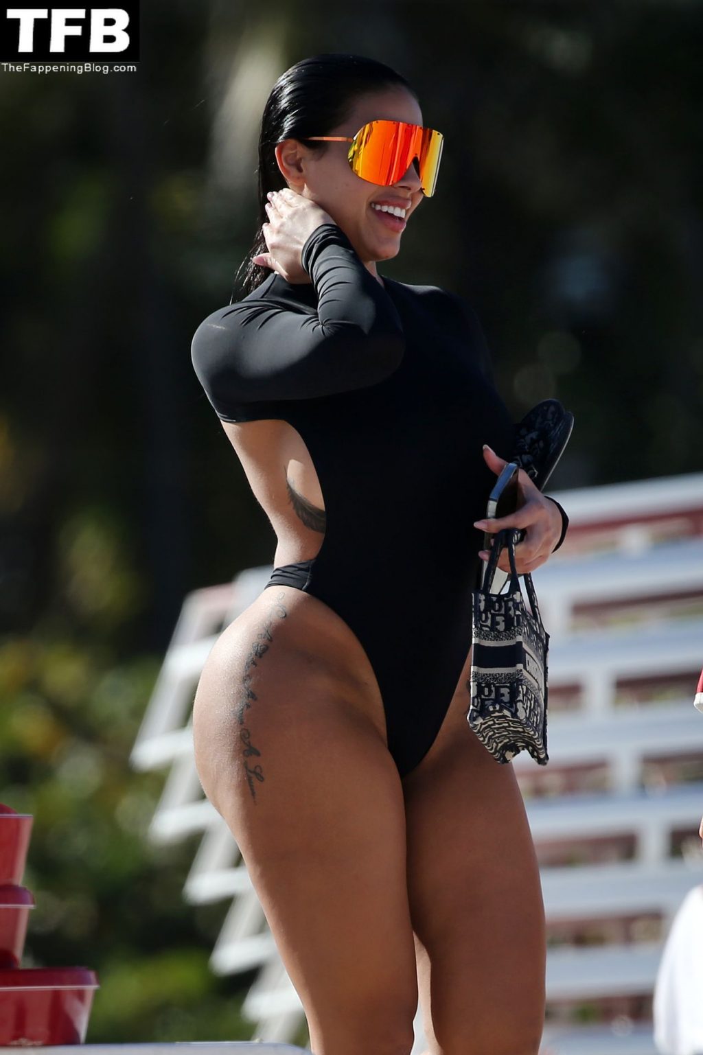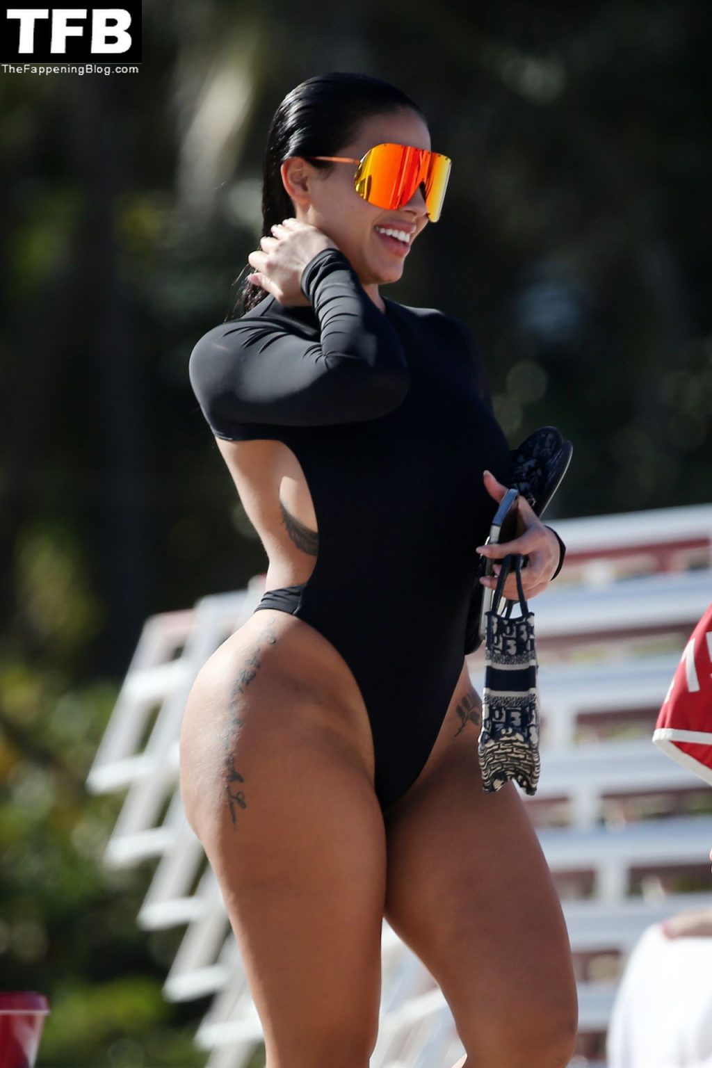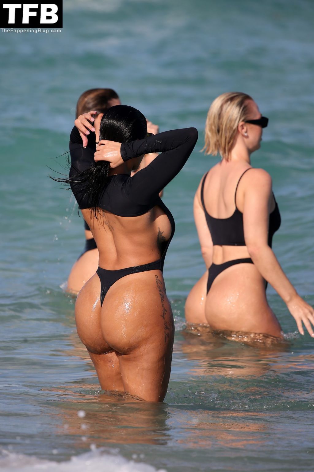 La última musa de Kanye West, Chaney Jones, presume sus curvas en un traje de baño de una pieza revelador mientras disfruta de la playa con la diseñadora de trajes de baño Bianca Elouise en Miami, 23/02/2022.