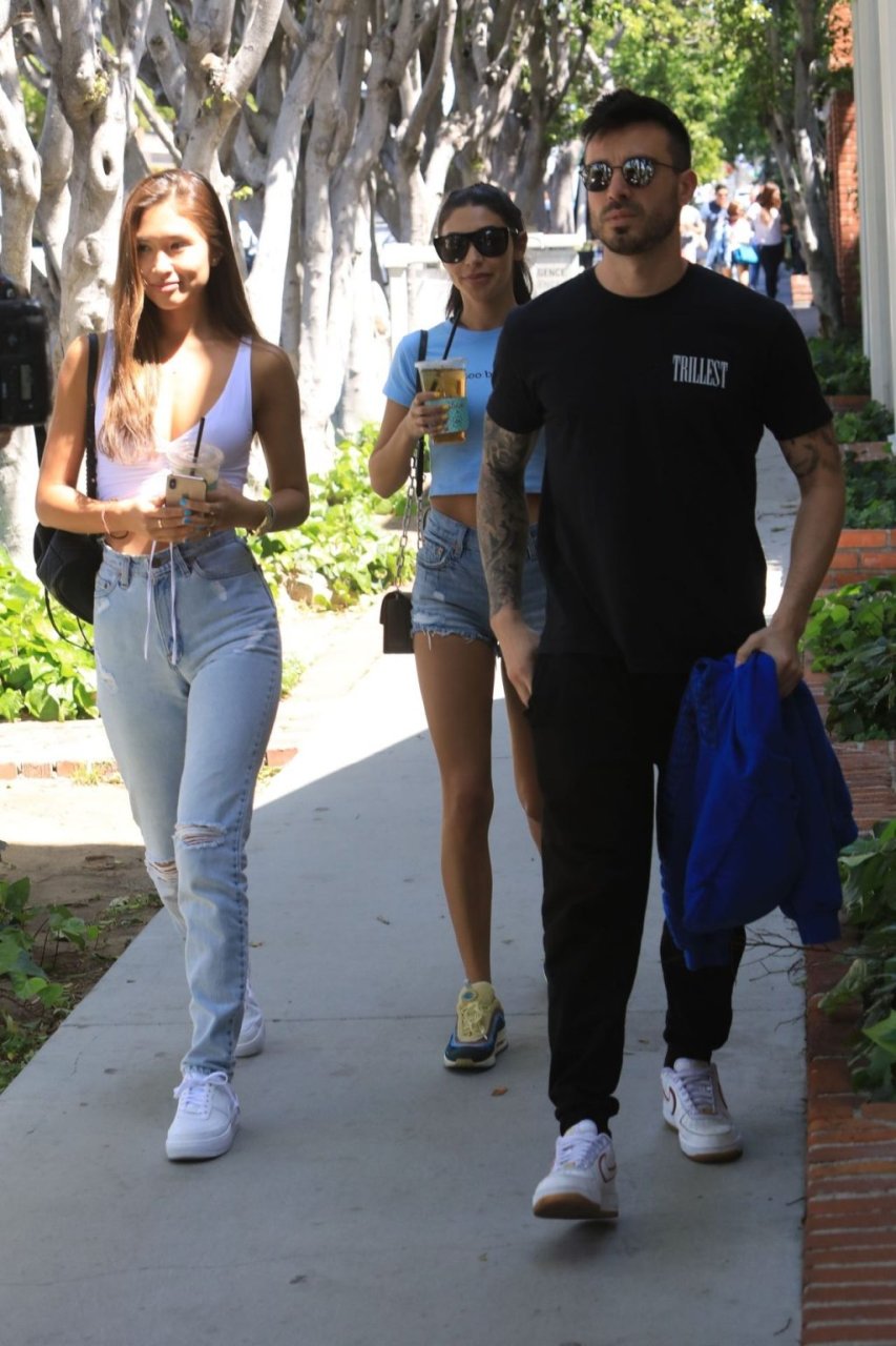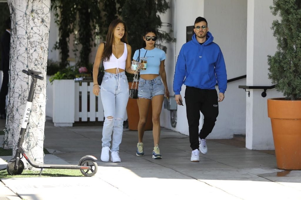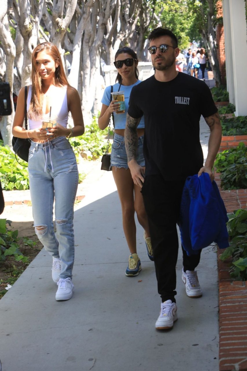 Modelo y DJ Chantel Jeffries está lista para el verano mientras sale con amigos en Los Ángeles, 10/04/2019. La modelo lleva un crop top azul bebé con la inscripción “Too Busy” y shorts de mezclilla de cintura alta y corte. Chantel completa su look con las codiciadas Sean Wotherspoon Air Max 97/1, las zapatillas perfectas para el verano.