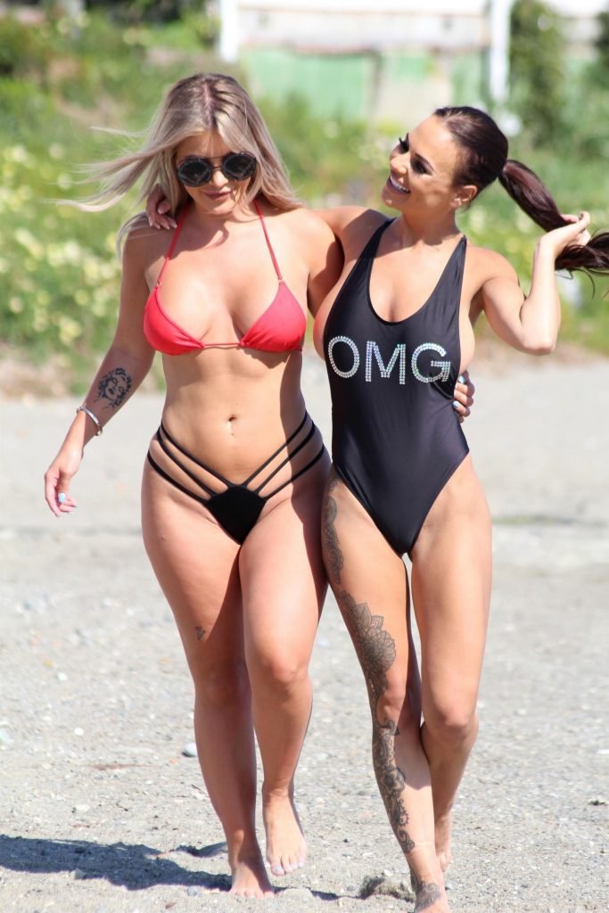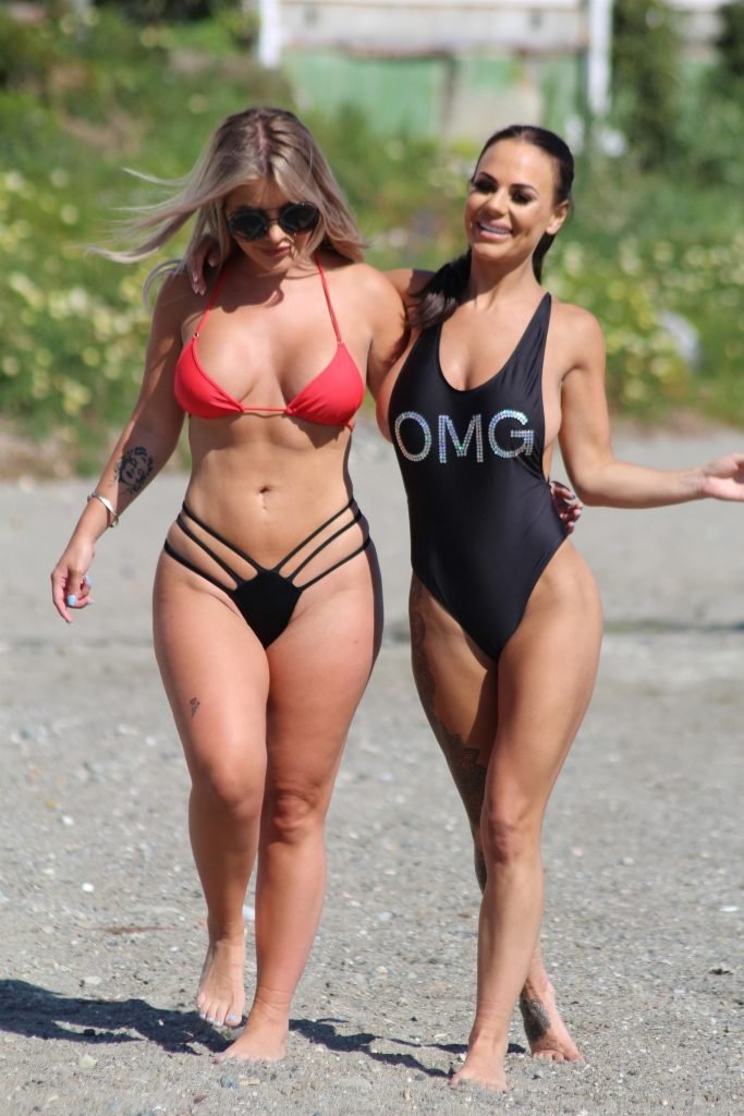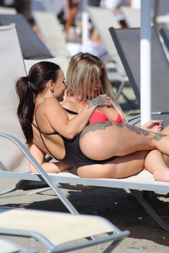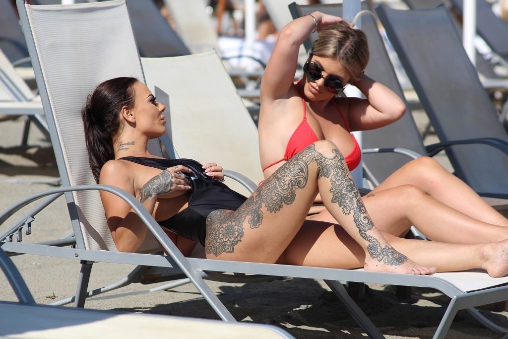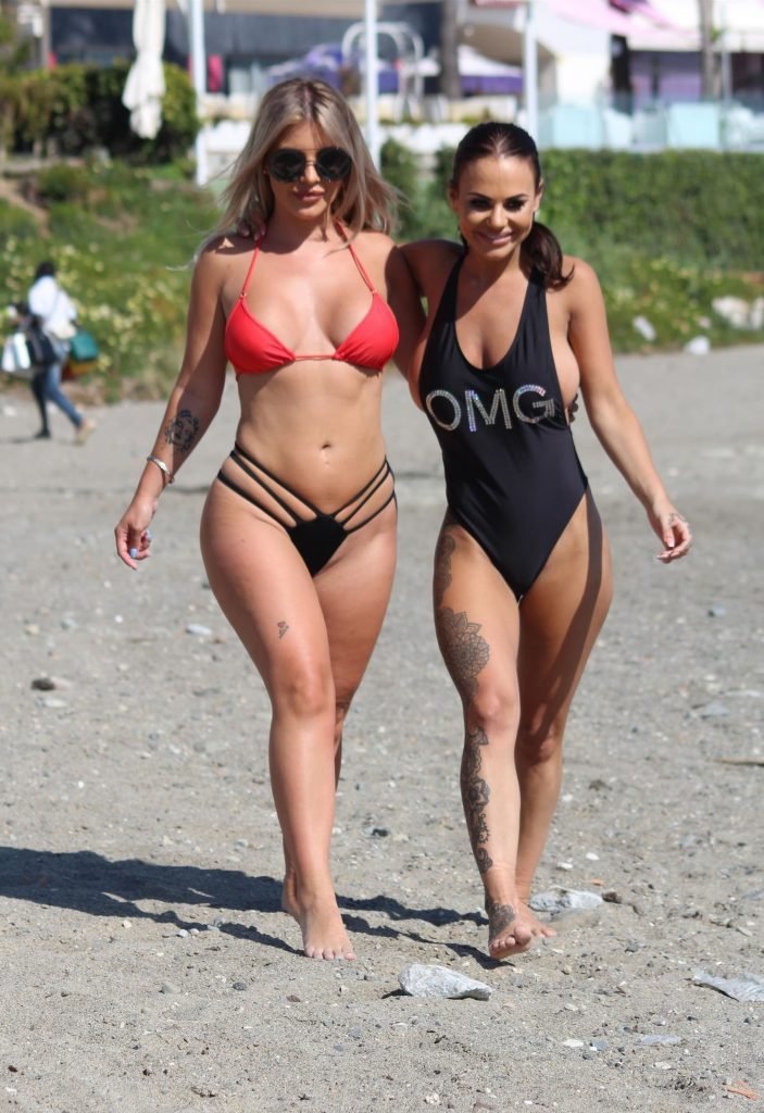 Former Geordie Shore (TV) babe Chantelle Connelly fue vista con Lois Molloy (Serene Cosmetic) aplicándose crema solar mutuamente mientras estaban en la playa en Marbella, 05/10/2018. Chantelle voló para una consulta antes de su segundo procedimiento con el servicio de cirugía estética de lujo. Lois apareció con un sexy bikini rojo mientras Chantelle deslumbraba a los turistas con su traje de baño negro OMG.