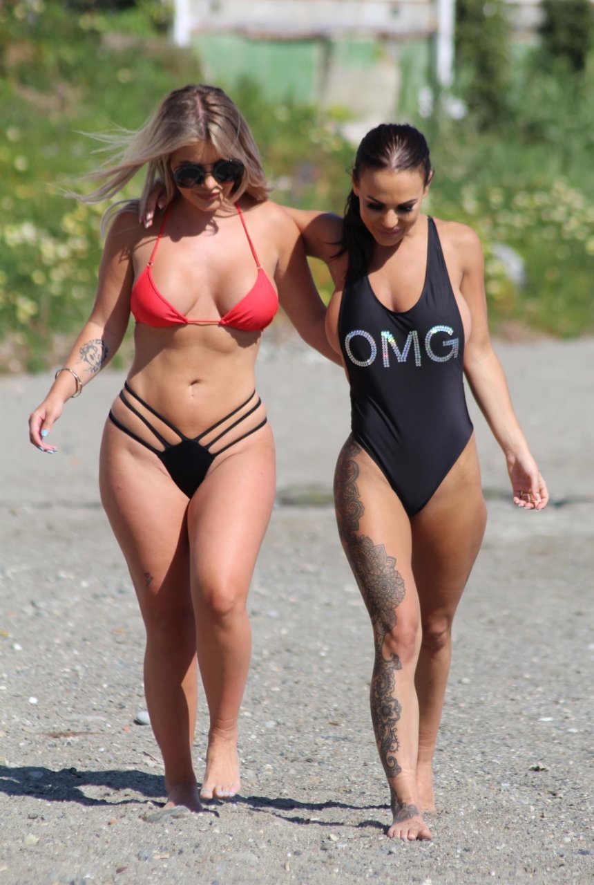 Former Geordie Shore (TV) babe Chantelle Connelly fue vista con Lois Molloy (Serene Cosmetic) aplicándose crema solar mutuamente mientras estaban en la playa en Marbella, 05/10/2018. Chantelle voló para una consulta antes de su segundo procedimiento con el servicio de cirugía estética de lujo. Lois apareció con un sexy bikini rojo mientras Chantelle deslumbraba a los turistas con su traje de baño negro OMG.
