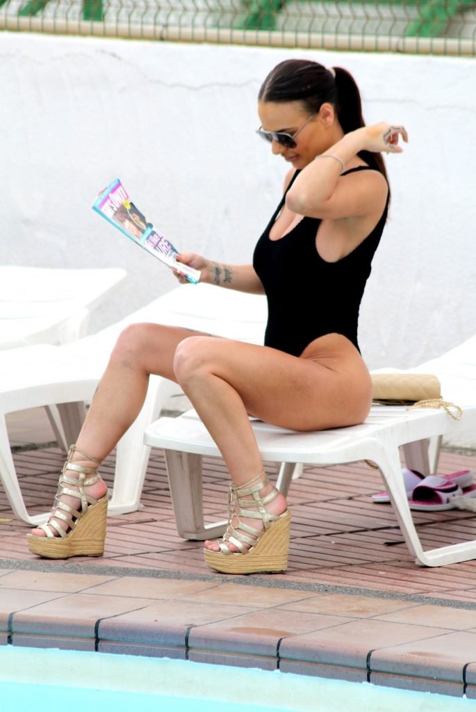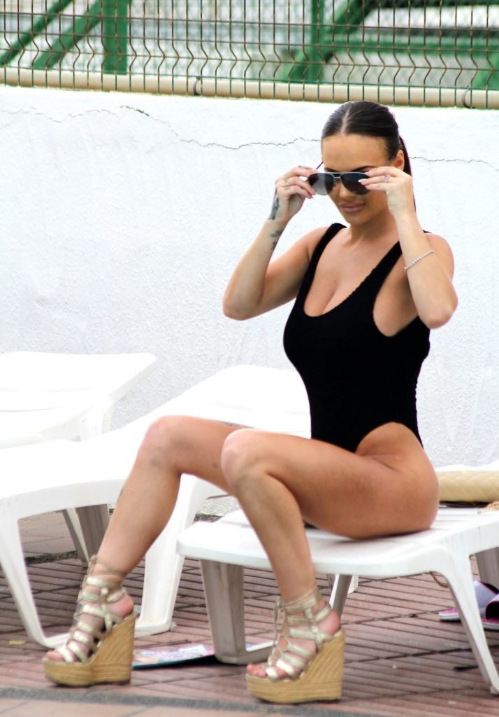 Ex-personalidad de Geordie Shore, Chantelle Connelly, mostrando una exhibición sexy junto a la piscina con un traje de baño tanga negro mientras está de vacaciones en Gran Canaria, España, 23/04/2018. La estrella de televisión de realidad de 28 años se relajó en la tumbona tomando algunos rayos del cálido sol español.