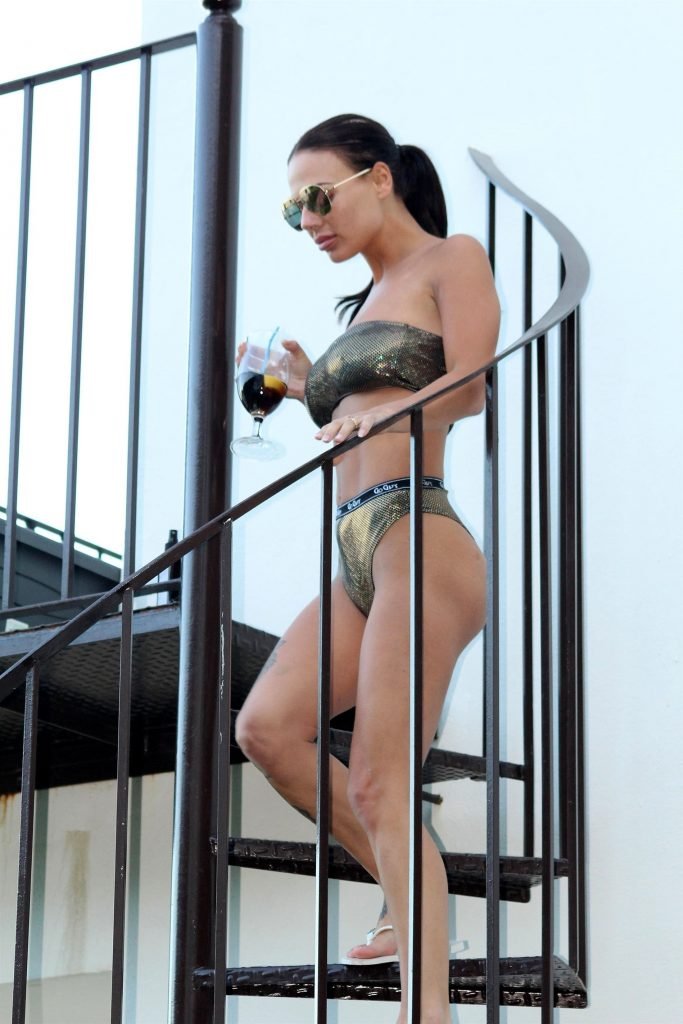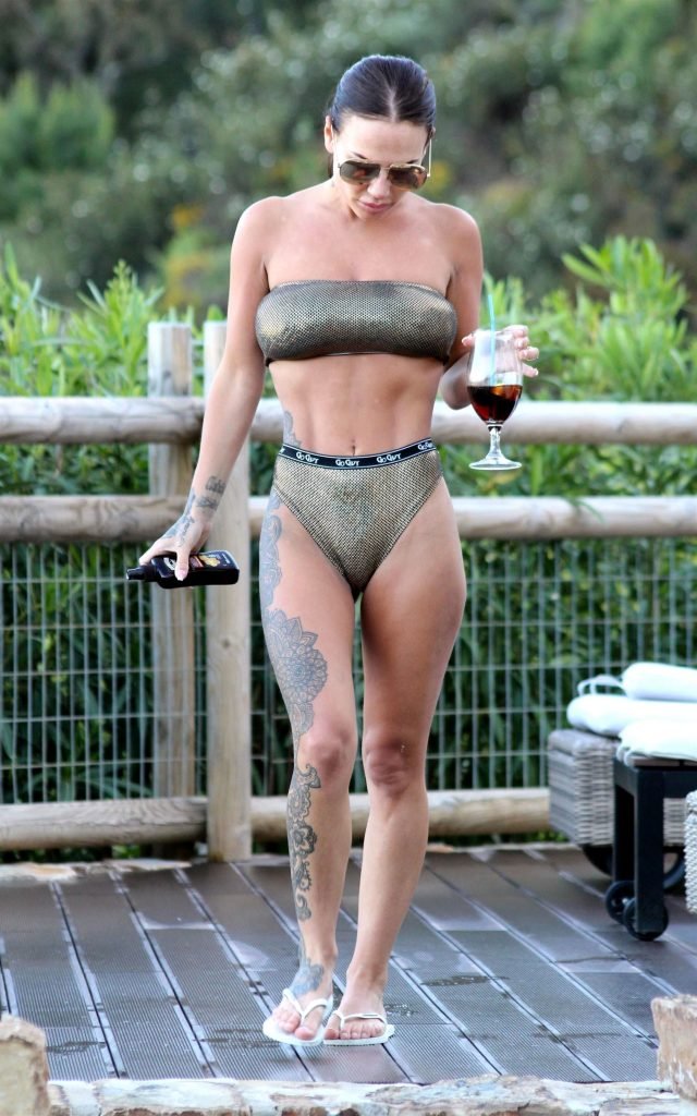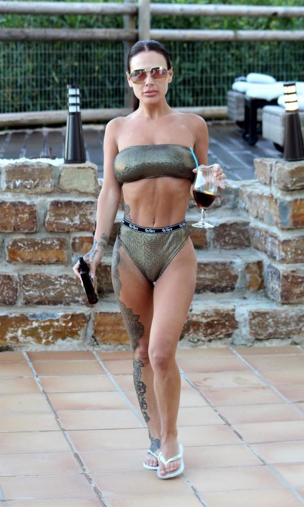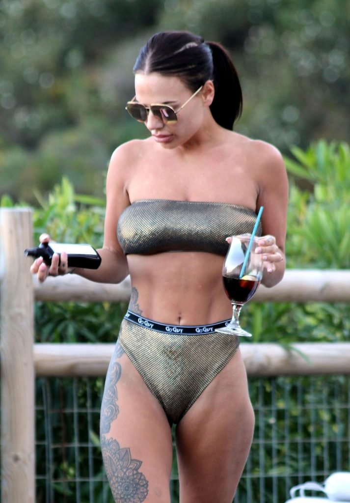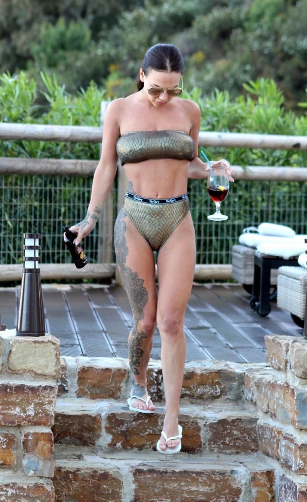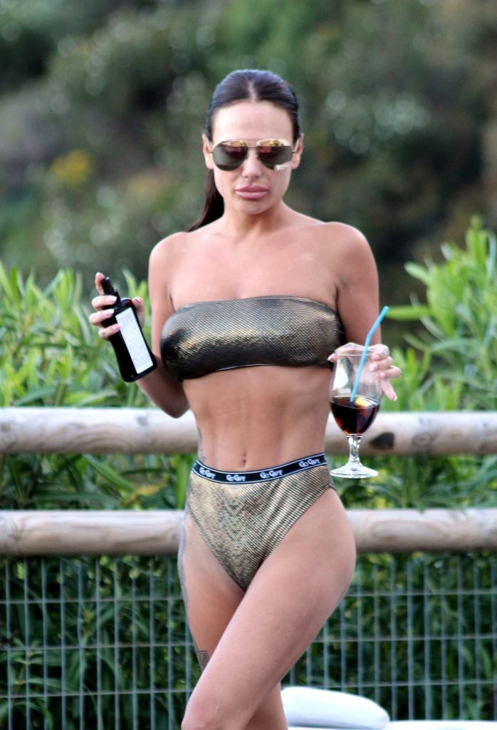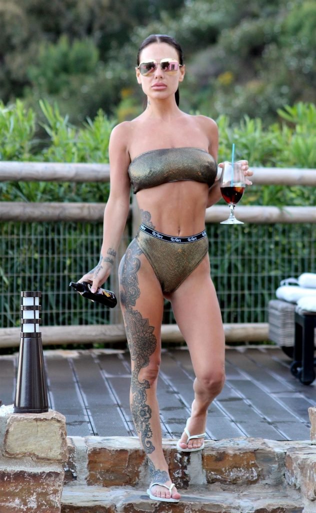 La ex personalidad de Geordie Shore, Chantelle Connelly, 28, disfruta de una copa de Sangría mientras muestra su sexy cuerpo tatuado junto a la piscina durante sus vacaciones en Marbella, España, 05/05/2018.