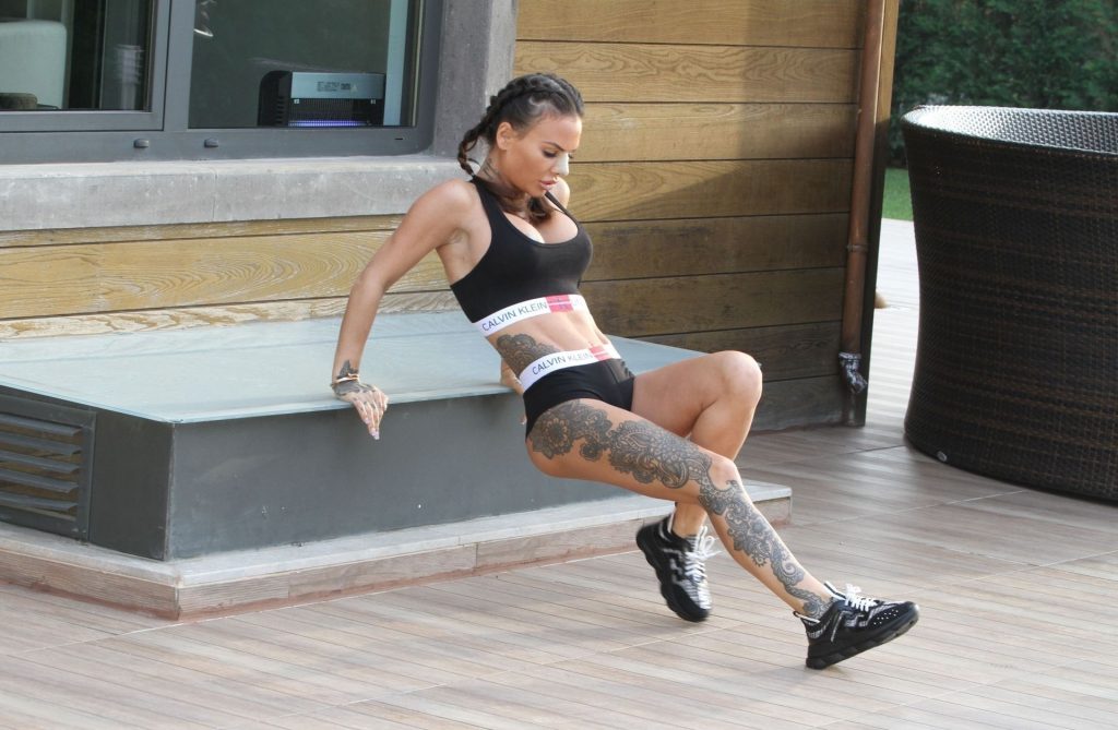 Chantelle lucía deportiva con su sujetador deportivo Gucci y mostrando su impresionante colección de tatuajes mientras hace ejercicio en sus vacaciones en Turquía, manteniendo su cuerpo tonificado en forma.