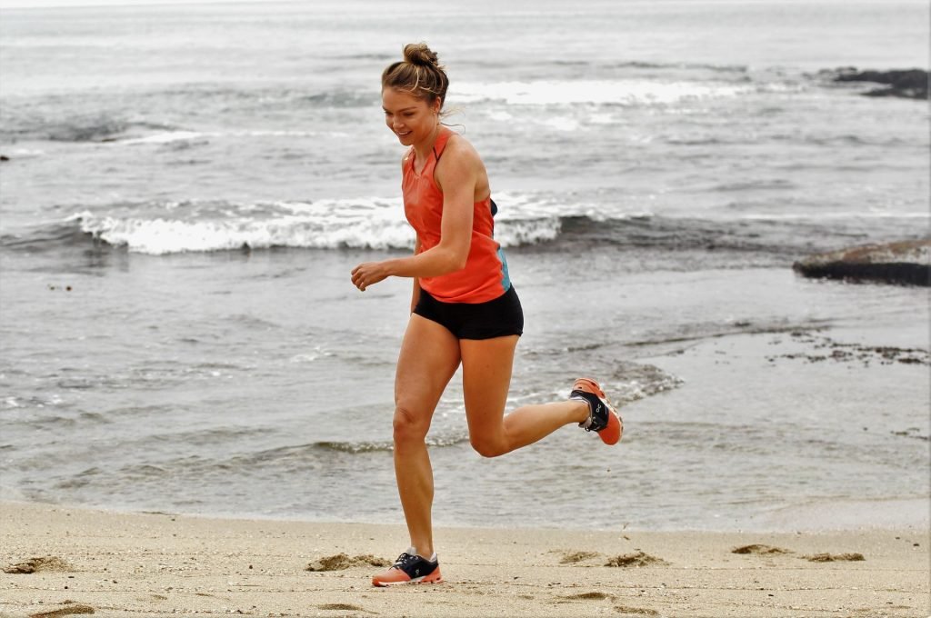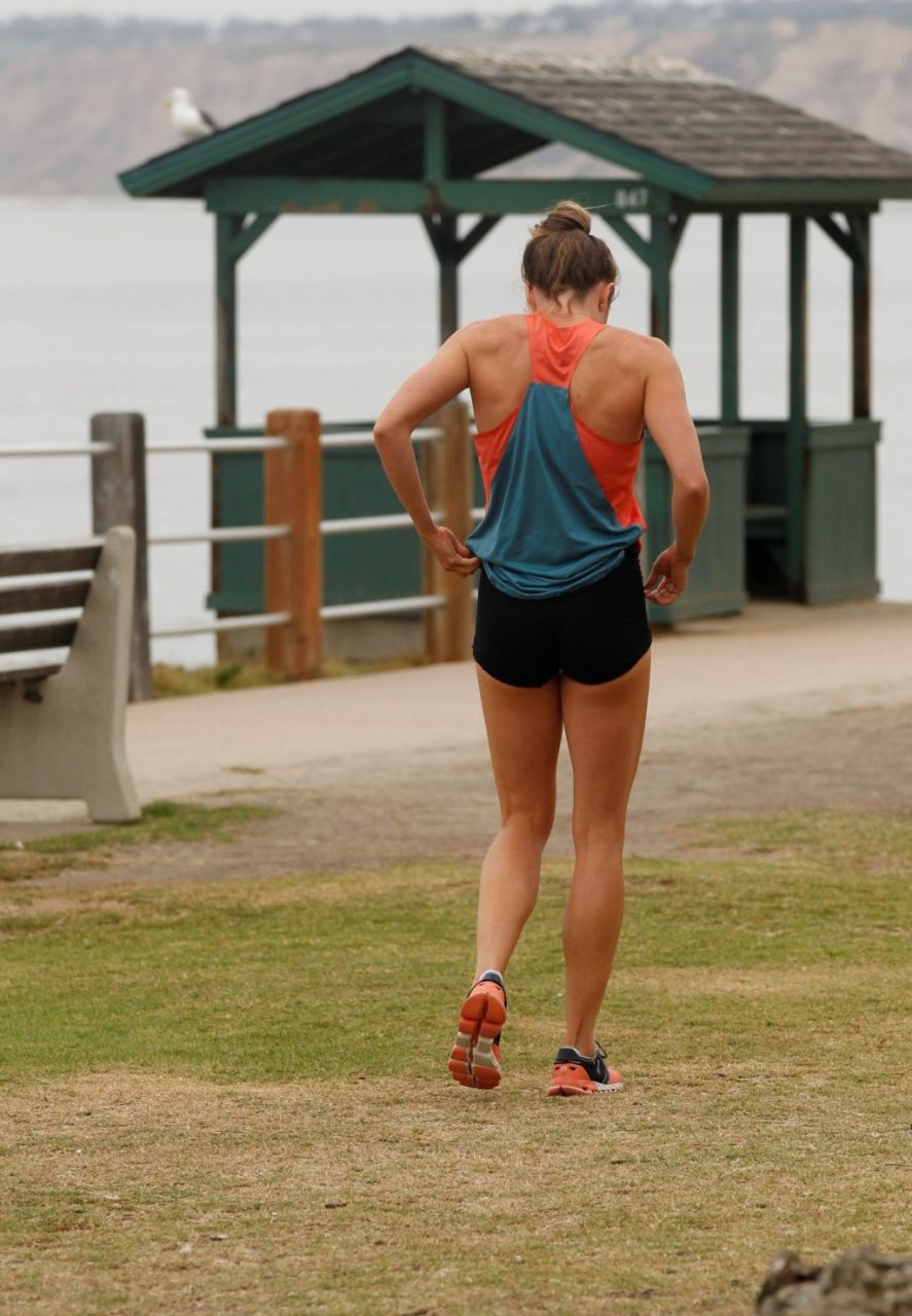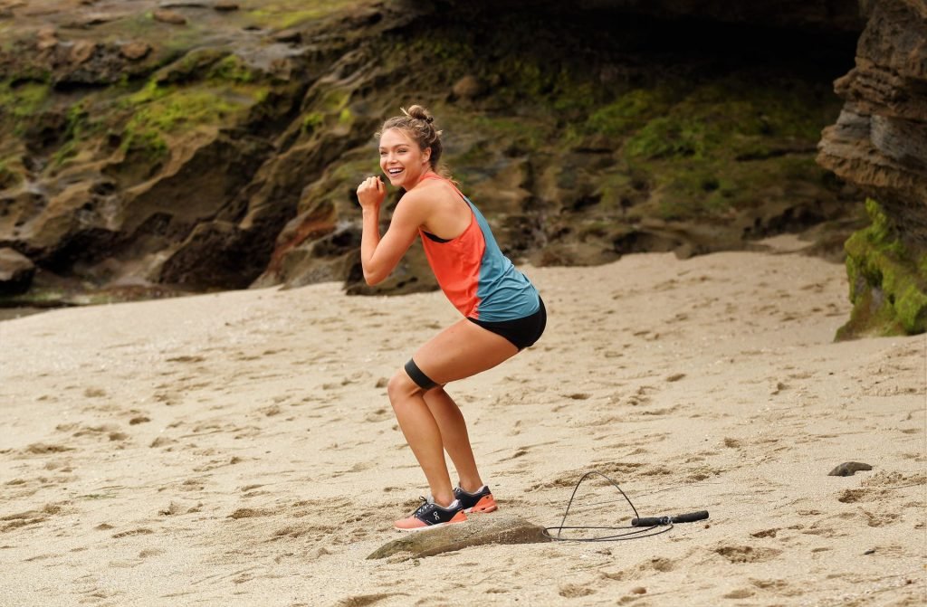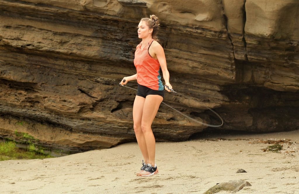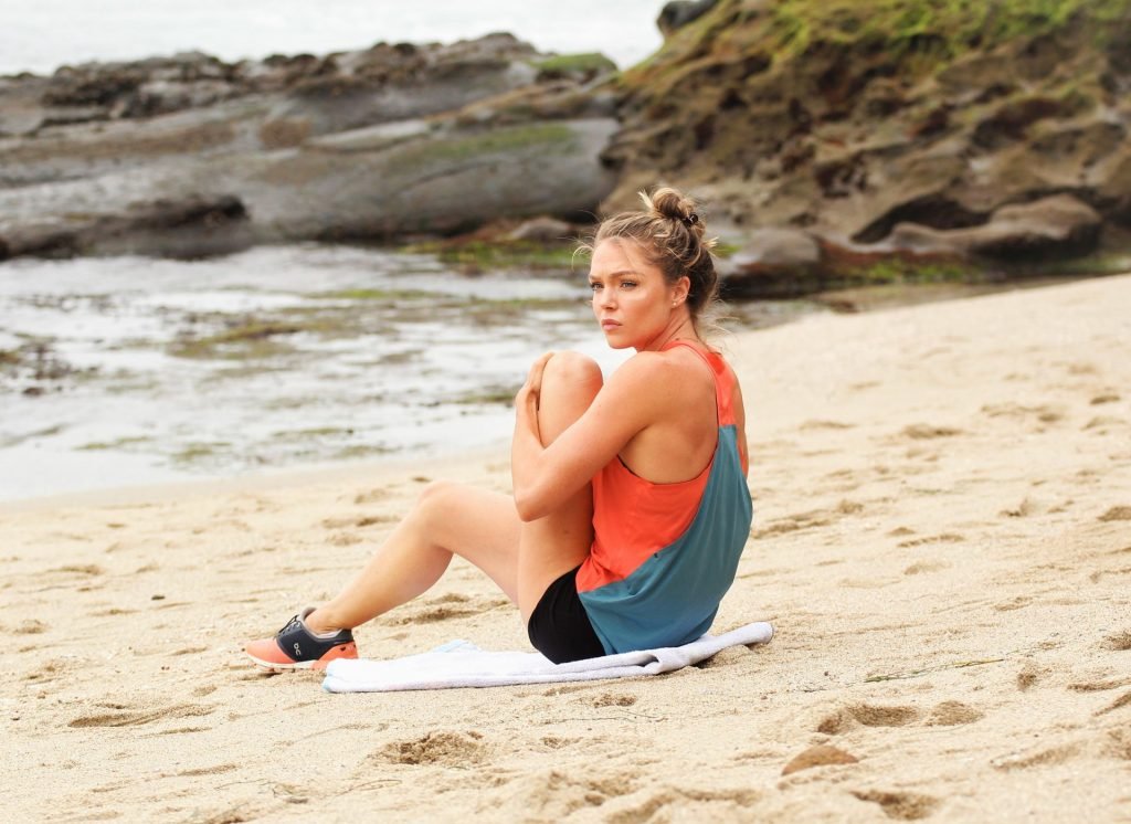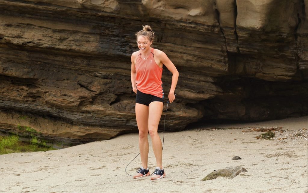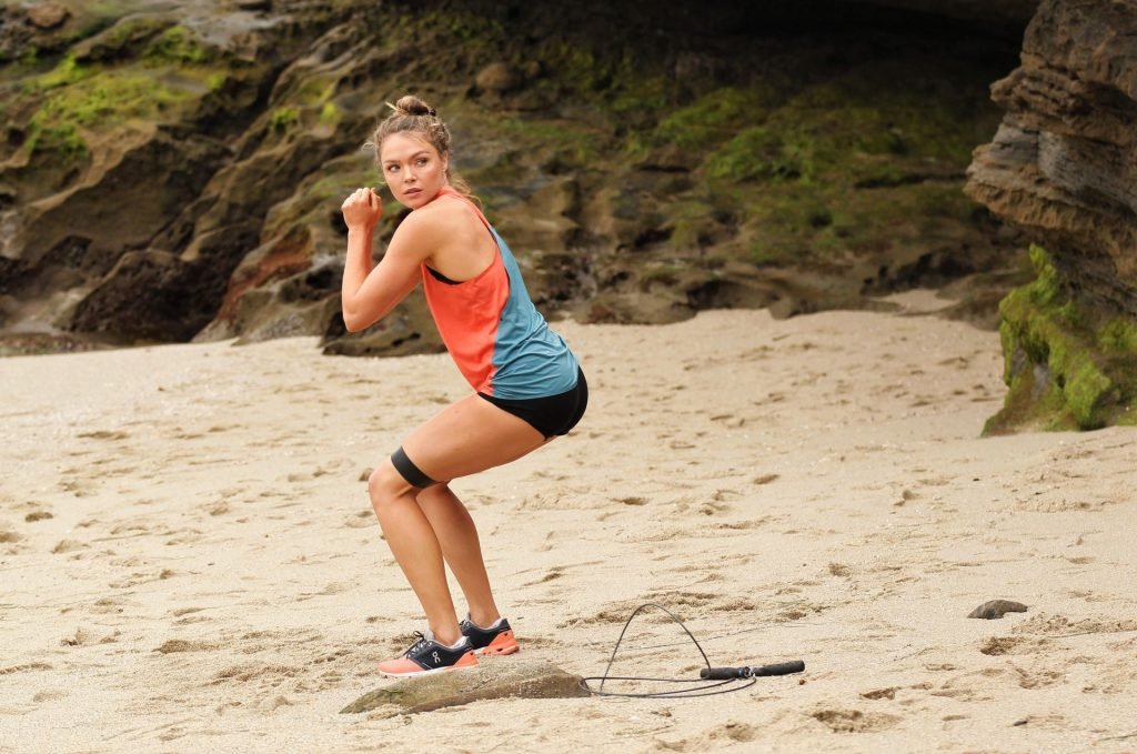 Heptatleta Chari Hawkins, una de las esperanzas del equipo de EE.UU. para medallas en atletismo en los Juegos Olímpicos de Tokio del próximo año, fue vista trotando y estirándose en las arenas de la playa de San Diego, 07/09/2019.