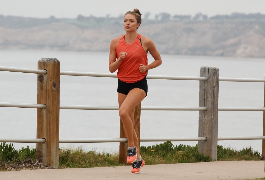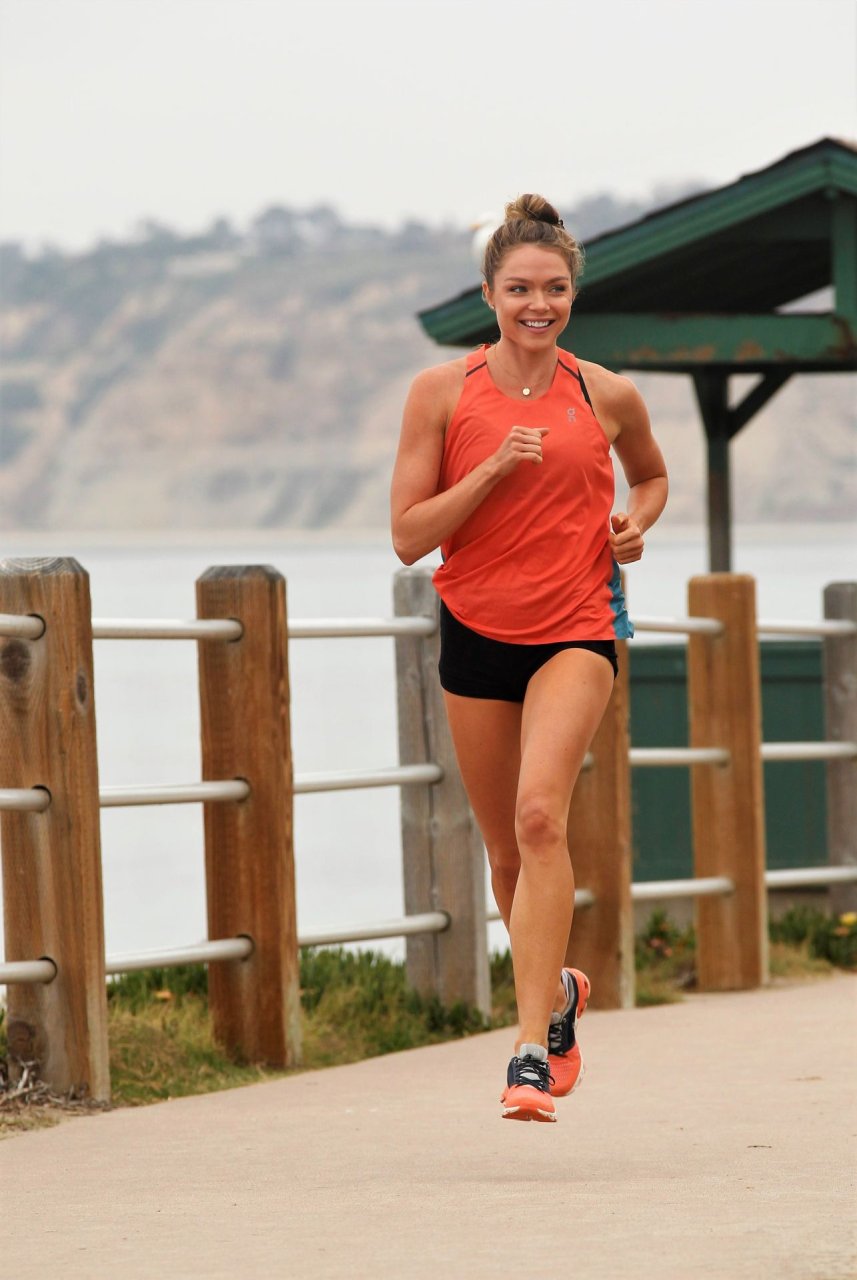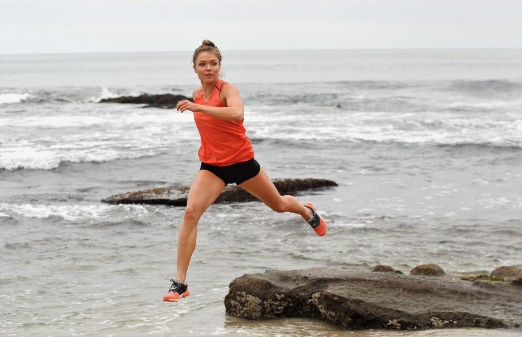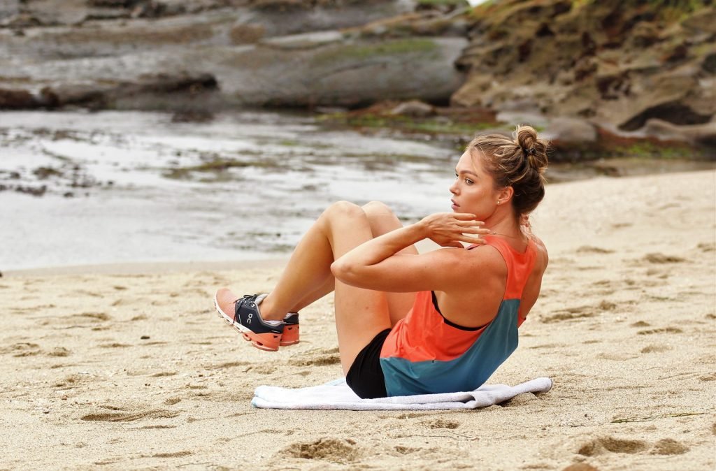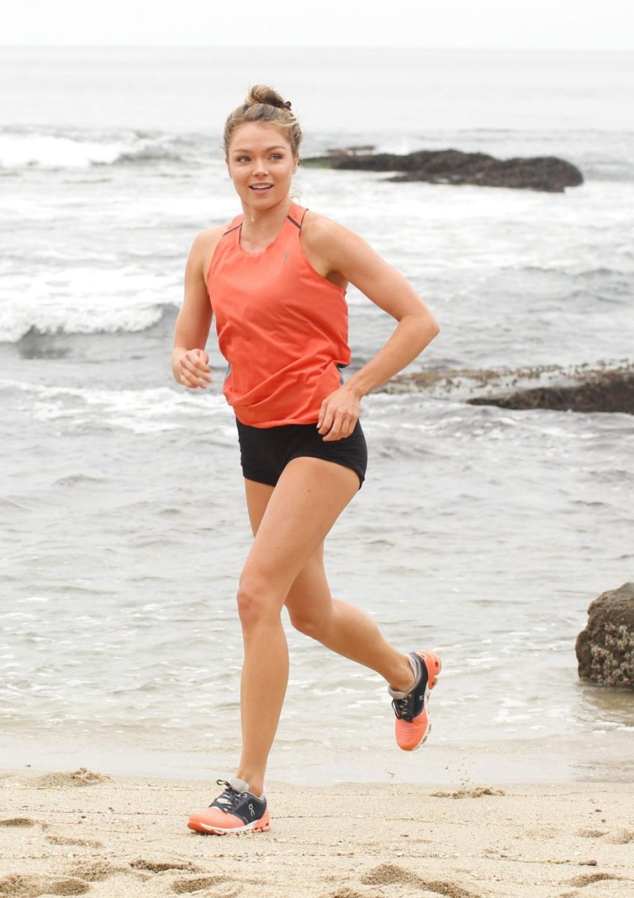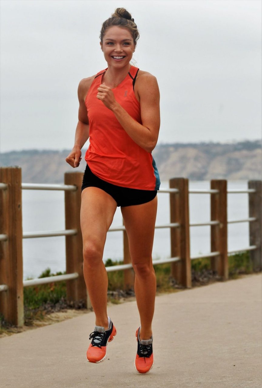 Heptatleta Chari Hawkins, una de las esperanzas del equipo de EE.UU. para medallas en atletismo en los Juegos Olímpicos de Tokio del próximo año, fue vista trotando y estirándose en las arenas de la playa de San Diego, 07/09/2019.