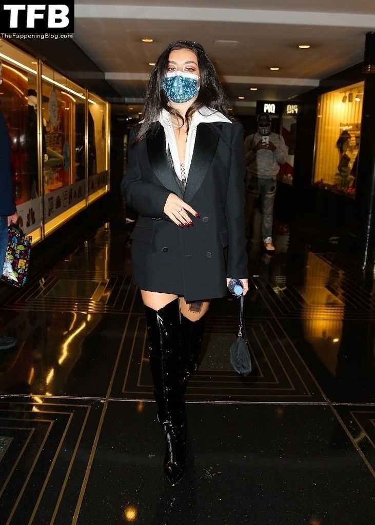 Singer Charli XCX expone su pecho desnudo con el pezón visible mientras lleva un sostén transparente al llegar a los ensayos de Saturday Night Live en los estudios de NBC en Nueva York, 16/12/2021.