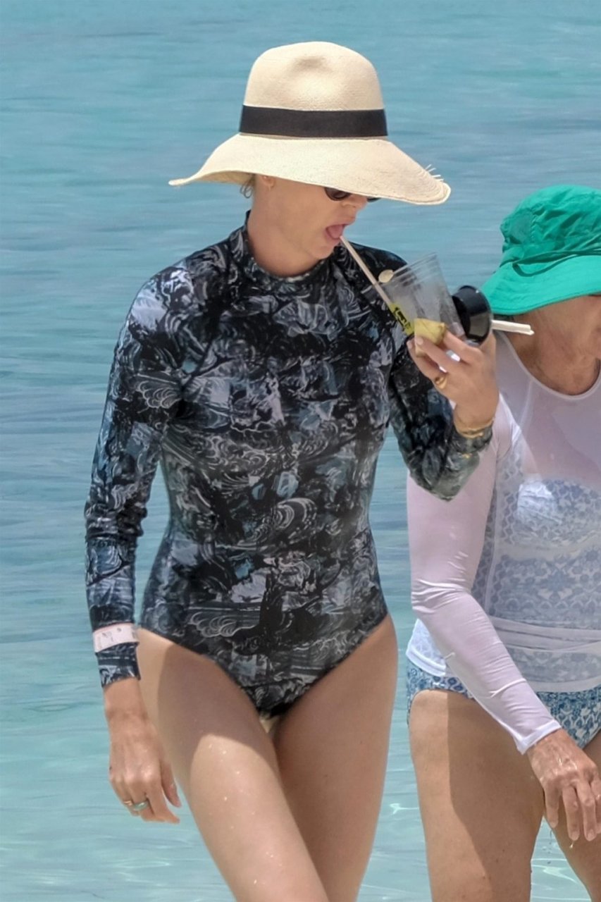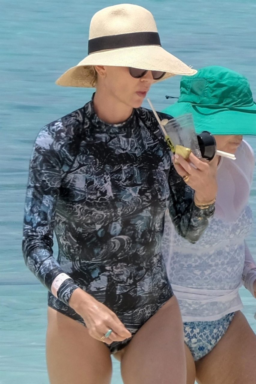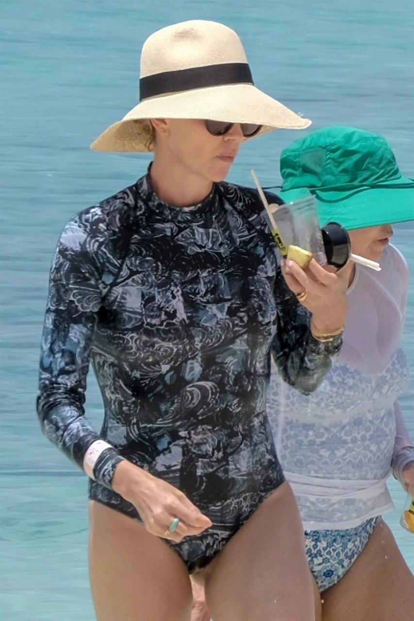 La actriz Charlize Theron (43) disfruta de un día en playas de arena y sol en el mundialmente famoso Atlantis Bahamas Resort con su madre Gerda Jacoba Aletta Maritz, 18/08/2018. La feliz familia disfrutó de algunos cócteles frutales mientras se refrescaban en las aguas cristalinas y azules.
