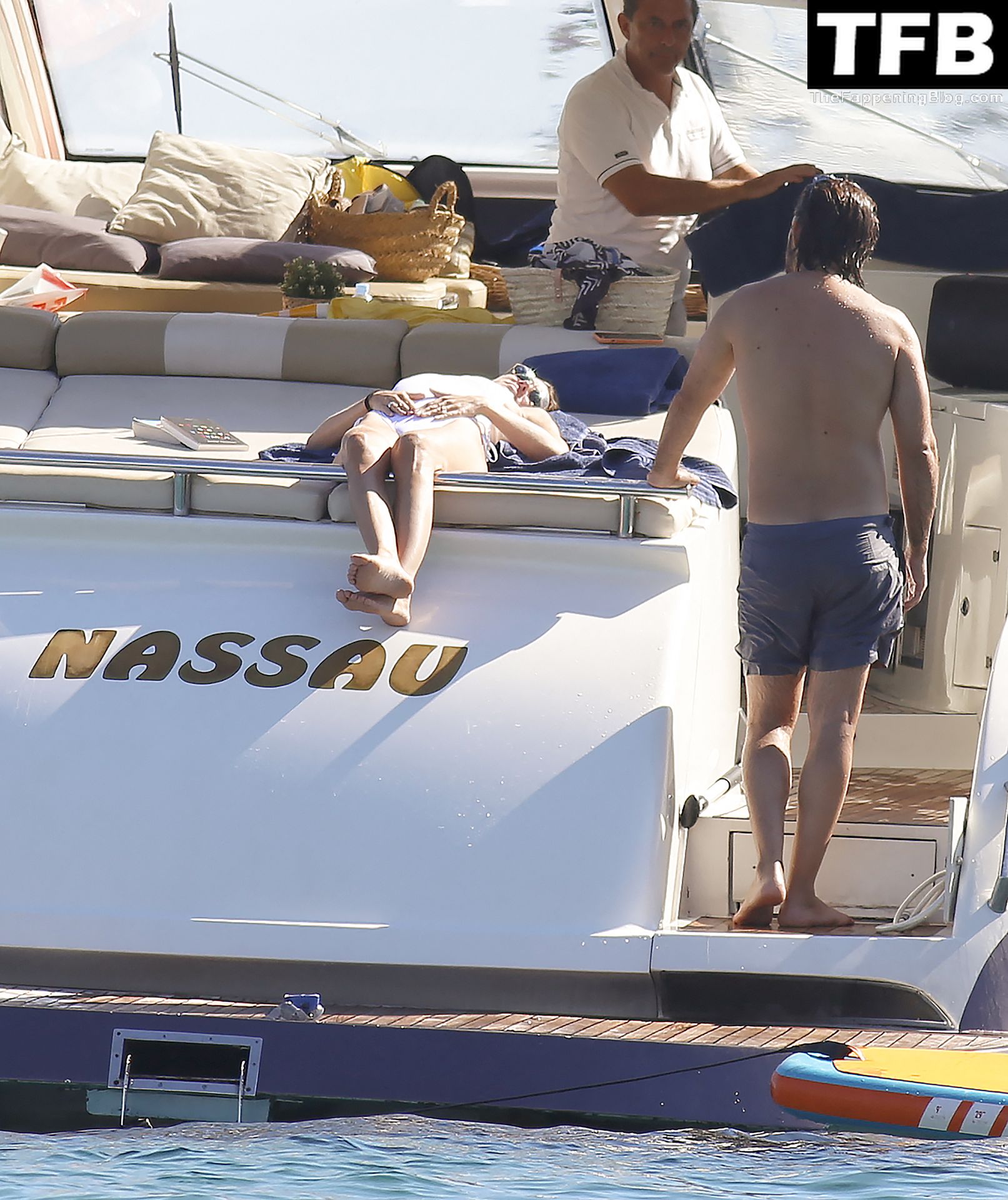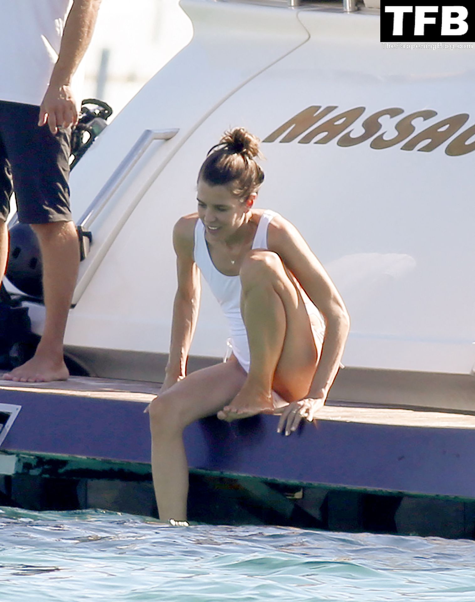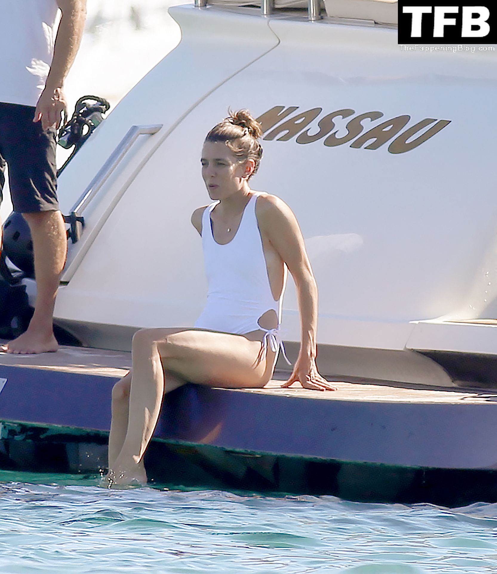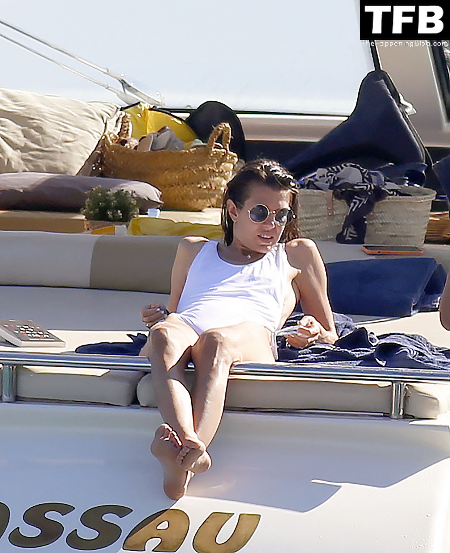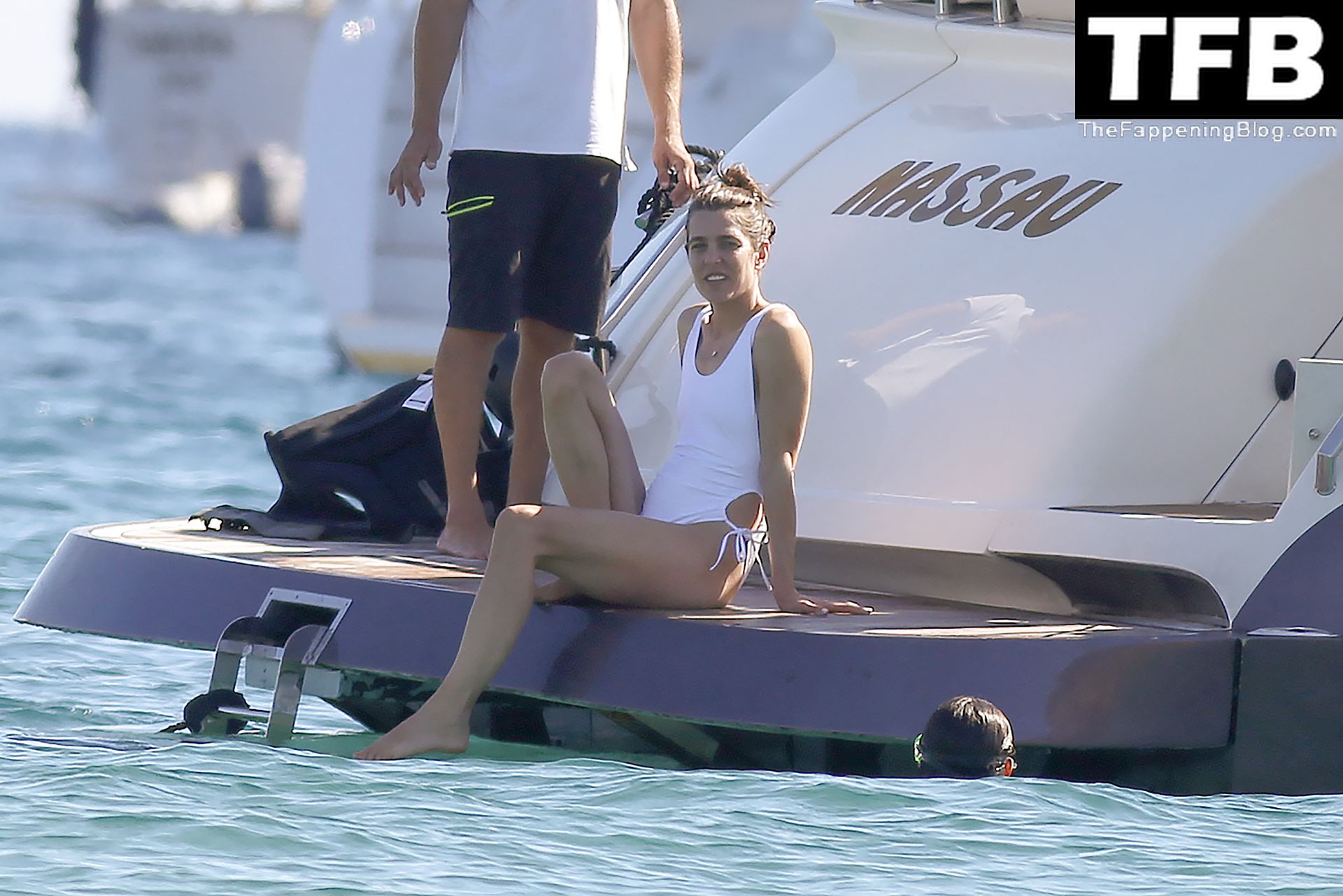 La modelo monegasca, socialité, escritora, editora, ecuestre, periodista, productora de cine y humanitaria Charlotte Casiraghi luce espectacular con un traje de baño blanco a bordo de un yate mientras disfruta de un baño en el mar con su esposo Dimitri Rassam en Ibiza, España, 19/08/2022.