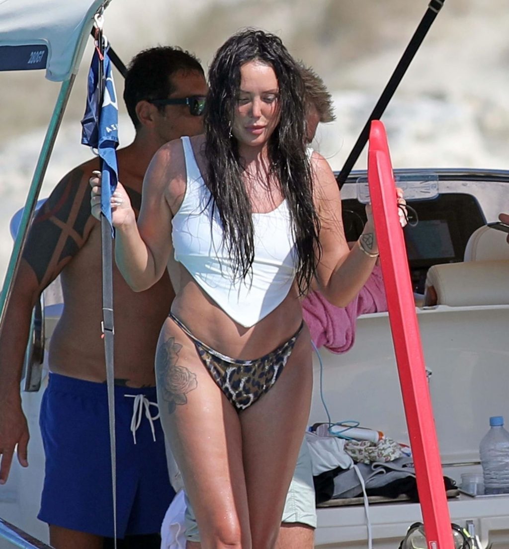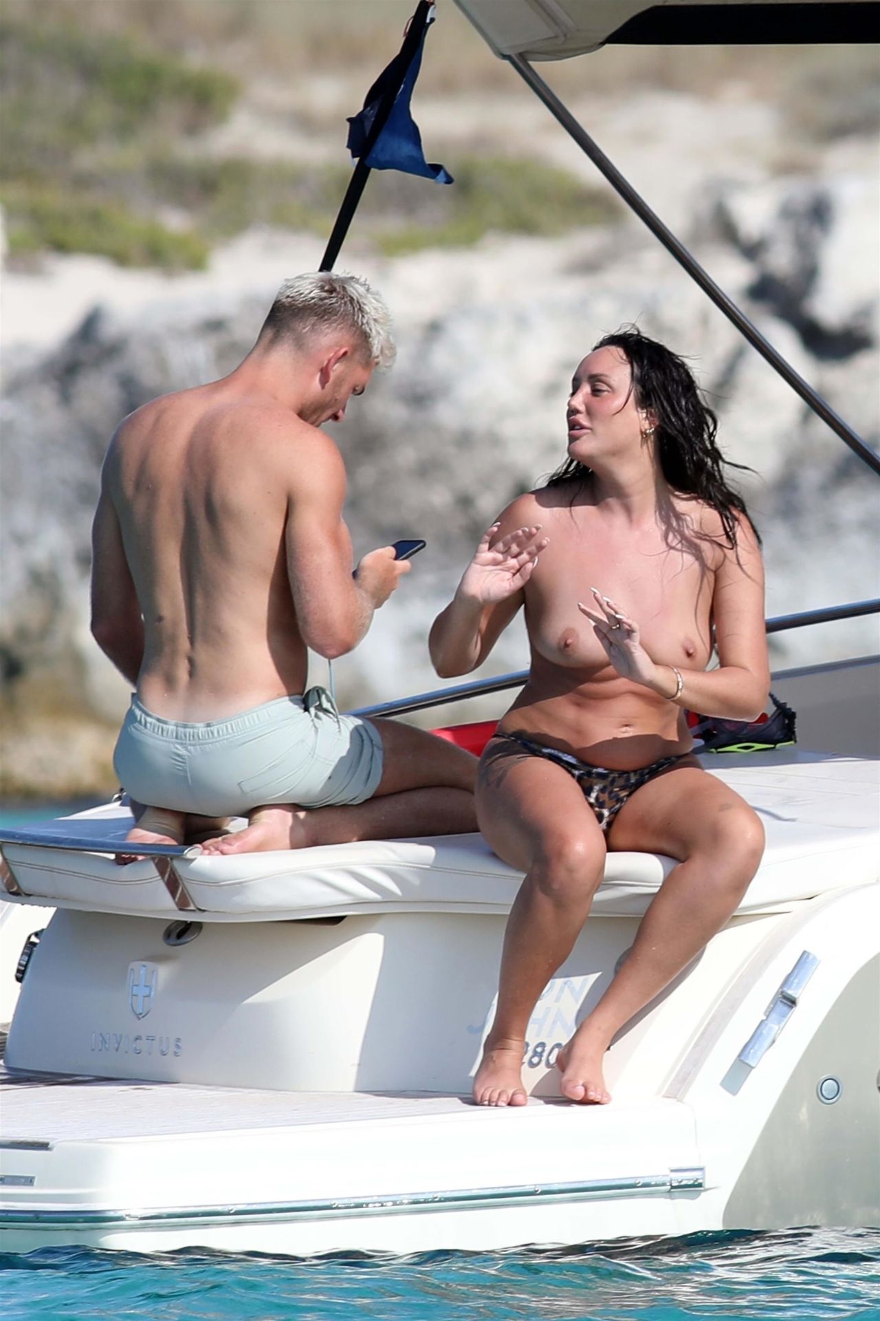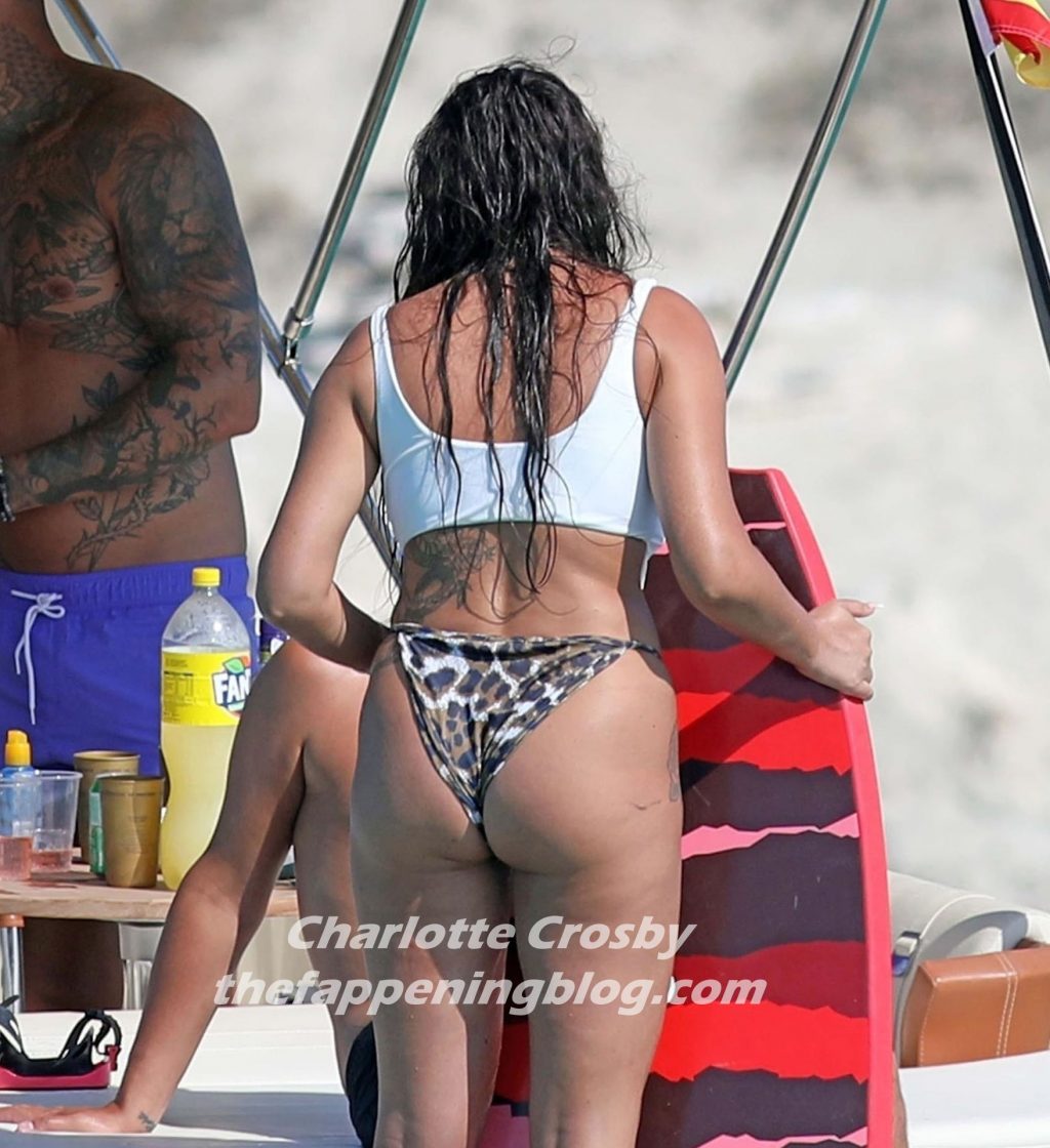 Llevando sus braguitas de bikini con estampado animal, la estrella de Geordie Shore Charlotte Crosby eleva la temperatura en un día ya sofocante de vacaciones en Formentera, España, 03/08/2020.