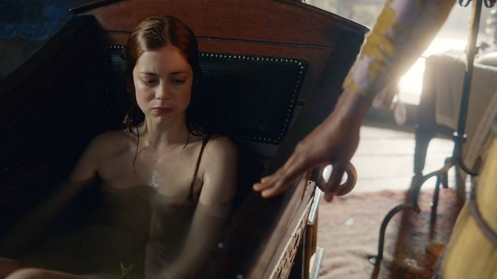 Charlotte Hope se desnuda en “La Princesa Española” (2019) Temporada 1 Episodio 1 (s01e01). Charlotte está sentada en una bañera, casi mostrando sus tetas cuando se sumerge bajo el agua y luego se sienta. Podemos ver su trasero y sus pequeñas tetas cuando se levanta.