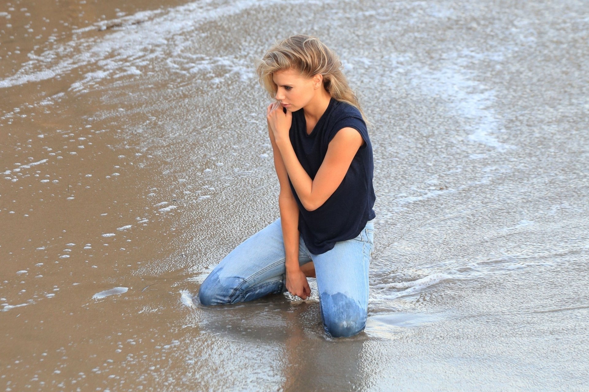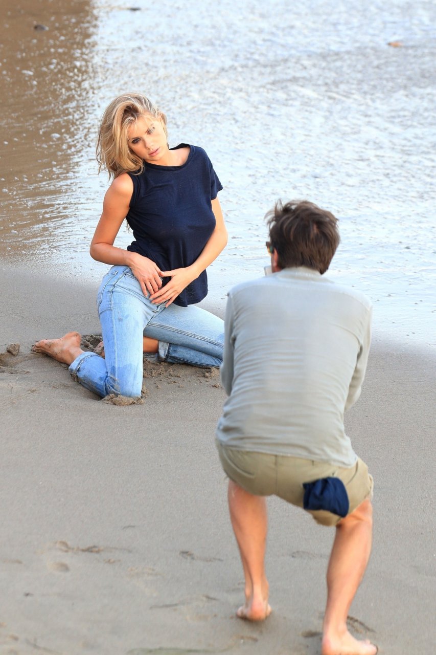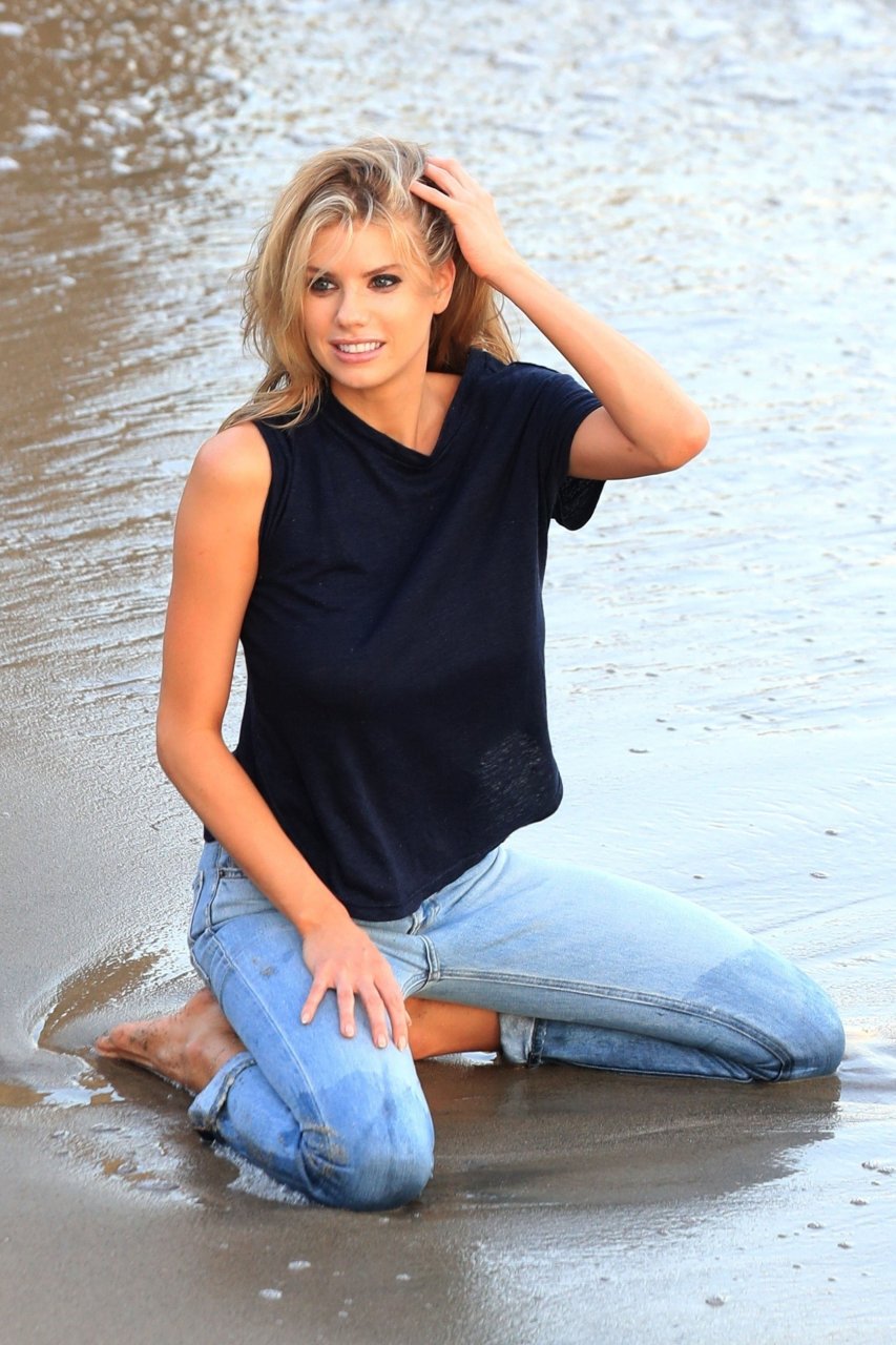 Charlotte McKinney (24) se sumerge y se ensucia para una sesión de fotos en el océano, 07/06/2018. La sensual modelo es vista mientras realiza varios cambios de vestuario a lo largo de las famosas playas de Malibu. Ella muestra su físico en forma mientras se adentra en el agua.